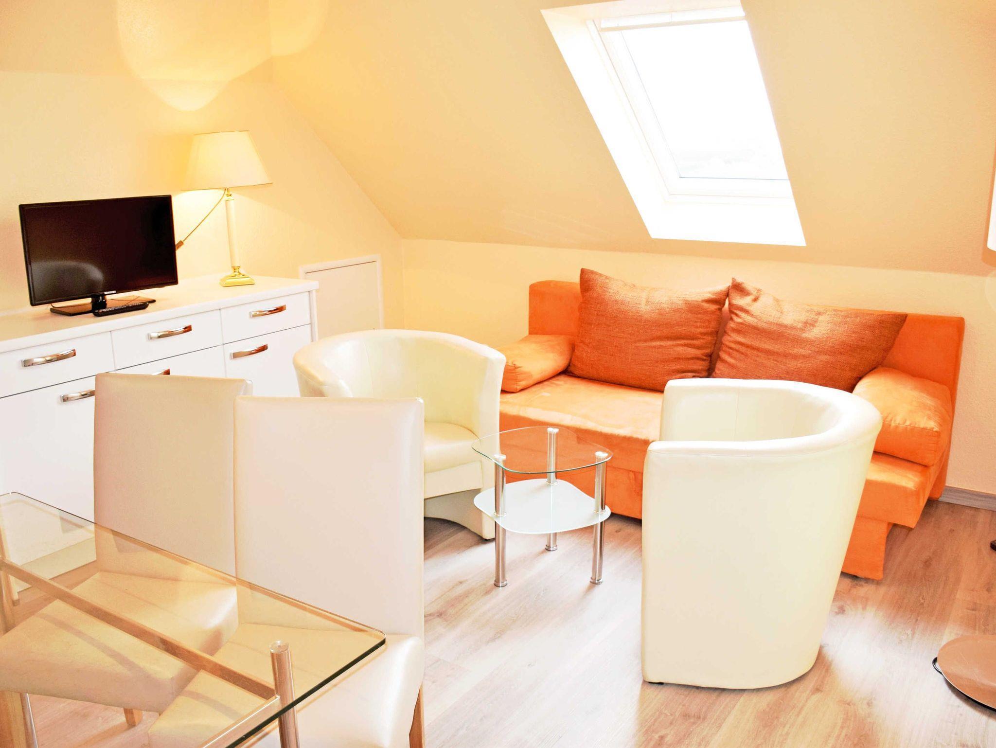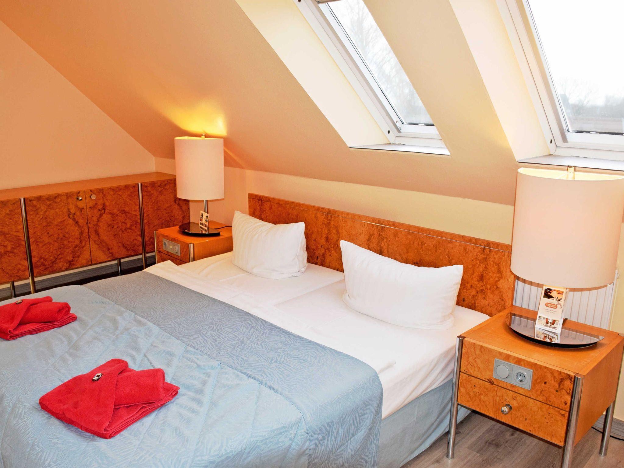Die Ferienwohnung liegt im Hotelgebäude und ist ca. 51 qm groß. Sie hat Platz für maximal 4 Erwachsene und wurde modern und hochwertig eingerichtet. Im Wohnraum befinden sich eine bequeme Sitzcouch mit Tisch und ein modernes Flachbild-TV-Gerät. Hier steht auch ein Esstisch mit Stühlen. Die moderne Küchenzeile ist mit einem Herd, Mikrowelle, Wasserkocher, Kaffeemaschine, Toaster und Kühlschrank komplett ausgestattet.