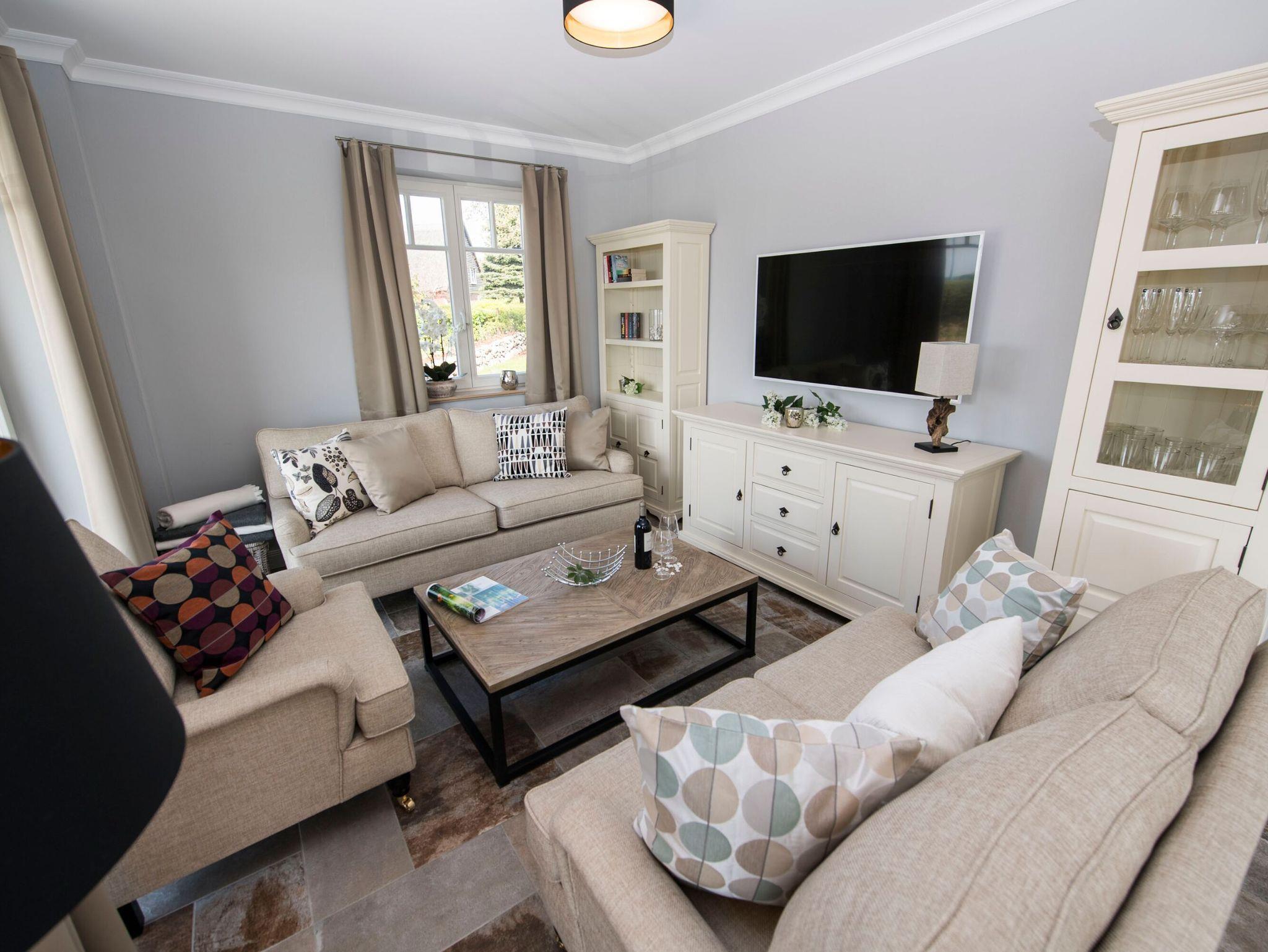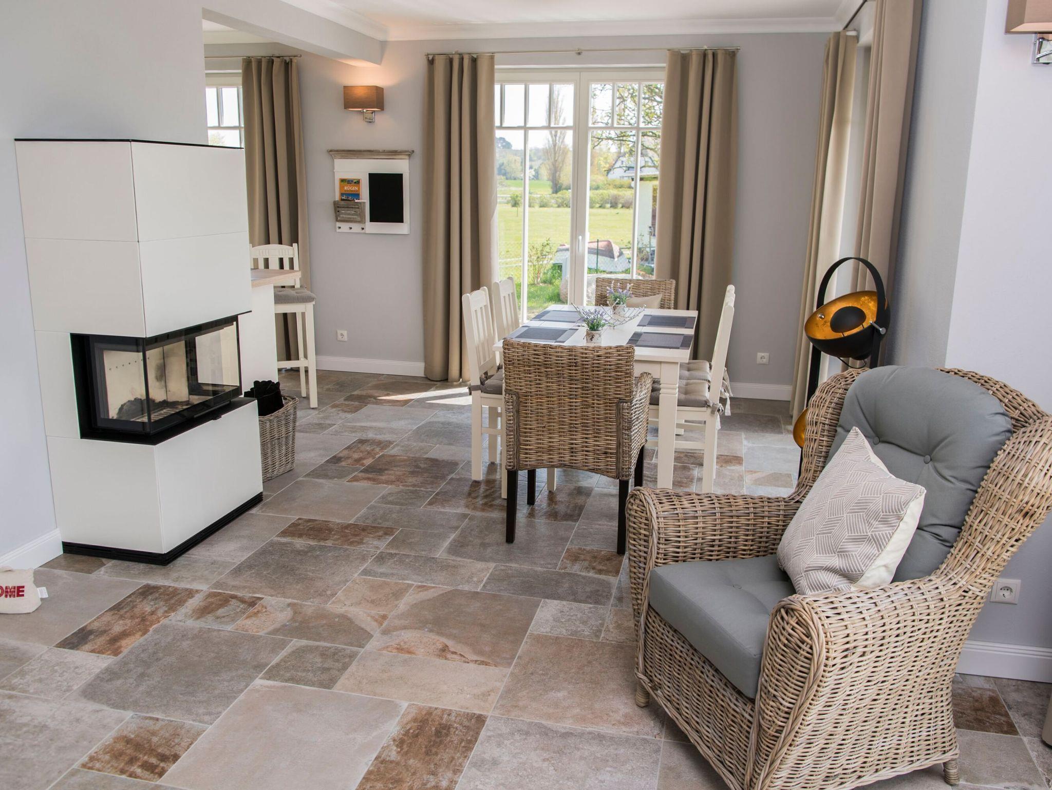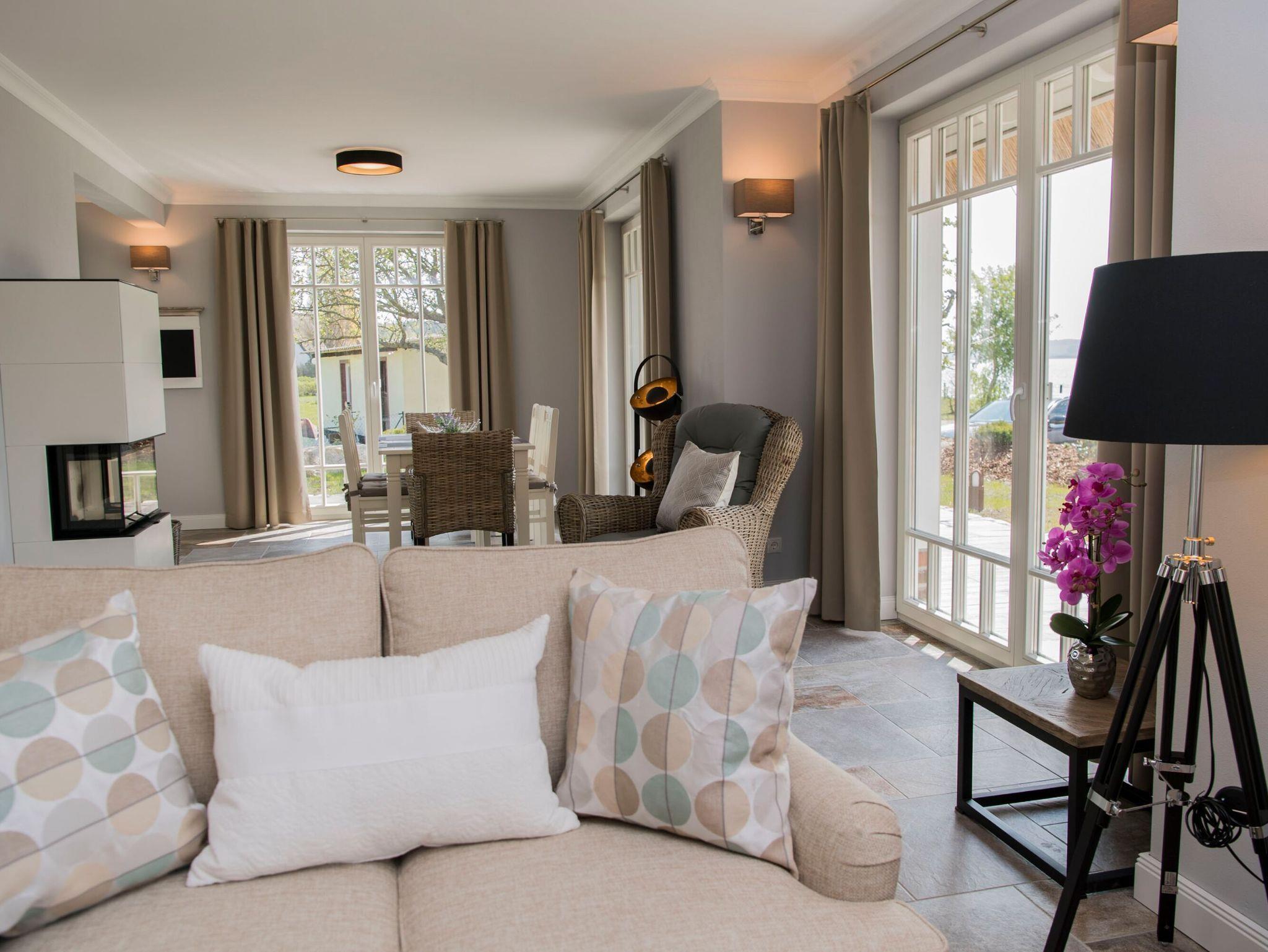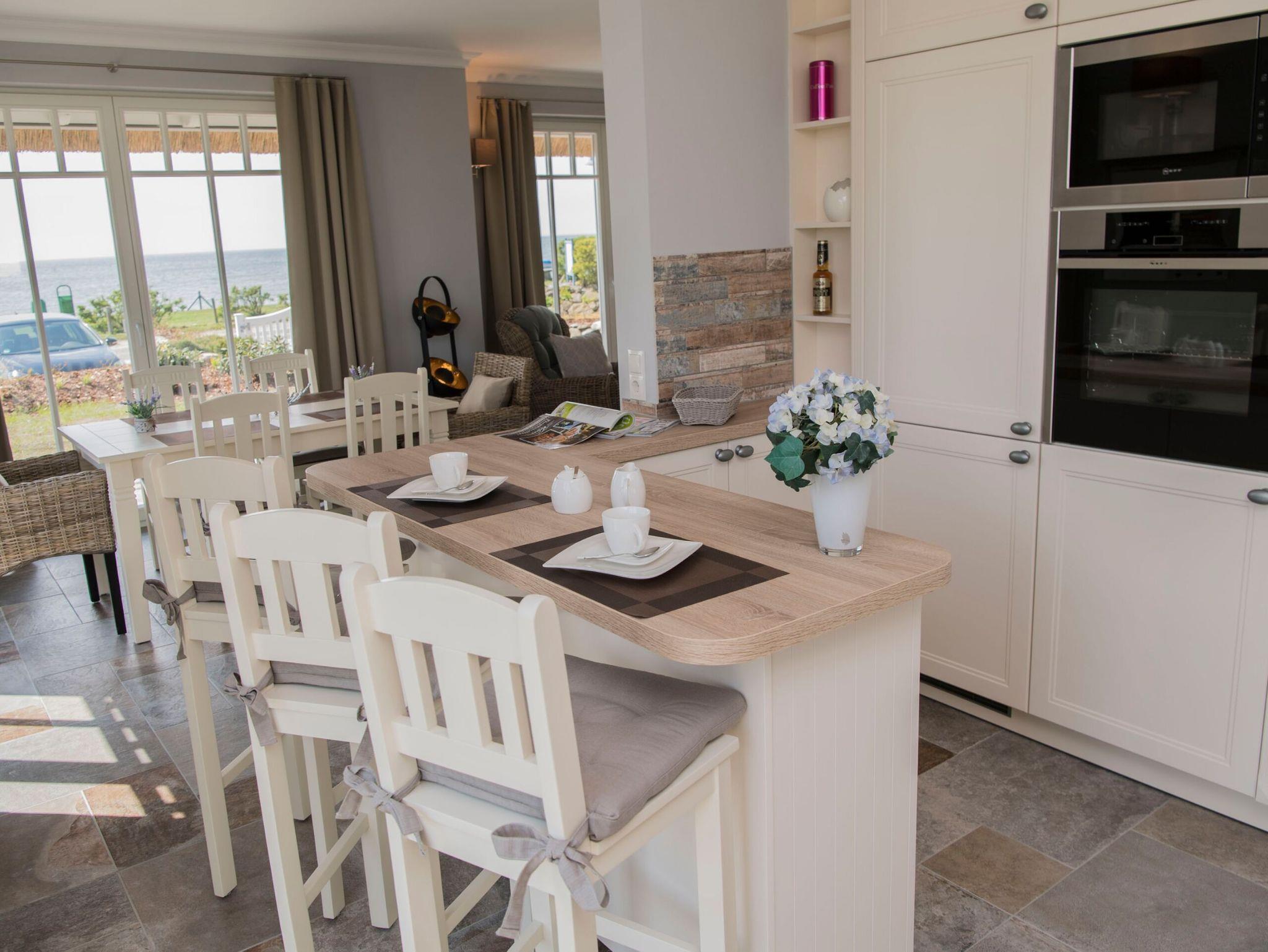 Der großzügige Wohnbereich mit Esstisch für sechs Personen und einer angrenzenden, hochwertigen Küche befindet sich im Erdgeschoss. Das Wohnzimmer ist mit einer gemütlichen Sitzecke und einem Flachbild-TV ausgestattet. In der kühleren Jahreszeit verbreitet ein prasselndes Kaminfeuer die besondere Gemütlichkeit. Zwei gemütliche Sitzgelegenheiten, platziert vor einer der großen Glasfronten laden zum Verweilen und Entspannen ein und bieten einen ungehinderten Blick auf die Weite der Hagenschen Wieck und die Zickerschen Berge.