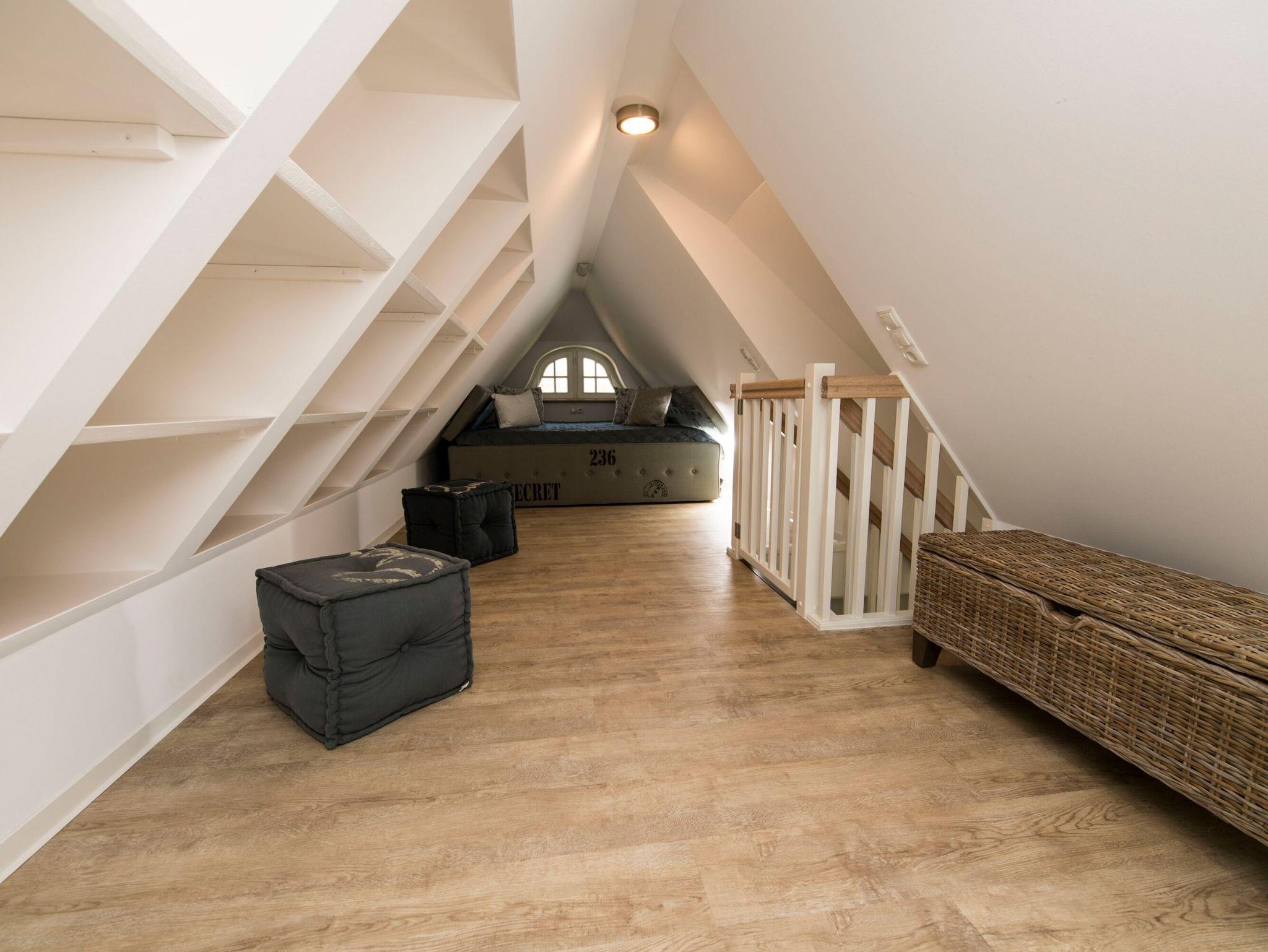Die dritte Schlafgelegenheit mit einem einzeln stehenden Kajütenbett (ca. 1,60 x 2 m) befindet sich im ausgebauten Spitzboden des Hauses.