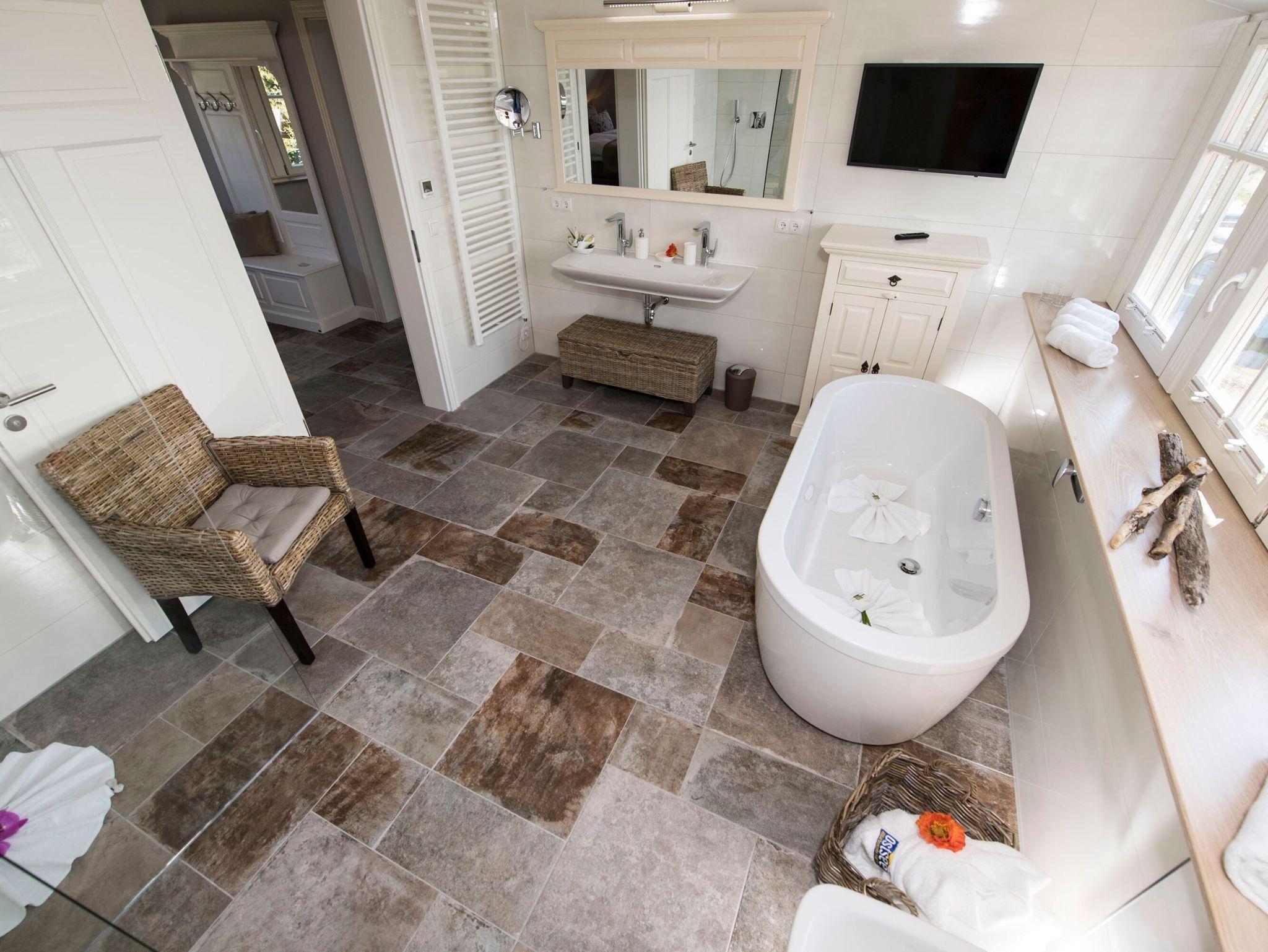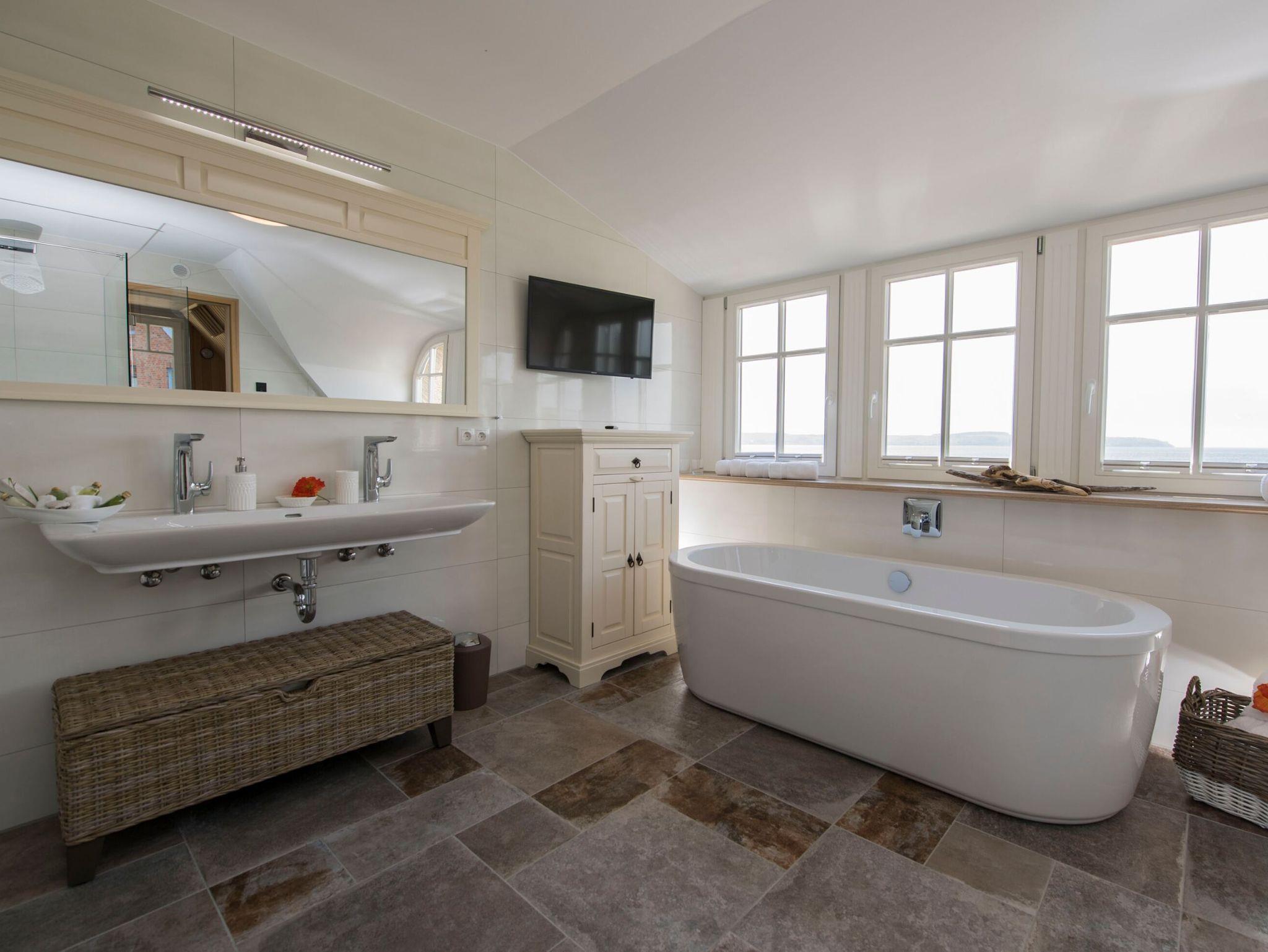 Das Highlight auf dieser Etage ist das zweite Bad dieses Hauses. Von der Badewanne aus bietet sich ein atemberaubender Blick auf die Hagensche Wieck. Hier ist Entspannung garantiert ? unabhängig vom Wechsel der Jahreszeiten. Eine große Walk-In-Dusche, ein Waschtisch, ein WC, ein Bidet sowie ein weiterer Flachbild-TV machen aus diesem Raum eine wahre Wellness-Oase. Eine Sauna, ebenfalls mit herrlichem Ausblick rundet den exklusiven Eindruck ab.