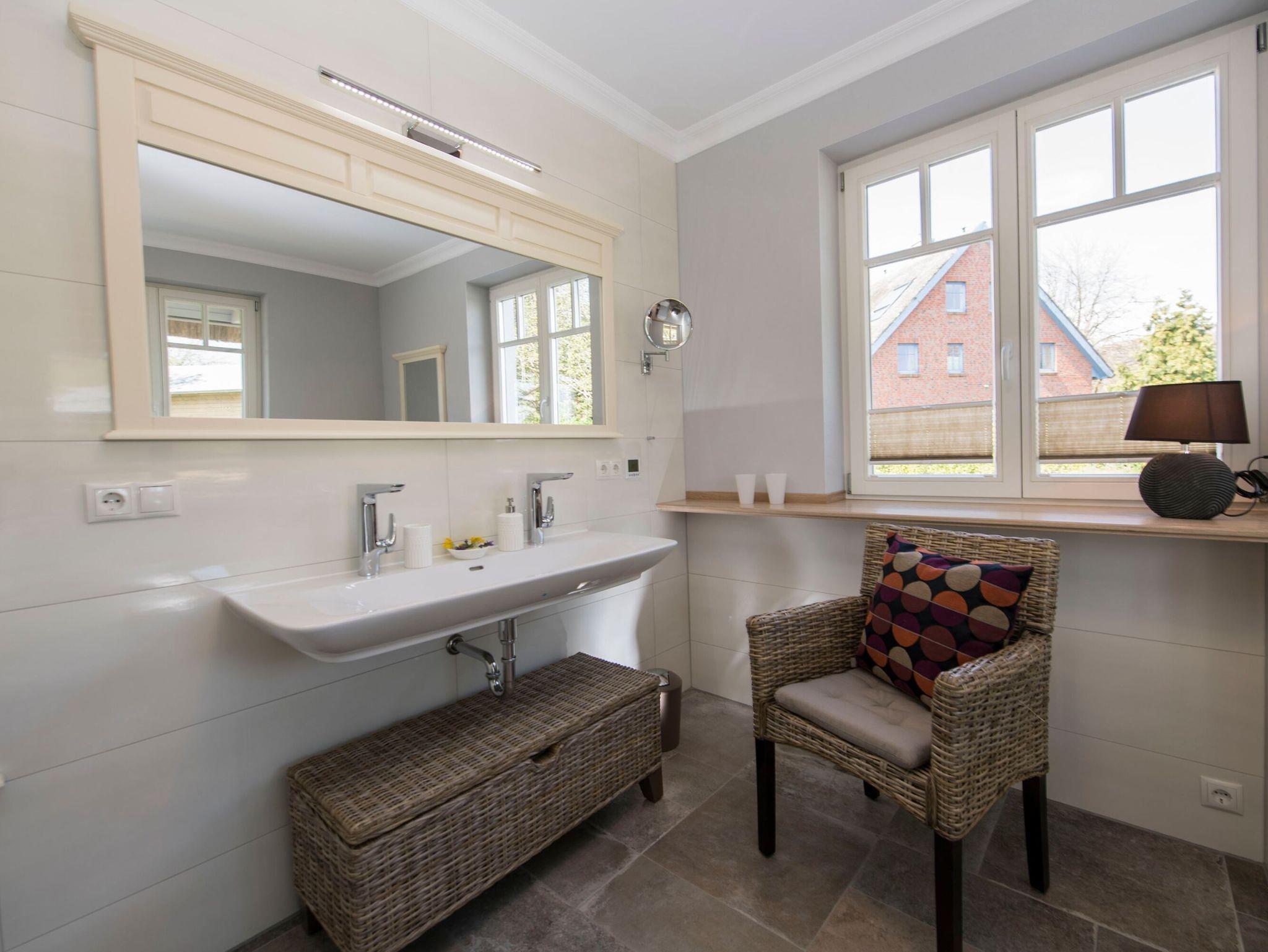 Eines der modernen Bäder ist ebenfalls im Erdgeschoss zu finden. Es verfügt über einen Waschtisch, eine Dusche und ein WC. Eine Waschmaschine ist ebenfalls vorhanden.