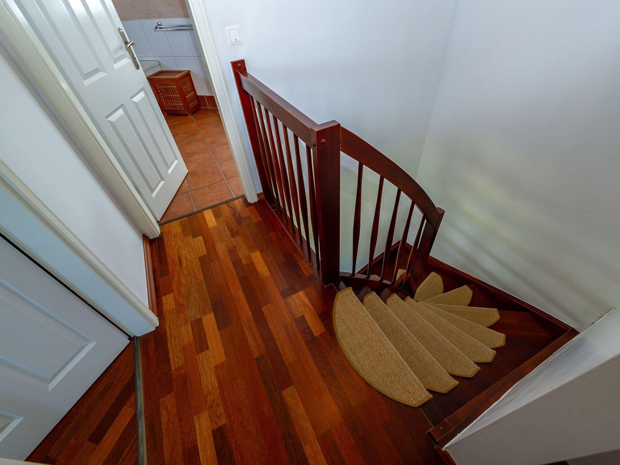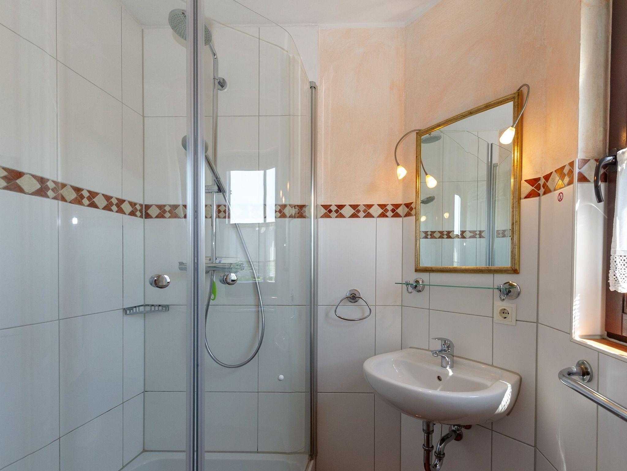 Über eine Treppe gelangen Sie in das Obergeschoss. Dort finden Sie drei Schlafzimmer, zwei mit einem Doppelbett und das andere mit einem Einzelbett, welches man zu einem Doppelbett umbauen kann und einem Schreibtisch, sowie einen weiteren Fernseher (nur öffentlich rechtliche Programme). Ein weiteres Duschbad mit Badewanne und Bidet befindet sich ebenfalls im Obergeschoss.