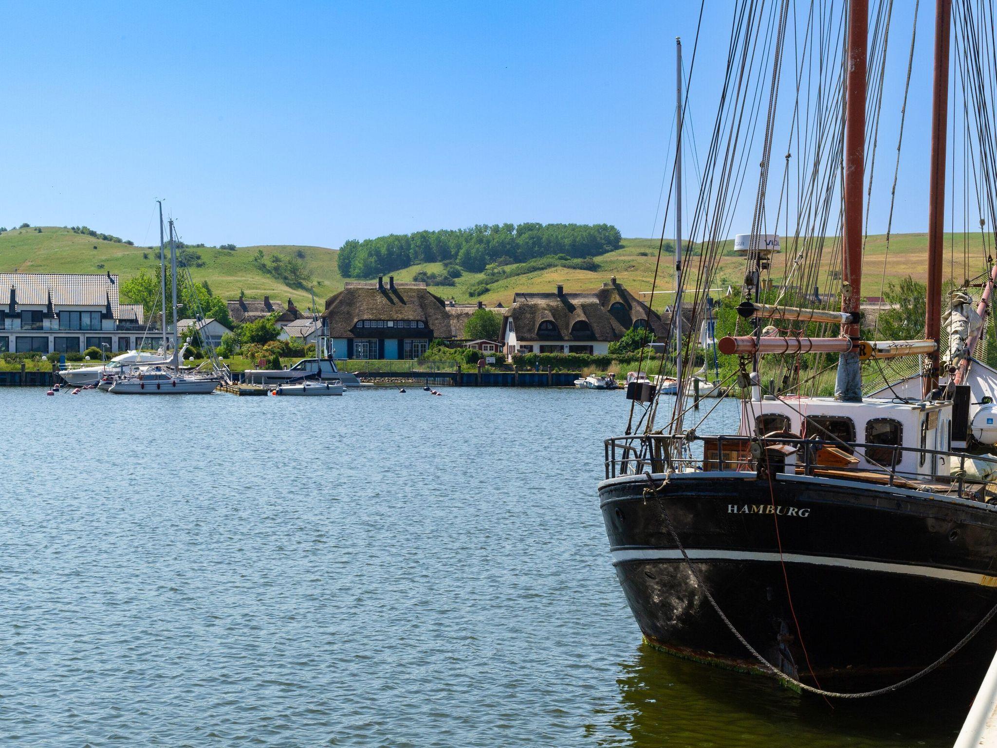 Die großzügige umlaufende Terrasse[nbsp] mit Morgen- und Abendsonne bietet eine traumhafte Aussicht auf den Hafen von Gager und die Hagensche Wiek. Aus dem Strandkorb, sowie der Sitzgruppe oder von den Liegen auf der Terrasse kann der Blick in die Ferne schweifen.