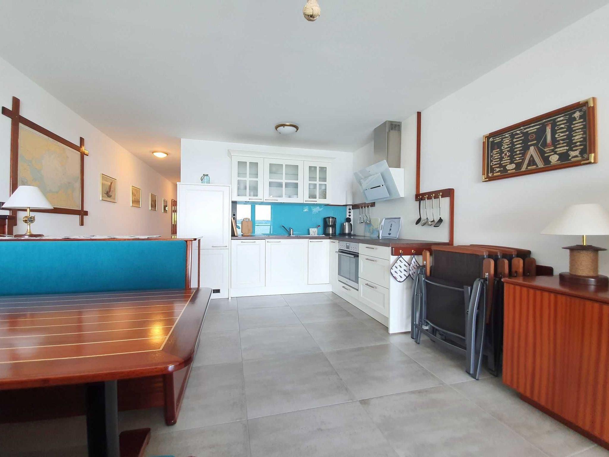 Der Wohnbereich mit seinen bodentiefen Fenstern und Zugang zur Terrasse mit direktem Wasserblick ist mit einer Couch und Flachbild TV eingerichtet. Die offene Küche mit Essbereich ist mit einem 4 Felder Induktionserd und Backofen, Kühlschrank mit Gefrierfach, Kaffeemaschine, Toaster und reichlich Küchenutensilien bestens ausgestattet.