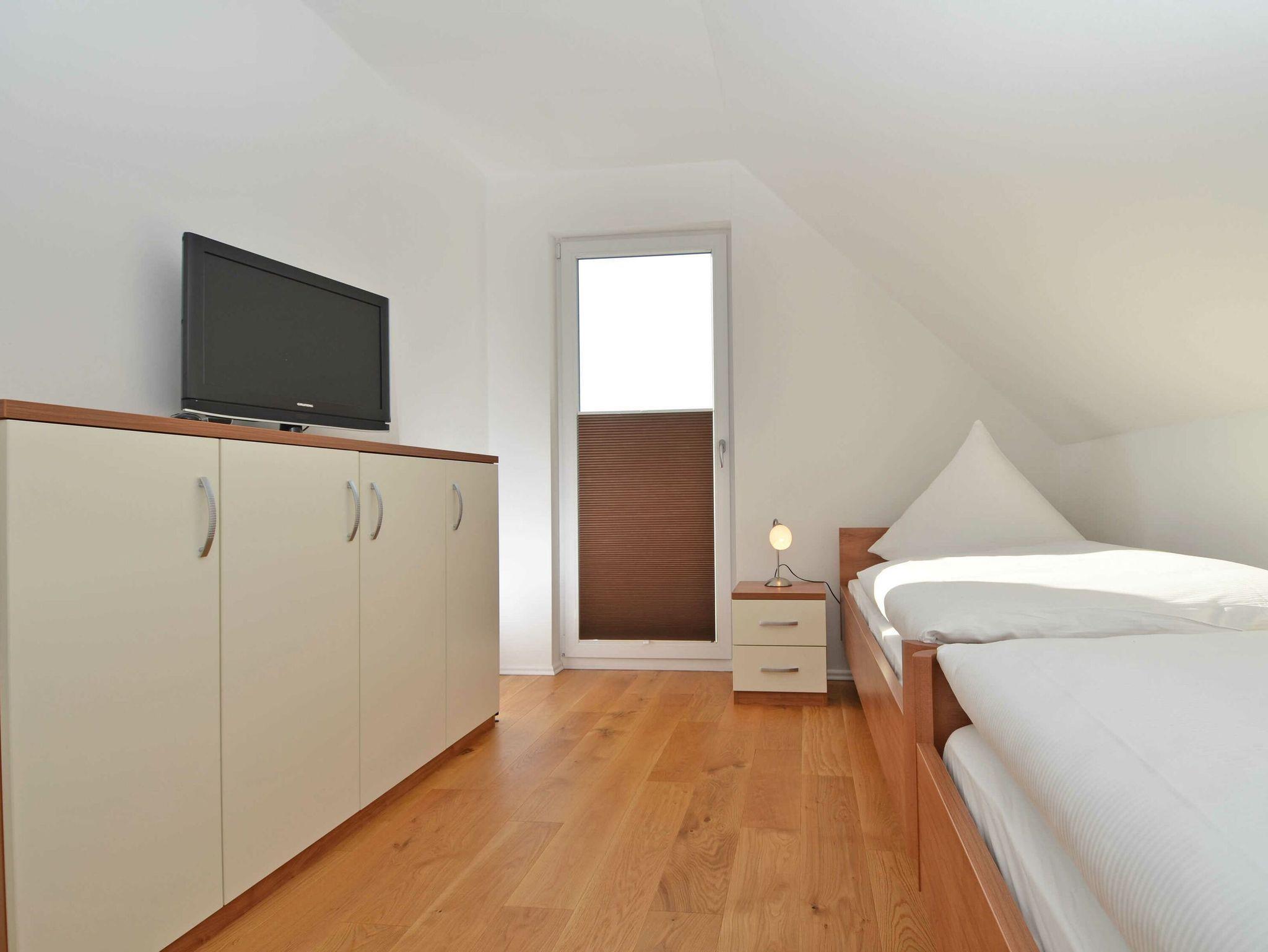 Eines der Schlafzimmer verfügt über ein Doppelbett; die zwei weiteren Schlafzimmer je über zwei hintereinander angeordnete Einzelbetten und einen Zugang auf den ca. 3,5 m² großen Balkon zur Abendsonne.