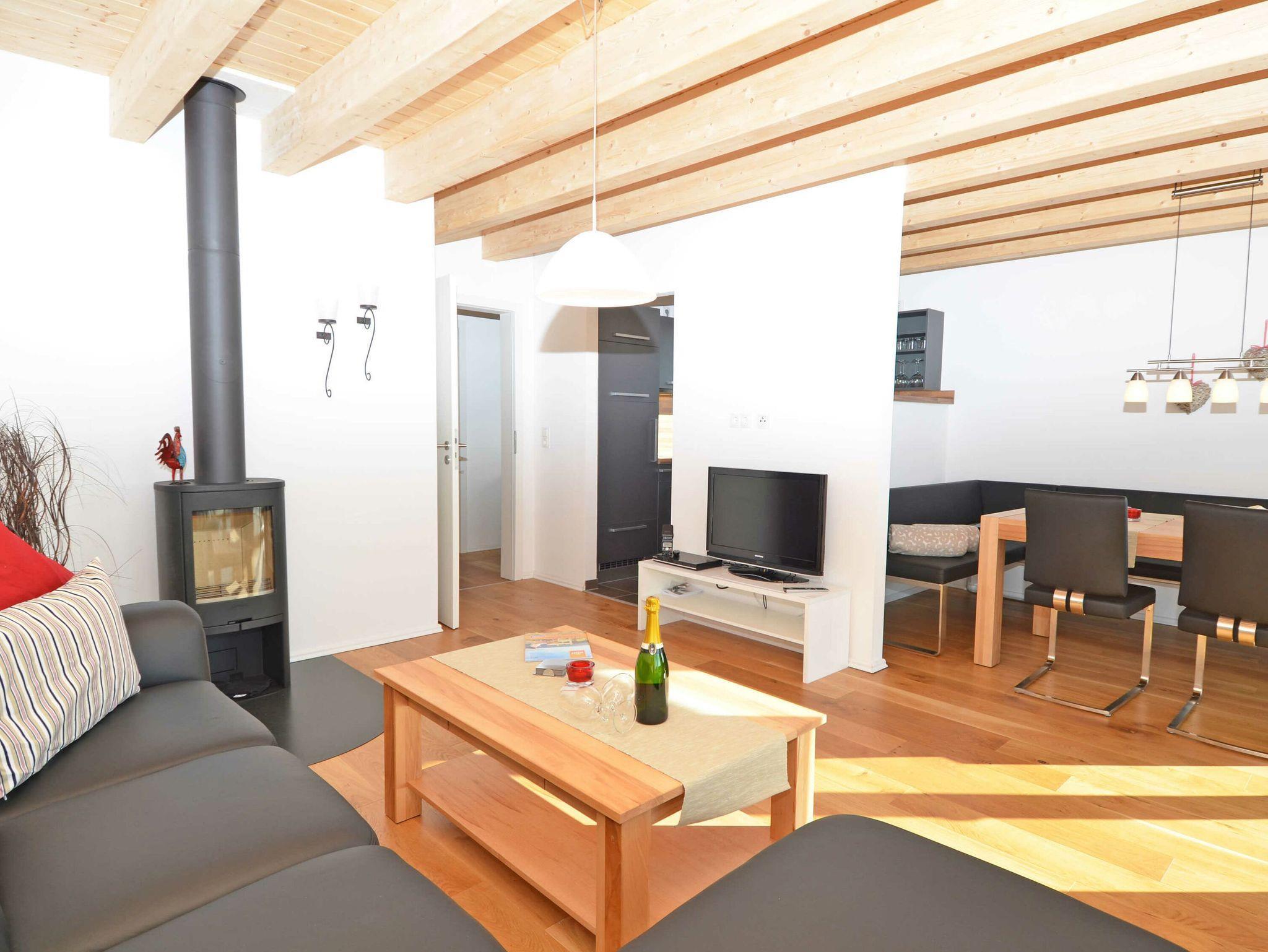 Im Erdgeschoß befindet sich das große Wohnzimmer mit der optisch vom Wohnbereich getrennten Einbauküche. Im Wohn-/Essbereich gibt es einen großen Esstisch ?in der Koje? für 8 Personen, eine großzügige Couchecke mit einem Kaminofen (das Holz ist bitte selbst mitzubringen), einen Flachbild-TV mit DVD-Player und eine Stereoanlage mit CD-Player.