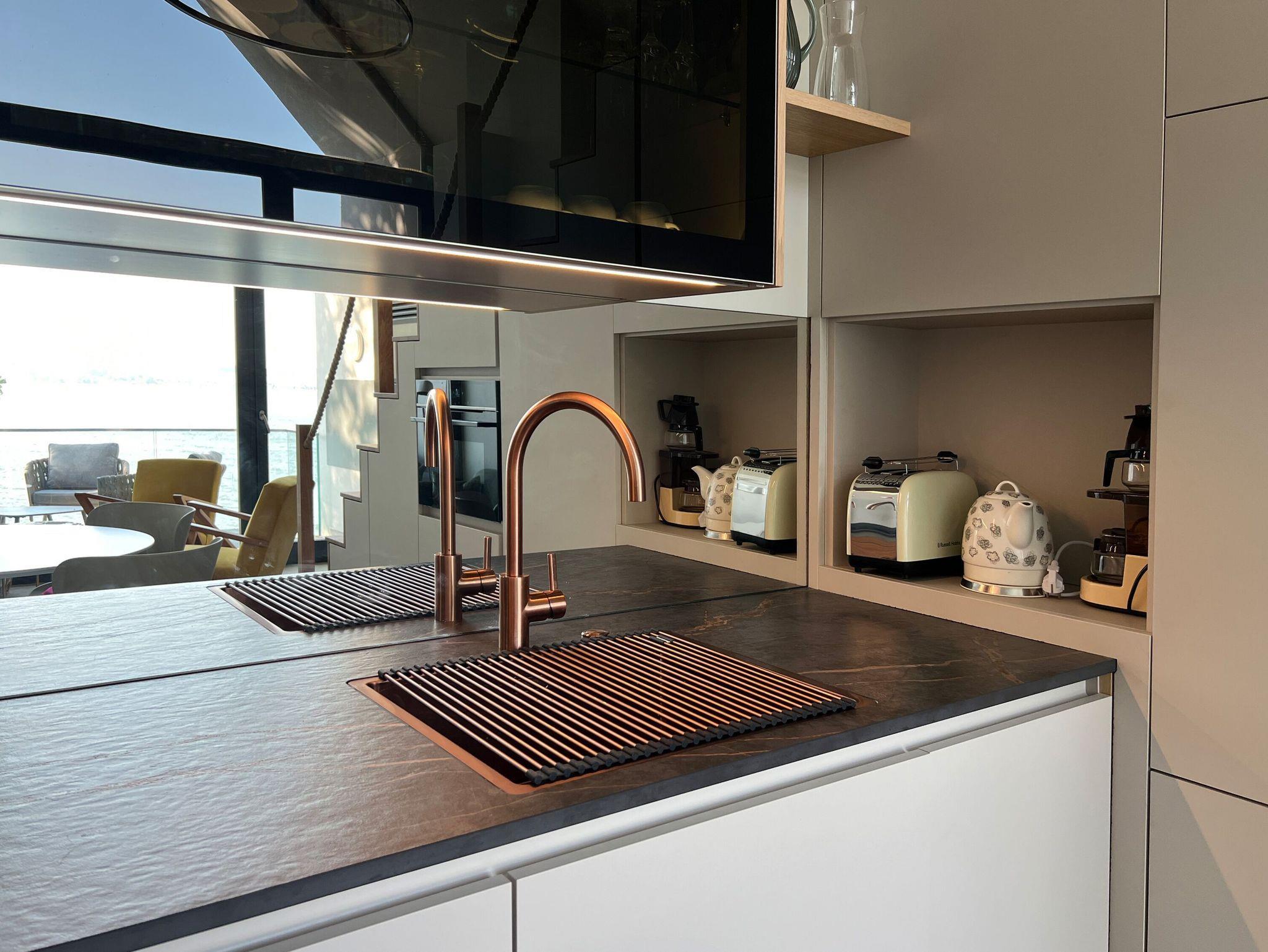 Ihr Zuhause auf Zeit besteht aus einem kombinierten Wohn-/Esszimmer mit integrierter Küche, einem Schlafzimmer mit einem 1,80m breiten Boxspringbett, einer offenen, abdunkelbaren Galerie mit ausklappbarem 1,60m breitem Boxspring-Schlafsofa und Schreibtisch, sowie einem Badezimmer mit Dusche/WC und Sauna, einem separaten Schrankzimmer und einer Terrasse mit Lounge-Möbeln. Sie erreichen die Wohnung im Obergeschoss des Hauses über ein paar Stufen direkt von der Straße aus. Die moderne Einbauküche ist mit allem ausgestattet, damit Sie sich bequem selbst bekochen können, Wellenrauschen inklusive.