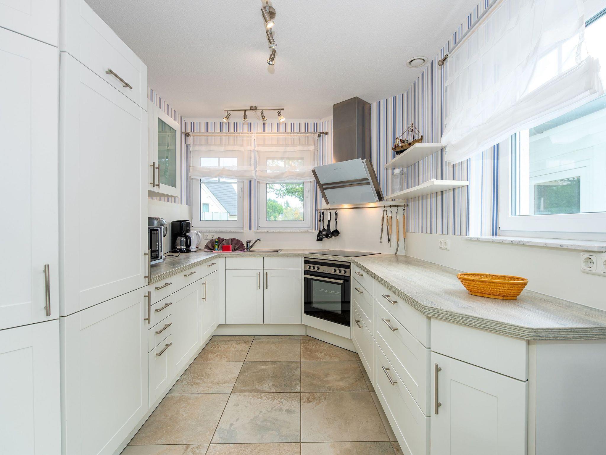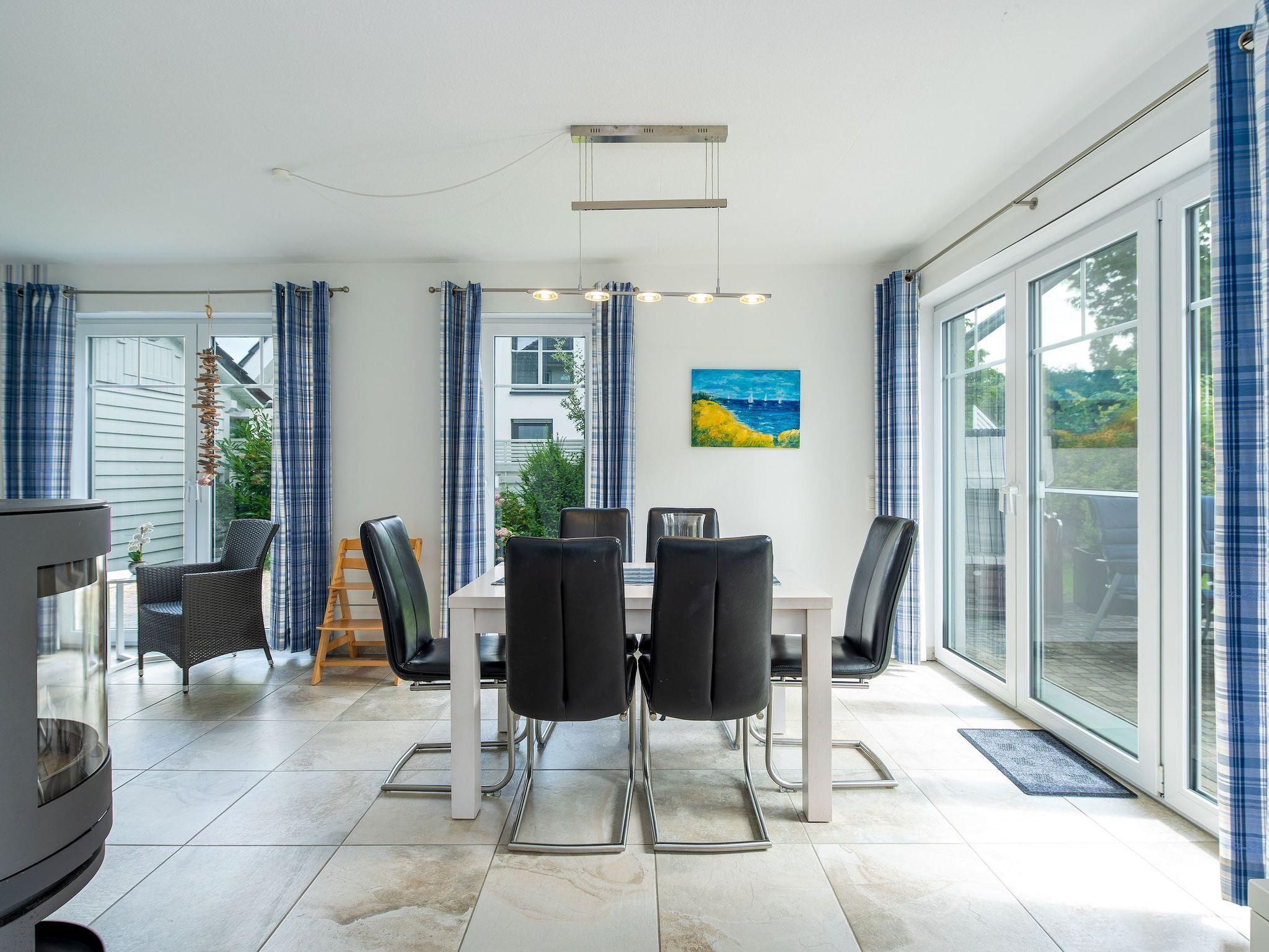 Das Haus erstreckt sich über zwei Etagen und empfängt Sie mit einem großzügigen, hellen Eingangsbereich, Garderobe, Abstellraum und Gäste-WC. Über eine Glastür gelangen Sie in den offenen Wohn- und Kochbereich. Die große, U-förmige Küche ist voll ausgestattet ? vom Cerankochfeld über Geschirrspüler bis zur Kaffeemaschine ? und lädt zum gemeinsamen Kochen ein.