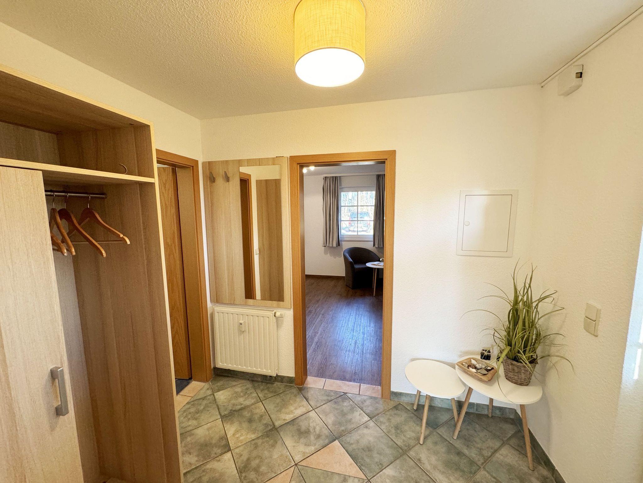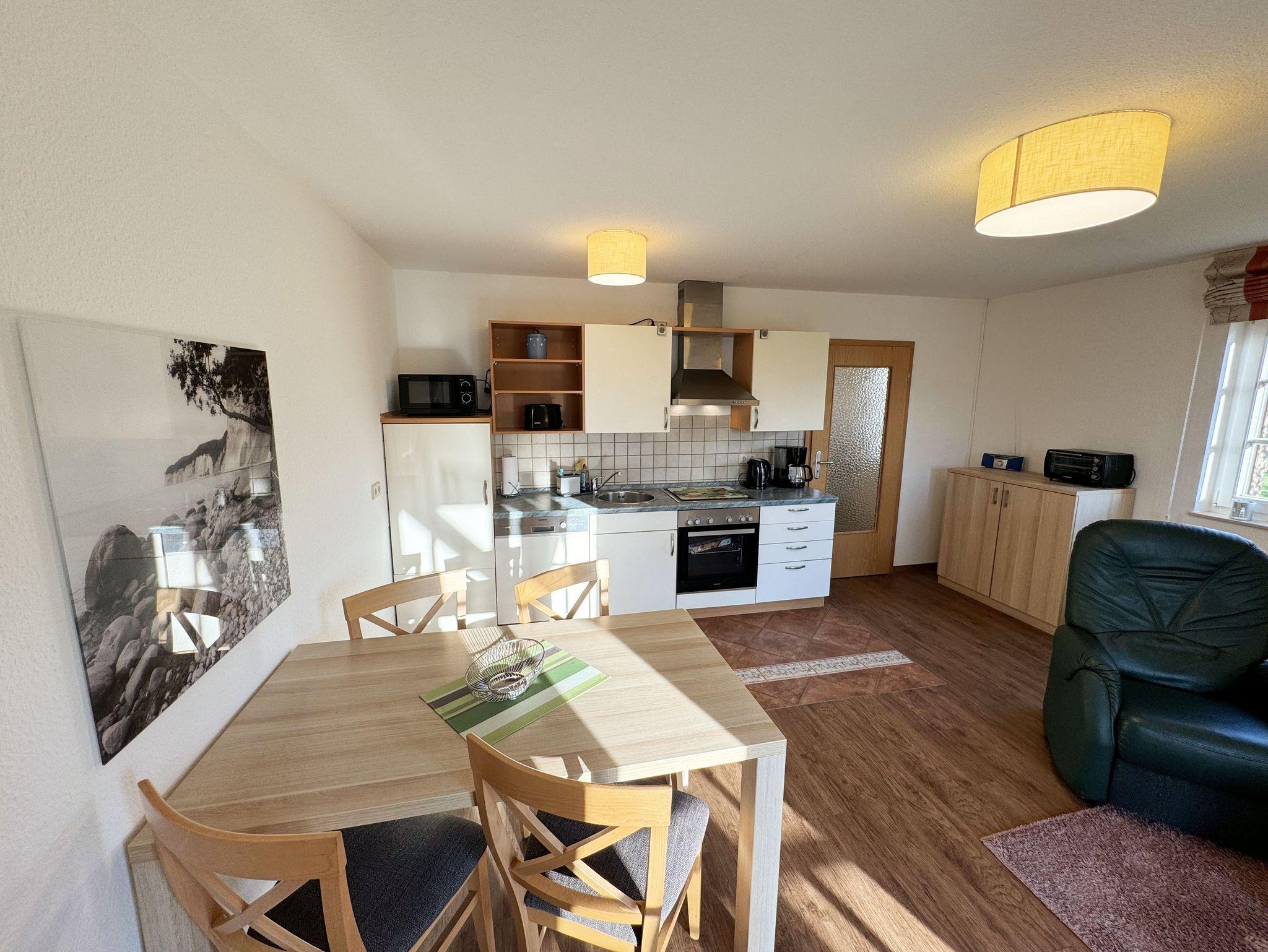 Die Zwei-Zimmer-Ferienwohnung Nr. 6 liegt an der Stirnseite des Hauses im Erdgeschoss und verfügt über einen separaten Eingang. Die Terrassenwohnung ist eine Nichtraucherwohnung. Sie wohnen hier auf insgesamt 51 qm mit max. 4 Personen. Sie verfügt über einen modernen Schlafraum mit einem Doppelbett mit Komfortmatratzen (2 x 0,90 m x 2,00 m), Nachttischkonsolen, Kleiderschrank und ist mit Vinylboden ausgelegt worden. Der Wohn- und Essbereich ist gemütlich eingerichtet. Neben einem Schlafsofa (Aufbettungsmöglichkeit für die 3./4. Person, 1,50m x 1,90m) finden Sie hier auch einen Couchtisch, Flachbild-TV sowie einen Essplatz mit vier Stühlen. Die Küchenzeile ist komplett eingerichtet mit Spülmaschine, Ceran-Kochfeld, Backofen, Mikrowelle, Kühlschrank mit 3 ***Gefrierfach, Toaster, Wasserkocher, Kaffeemaschine sowie diverse Küchenutensilien, die Sie zur Selbstverpflegung benötigen. Vom Wohnbereich gelangen Sie auf die bestuhlte und überdachte Terrasse. Das geflieste Badezimmer verfügt über eine Dusche, einen Waschtisch, einen Fön und ein WC. Haustiere sind nicht erlaubt. Die Internetnutzung (WLAN) ist für Sie inklusive. Ein PKW-Stellplatz Nr. 6 steht Ihnen vor dem Haus zur Verfügung. Auf dem Grundstück können Sie Ihre Fahrräder abstellen. Die Erstausstattung eines Wäschepaketes (komplette Bettwäsche, 1 Duschhandtuch, 1 kleines Handtuch) können Sie bis 14 Tage vor Anreise gegen einen Aufpreis dazu buchen oder durch eigene ergänzen. Ab 2 gebuchten Paketen erhalten Sie einmalig 1 Geschirrhandtuch und 1 Duschvorleger hinzu.