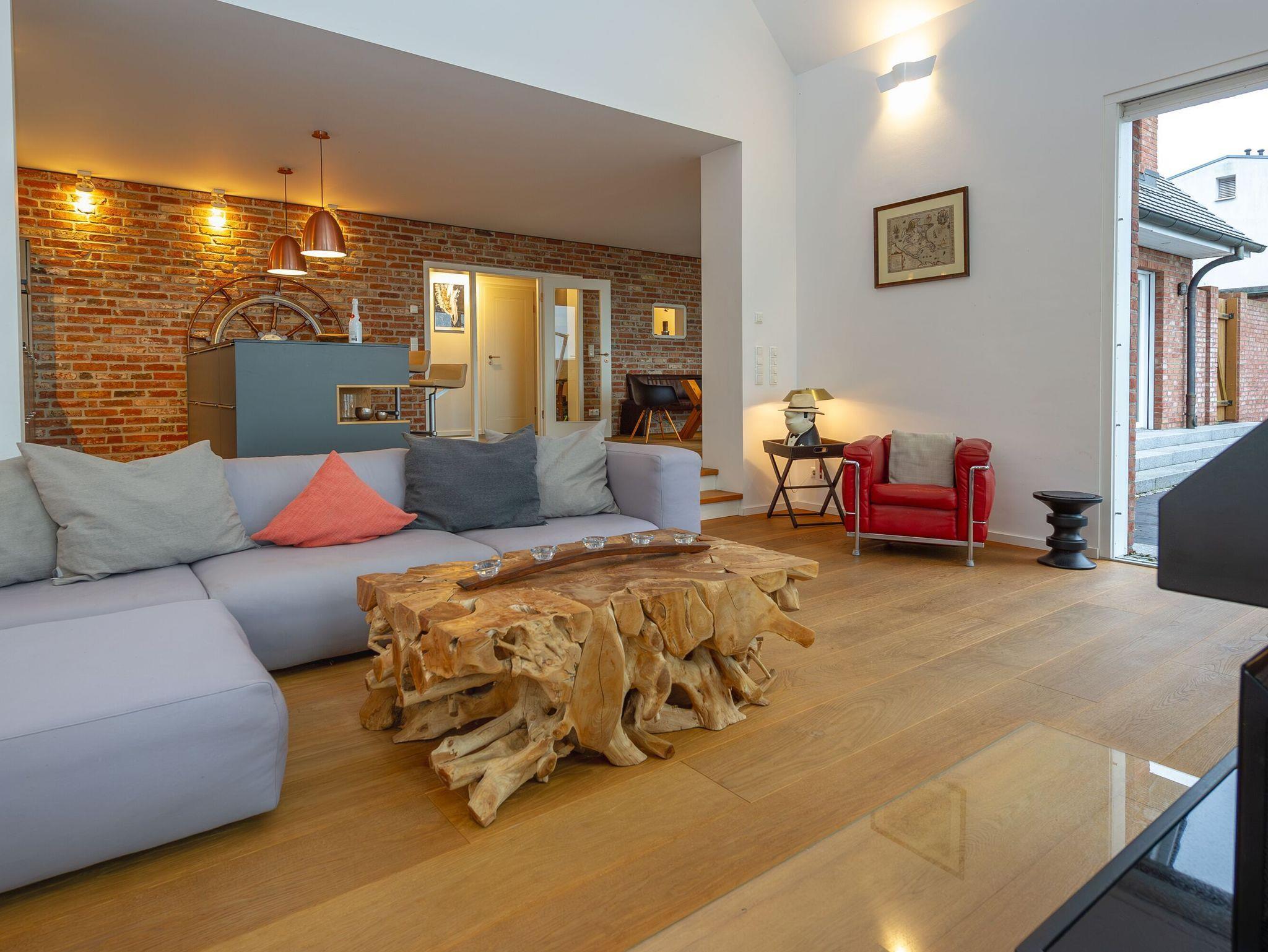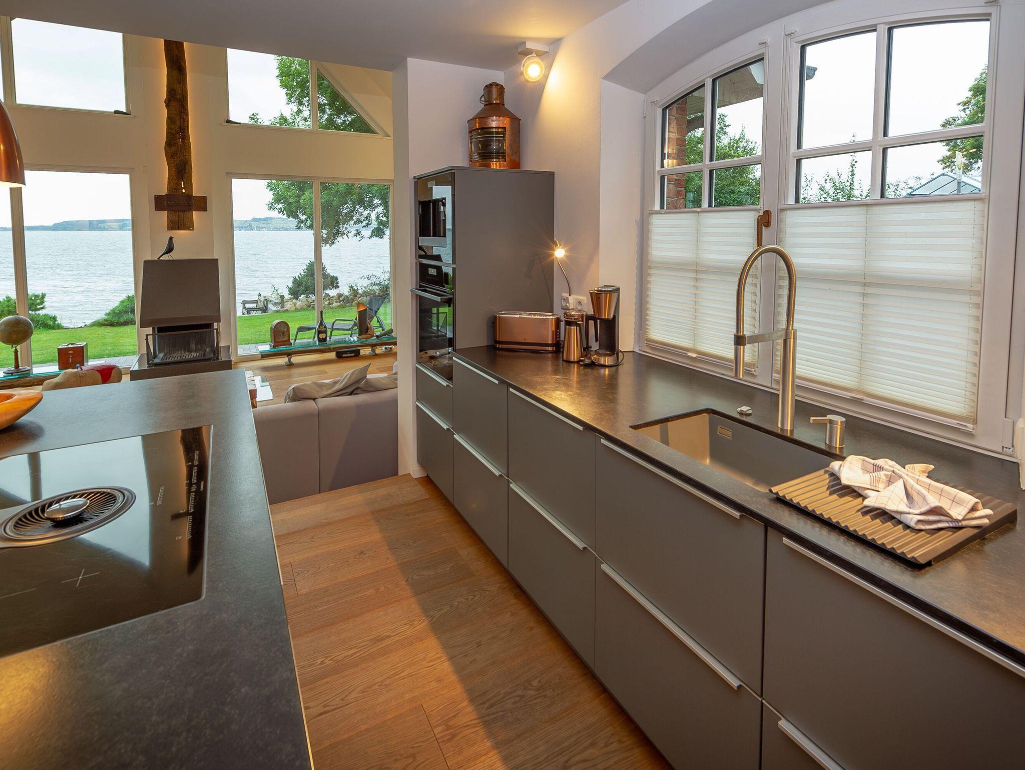 Im Erdgeschoss dominiert der offene Wohnbereich mit amerikanischer Küche, Esstisch, bequemen Sitzmöbeln, stilvollen Deko-Objekten, moderner Unterhaltungstechnik und einem Kaminofen für die besonders romantischen Stunden. Panoramafenster eröffnen Ihnen einen tollen Blick aufs Wasser und den direkten Zugang zur Terrasse und zum Garten. Die Terrassenmöbel stehen saisonal - in der Regel von Mai bis Ende September - zur Verfügung.