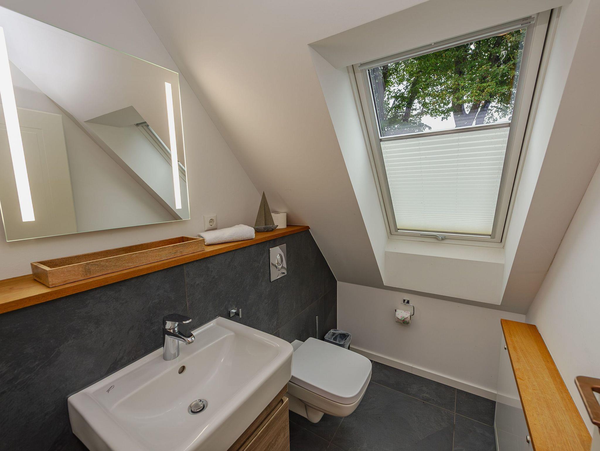 Besonders angenehm: Damit es auch bei voller Hütte immer entspannt zugeht, gibt es im Obergeschoss zusätzlich zum großen Badezimmer mit bodentiefer Dusche, Eckbadewanne, WC und Waschtisch ein weiteres Gäste-WC.