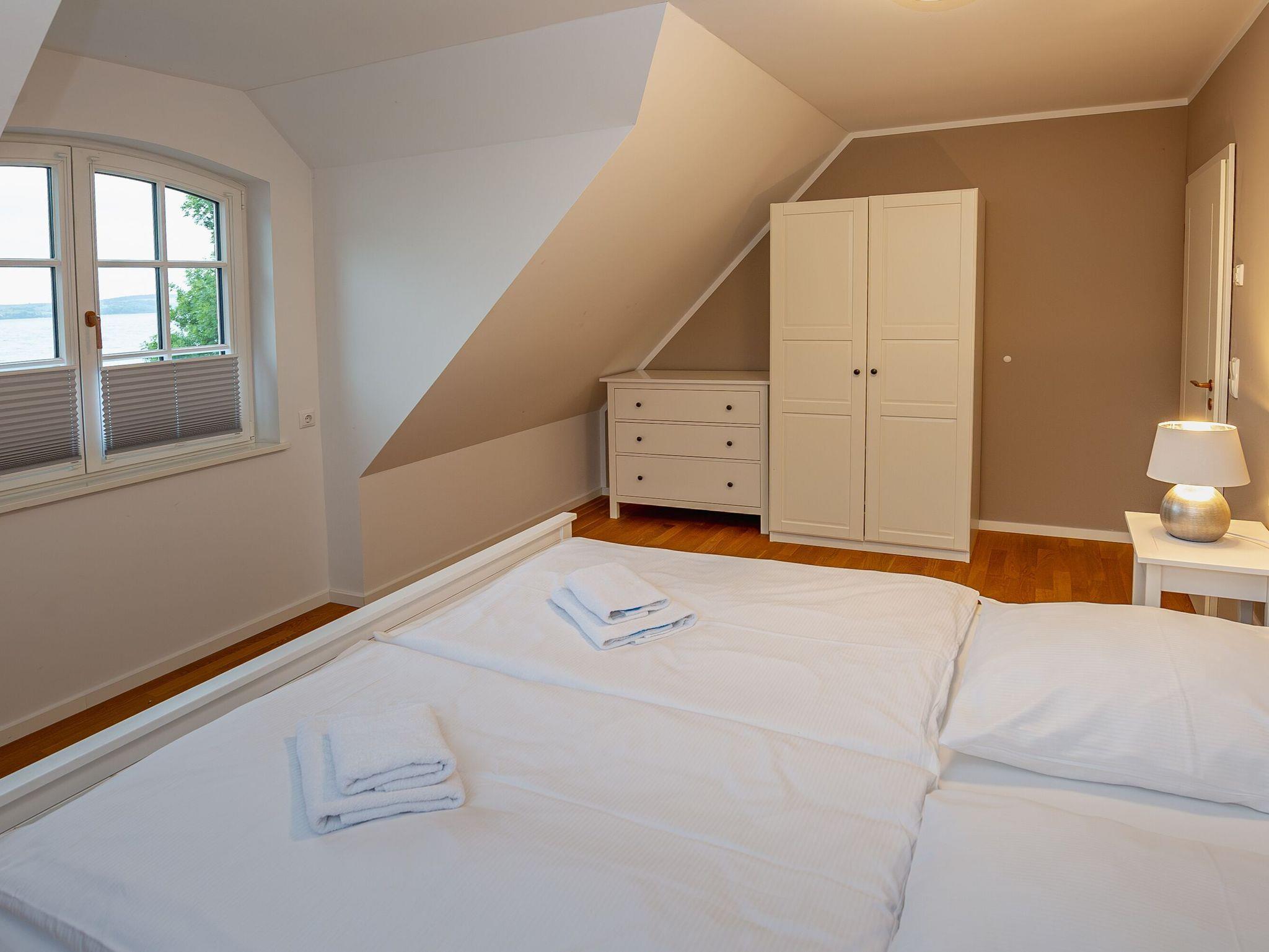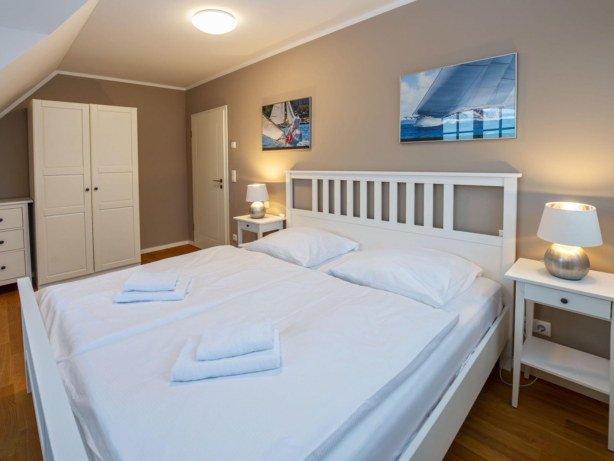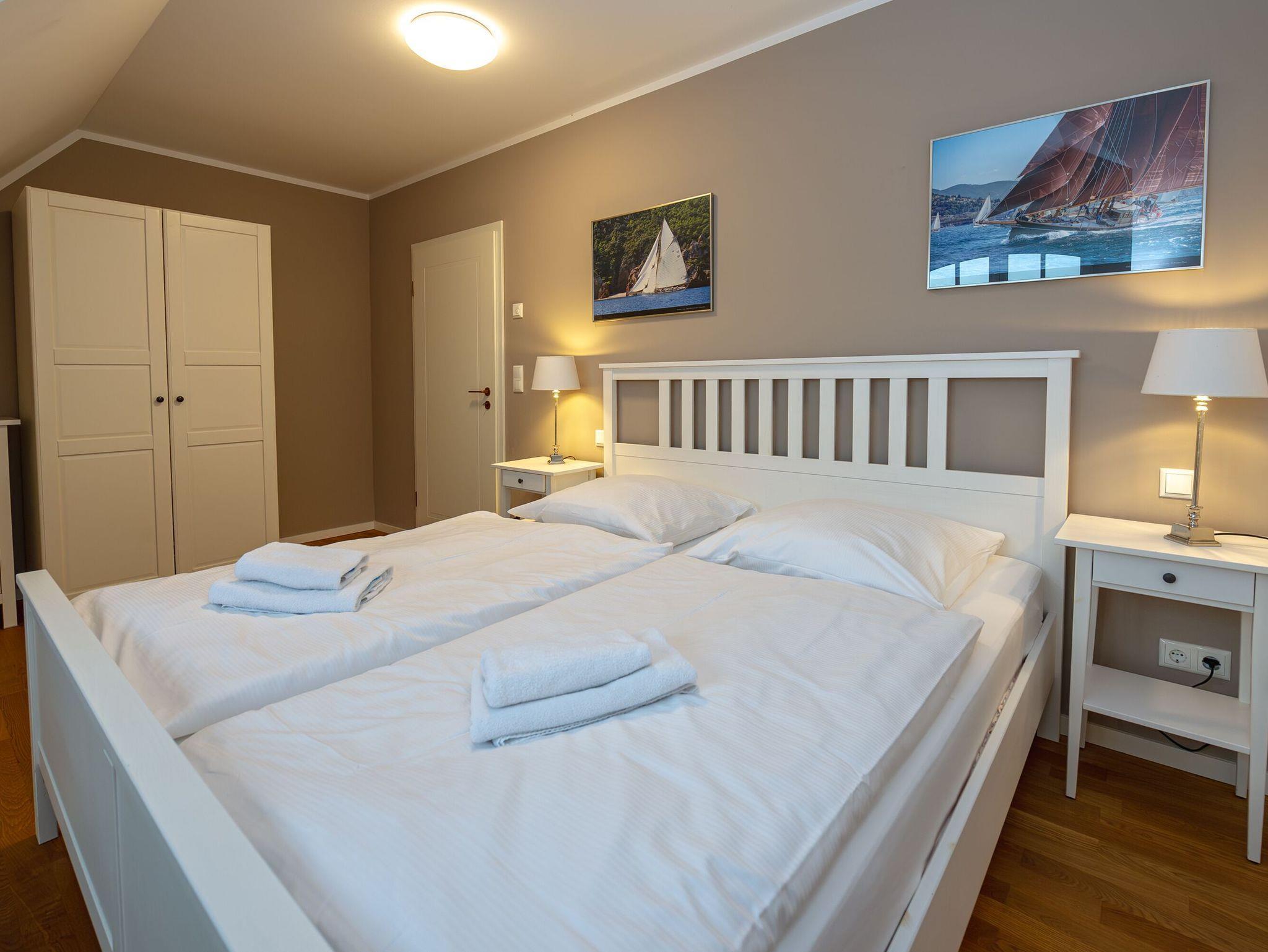 Ein paar Treppenstufen höher versprechen im Obergeschoss drei Schlafzimmer mit bequemen Doppelbetten süße Träume. Selbstverständlich wurde auch an genügend Stauraum für Ihre Urlaubsgarderobe gedacht. Das größte der Schlafzimmer bietet durch ein stilvolles Bullauge einen besonderen Blick auf den Wohnbereich und den Bodden.