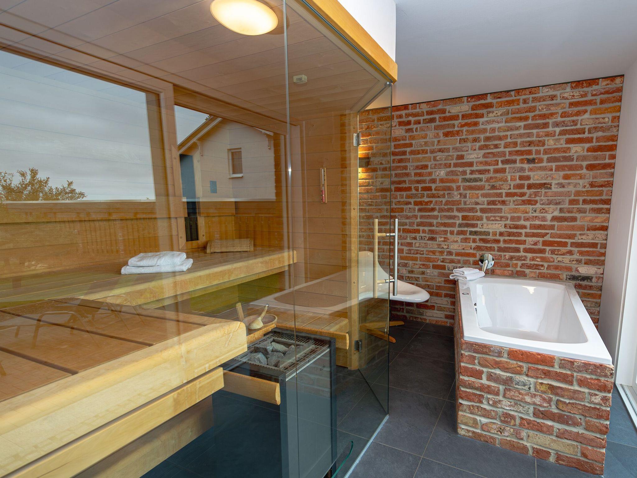 Ein ganz besonderes Highlight im Erdgeschoss ist Ihr privater Wellnessbereich, wo eine Finnische Sauna, eine Whirlwanne und eine Dusche für wohlige Entspannung sorgen, wann immer Sie es wünschen. Boddenblick auch hier inklusive!