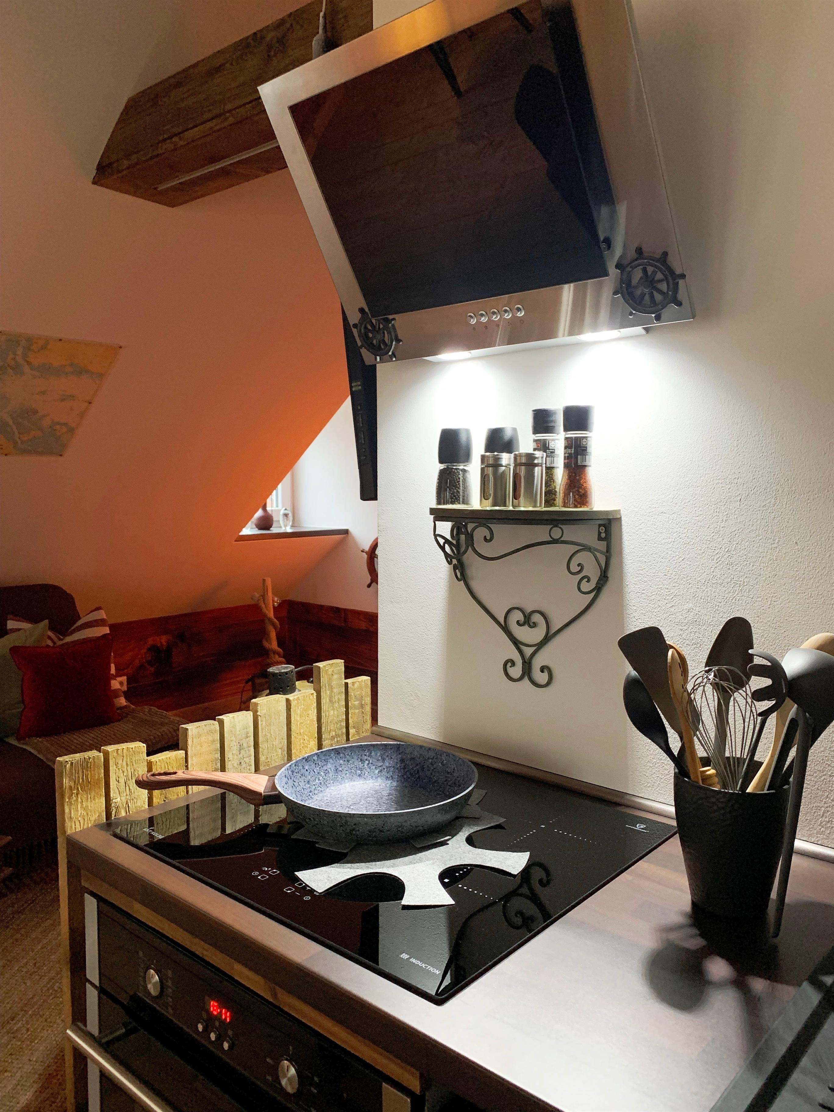 Die Küche hat einen Induktionsherd mit Backofen, einen Geschirrspüler und zwei geräumigen Kühlschränke mit Gefrierfach, sowie Toaster, Kaffeeautomat, Wasserkocher und Milchaufschäumer.