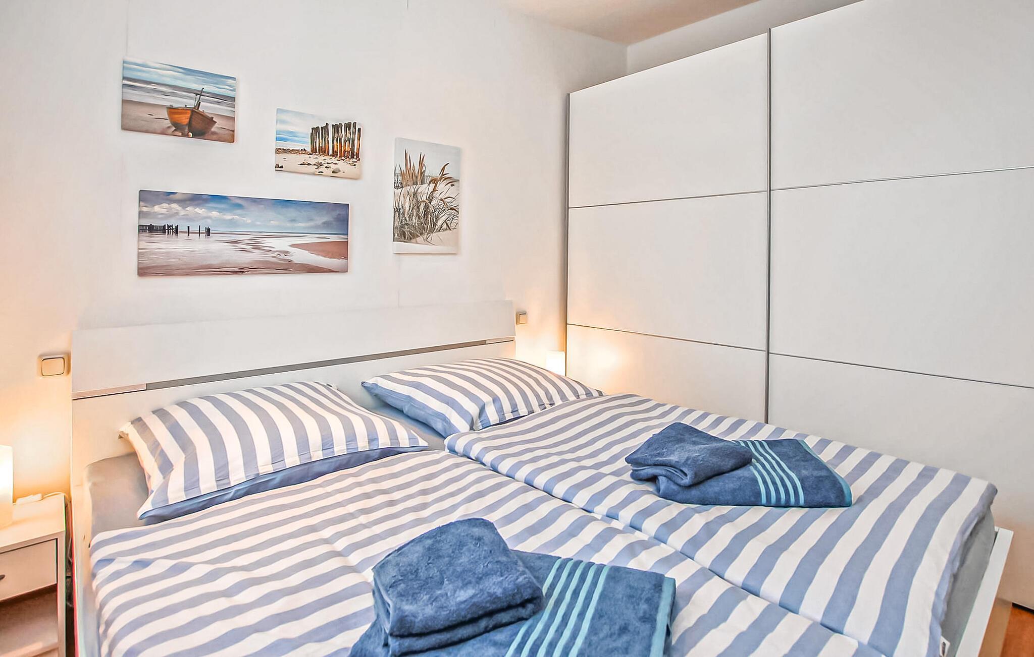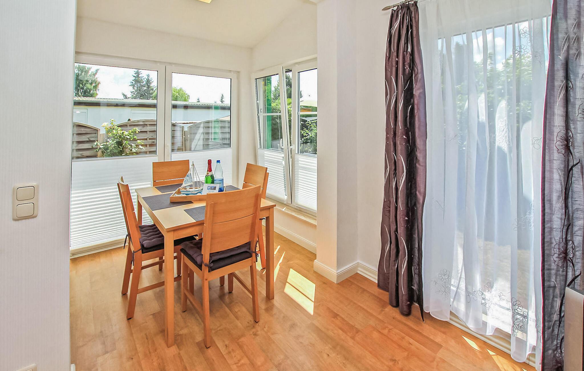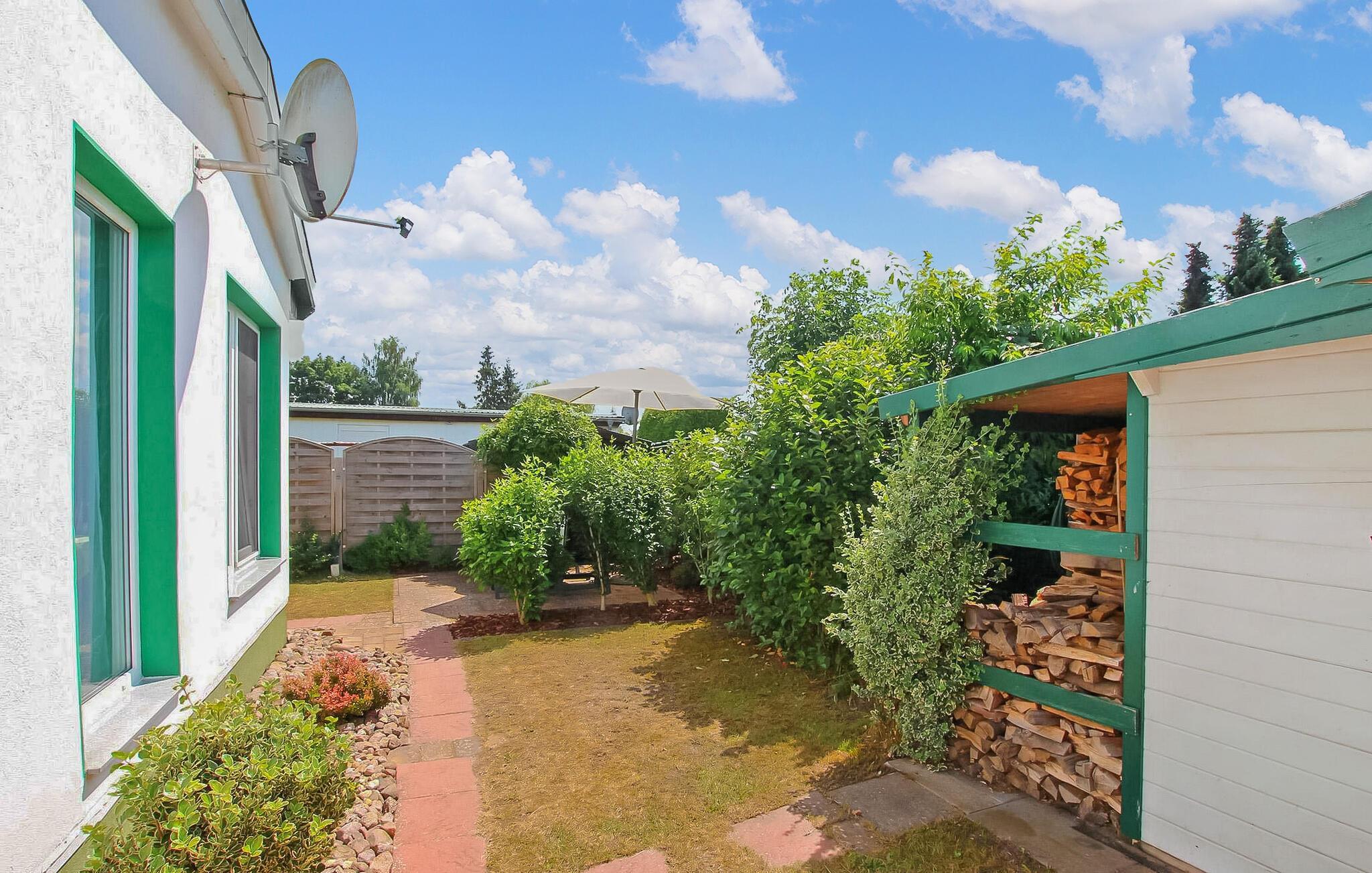 Kun cirka 200 m fra et badeområde og en lille havn ved Szczecin-lagunen ligger feriehuset for op til 3 personer, som blev totalrenoveret i 2018 og renoveret igen i 2021, i en feriebebyggelse på ca. kvadratmeter indhegnet fritidsejendom. Den fine sandstrand, lystbådehavnen og bymidten i Mönkebude med restauranter og indkøbsmuligheder kan nås på få minutter til fods via digestien. Det meget smagfuldt indrettede, cirka 43 kvm store ikke-ryger feriehus er udstyret med stue (sovesofa - mulighed for opredning, pejs, el-radiator, fladskærms-tv, musikanlæg, spiseplads, overdækket fryser), åben, fuldt udstyret udstyret køkken (elkomfur med ovn, køleskab, opvaskemaskine, mikroovn, diverse små køkkenmaskiner), soveværelse (dobbeltseng, el-radiator) og badeværelse (bruser, toilet, elektrisk håndklædevarmer, hårtørrer). Derudover er der en møbleret terrasse, liggestole, grill, et lille skur (mulighed for at parkere cykler), høj stol, barneseng inkl. madras, gratis WiFi og en parkeringsplads (centralt i komplekset, ca. 30 m væk). ).. Den samlede pris inkluderer slutrengøring, vand- og energiomkostninger, sengelinned, håndklæder og en første levering af brænde. Betales på stedet: turistskat, kæledyr (hvis relevant), ekstra brænde (trustfond). En mellemstor hund op til en højde på 40 cm er tilladt i denne ejendom. Alle andre dyr eller flere dyr kræver ejerens samtykke før reservation. Det er obligatorisk at holde i snor i feriekomplekset! Det rolige, statsanerkendte feriested Mönkebude ligger i den nordøstlige udkant af det cirka 125 km² store og skovklædte landskabsbeskyttelsesområde "Haff Coast" direkte ved Stettin-lagunen og kan lide at beskrive sig selv som lagunelandsbyernes perle. Ud over det fremragende udviklede netværk af cykel- og vandrestier med en række udflugtsmål i Ueckermünde Heide eller Anklamer-skoven, den smukke, let skrånende strand ved Stettiner-lagunen med en eventyrlegeplads, nudistområde og restauranter samt marina er populære attraktioner for gæster. I selve byen er der et minimarked, en iskiosk, restauranter og båd- og cykeludlejning Badebyen Ueckermünde med yderligere shoppingmuligheder, dens spændende gamle bydel, zoo og bådture til Polen eller øen Usedom er ca 7 km væk.