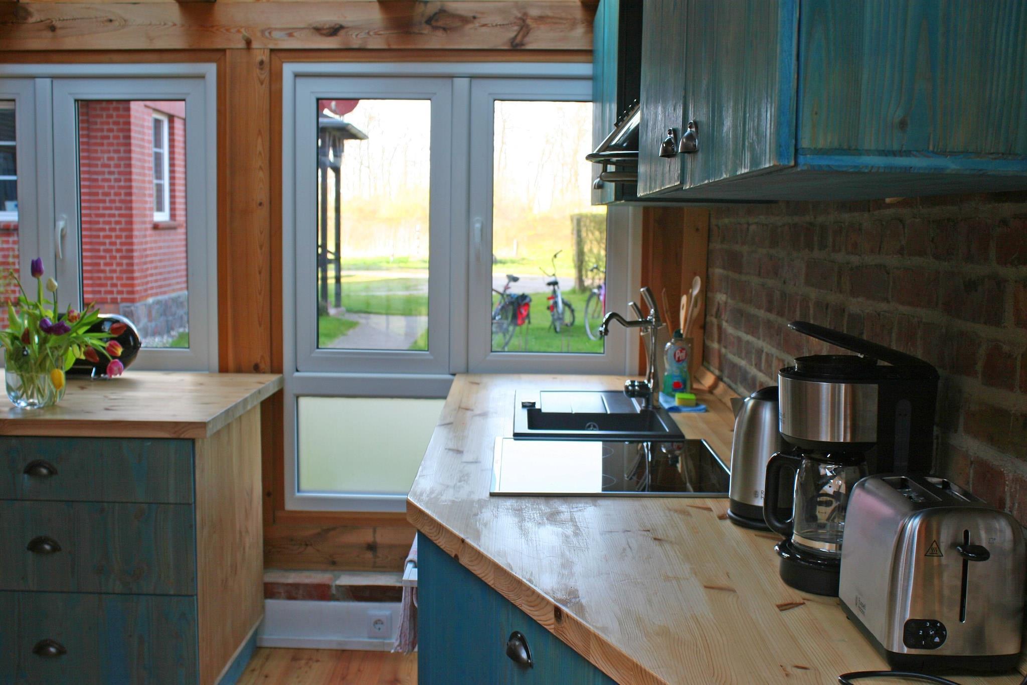Velkommen til vores Kate i Mönkebude - Mönkes Kate - ved Szczecin-lagunen. Vores fredede tidligere sommerhus på en fiskergård er tilgængelig for dig til at slappe af. Bygget i 1860 som en tilbygning til det tidligere store ladehus hos en fiskerfamilie fra Mönkebude og brugt til beboelse indtil omkring 1982. I dag slapper vores gæster af mellem de gamle bindingsværksvægge i mursten, vægge pudset med ler indvendigt og under det smukke stråtag på cirka 80 m² boligareal. Der er også en klassisk indrettet stue med sofa og lænestole fra mormors tid og pejs. Der er selvfølgelig også et tv og en lille klassisk sekretær til kort kontorarbejde. Ved siden af stuen ligger soveværelset med senge specielt tilpasset til dette værelse, som kan sættes sammen. I forbindelse med soveværelset finder du et walk-in closet. Depotkarakteren fra gamle dage er bibeholdt til dit tøj og enkelte andre småting og kan bruges optimalt. Køkkenet som midterrum blev gennemført i glas med en bærende bjælkekonstruktion omkring, for at bevare udsigten til murstensmurværket og konstruktionen af sommerhuset. Dette er indrettet med et robust tekøkken i massivt træ, hvori vores gæster finder alt køkkengrejet. Mönkebude byder selvfølgelig også på en masse gastronomi til dig. Indgangspartiet består af en vestibule og en lille gang. I fyringssæsonen er en konvektorvarmer tilgængelig - understøttet af elvarmere. Overfor indgangen til høloftet finder du udgang til udendørs terrasse over køkkenalrummet - et hyggeligt område med terrassebord og stole. Derudover giver vi dig WiFi. Overførselsraterne er ikke de bedste endnu – men de arbejder på det. Du er også velkommen til at bruge vores have liggestole. Ligeledes nac