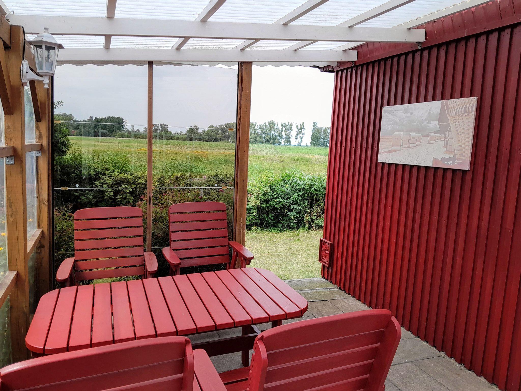 Vor dem Bungalow befindet sich eine großzügige überdachte Terrasse mit 2 Tischen und Stühlen sowie ein klimafreundlicher Naturgarten. Sonnenschirm und ein Grill sind vorhanden.