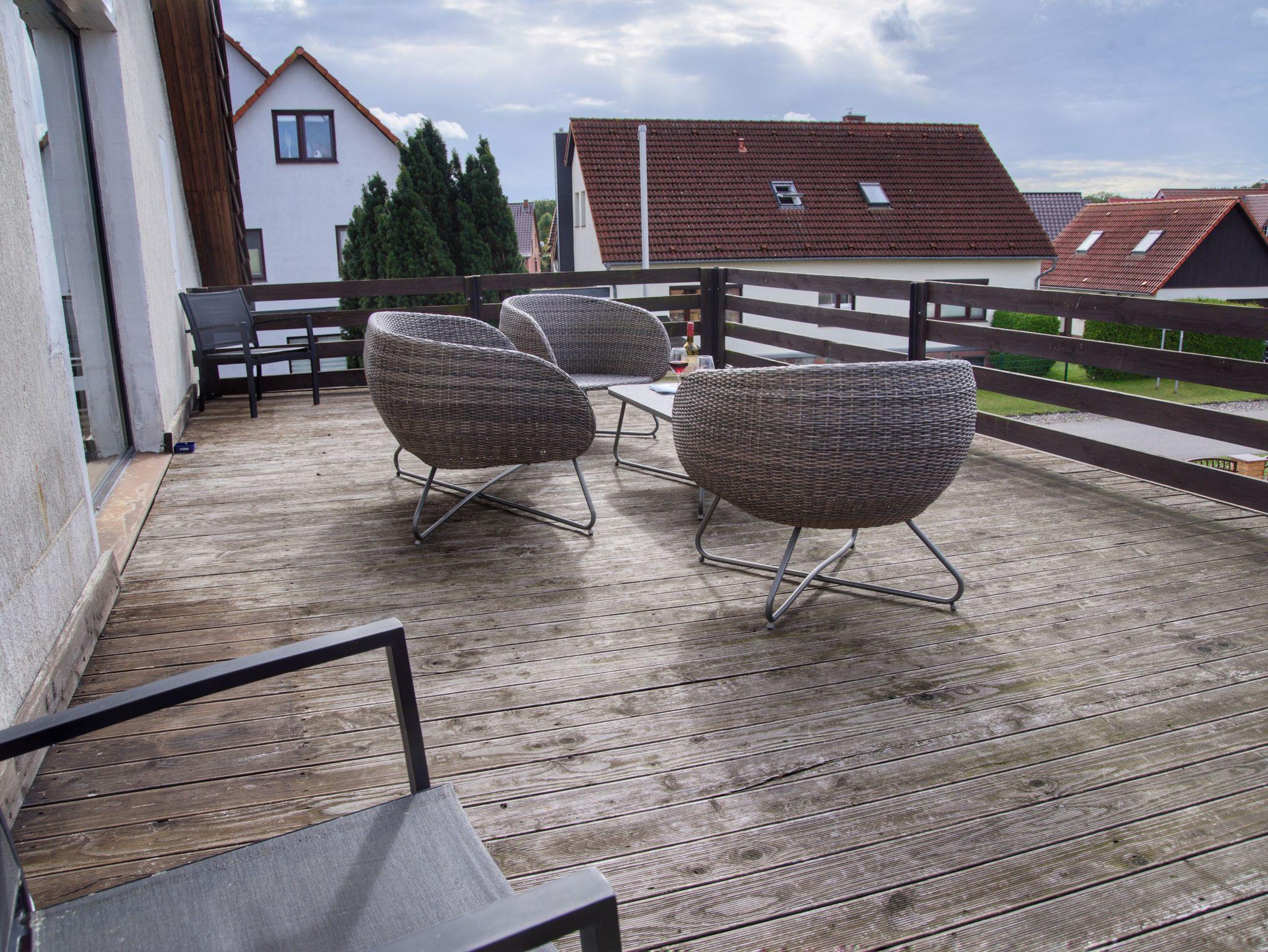 Die Ferienwohnung verfügt über eine Dachterrasse und eine Sitzecke im Garten