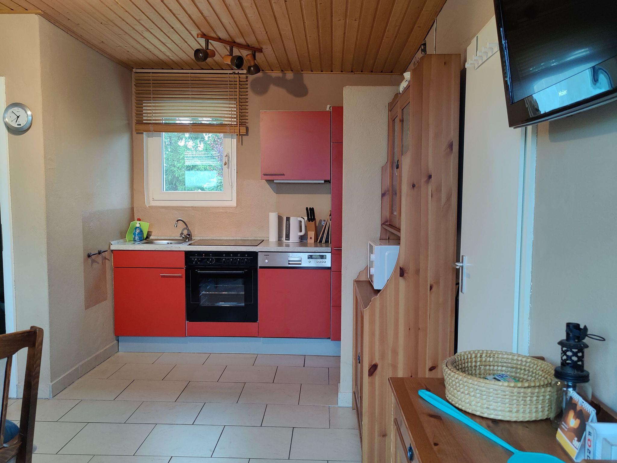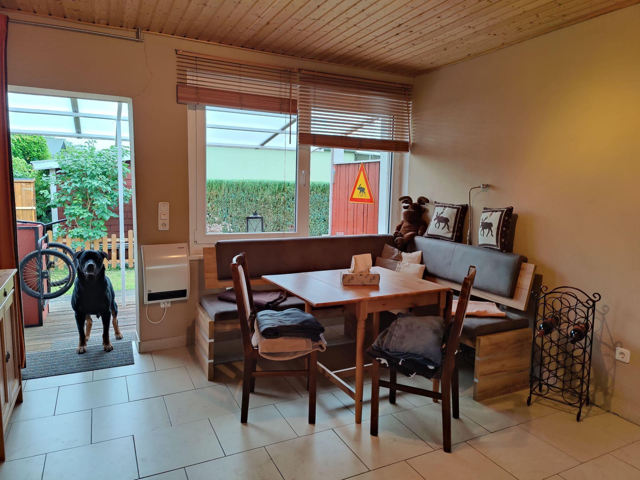 Der Bungalow bietet eine voll ausgestattete Wohnküche inkl. Eckbank mit Tisch und Stühlen, Geschirrspüler, Kühlschrank (ohne Gefrierfach), Herd mit Cerankochfeld und Backofen, Sat-TV und CD-Radio mit Bluetooth-Funktion. Über das Kinderzimmer mit Doppelstockbett (2x 90x200) und kleinem Schrank gelangt man in das Schlafzimmer mit Doppelbett (160x200), Schwebetürenschrank und zwei kleinen Nachttischchen. Das Duschbad mit WC ist ebenfalls von der Wohnküche aus zu erreichen.