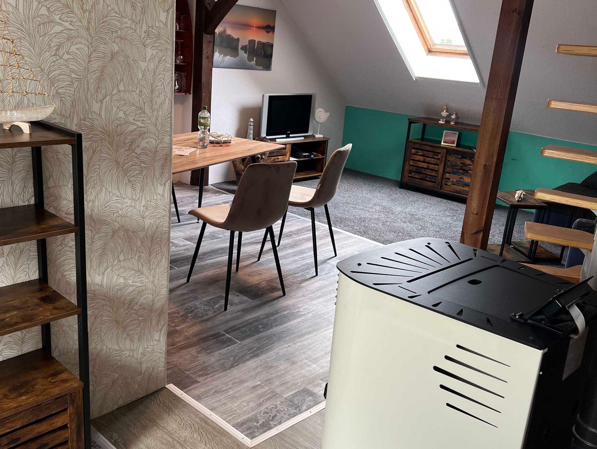 Das Wohnzimmer ist ausgestattet mit Sofabereich (2 Aufbettungen möglich) und Pelletkamin.