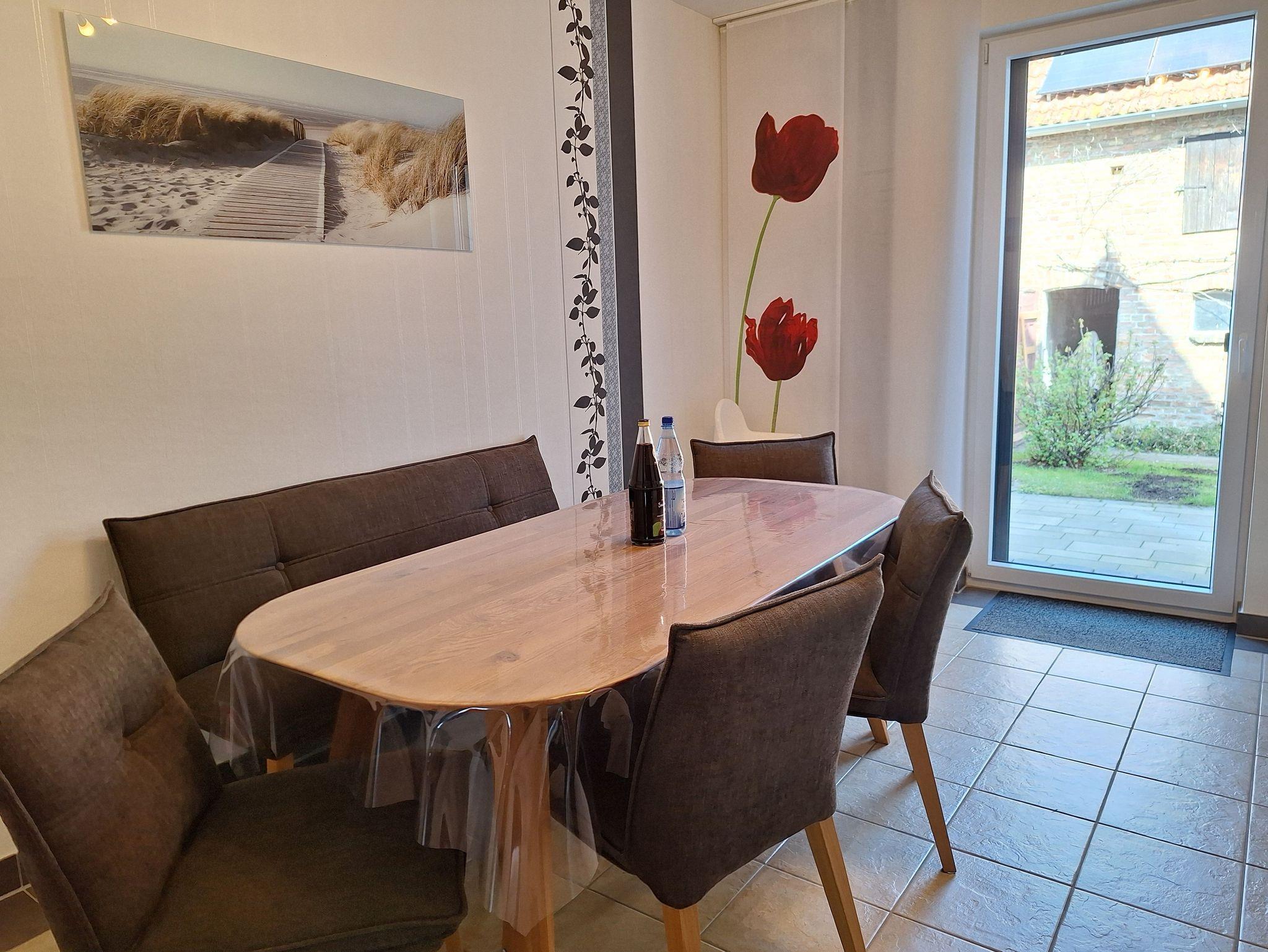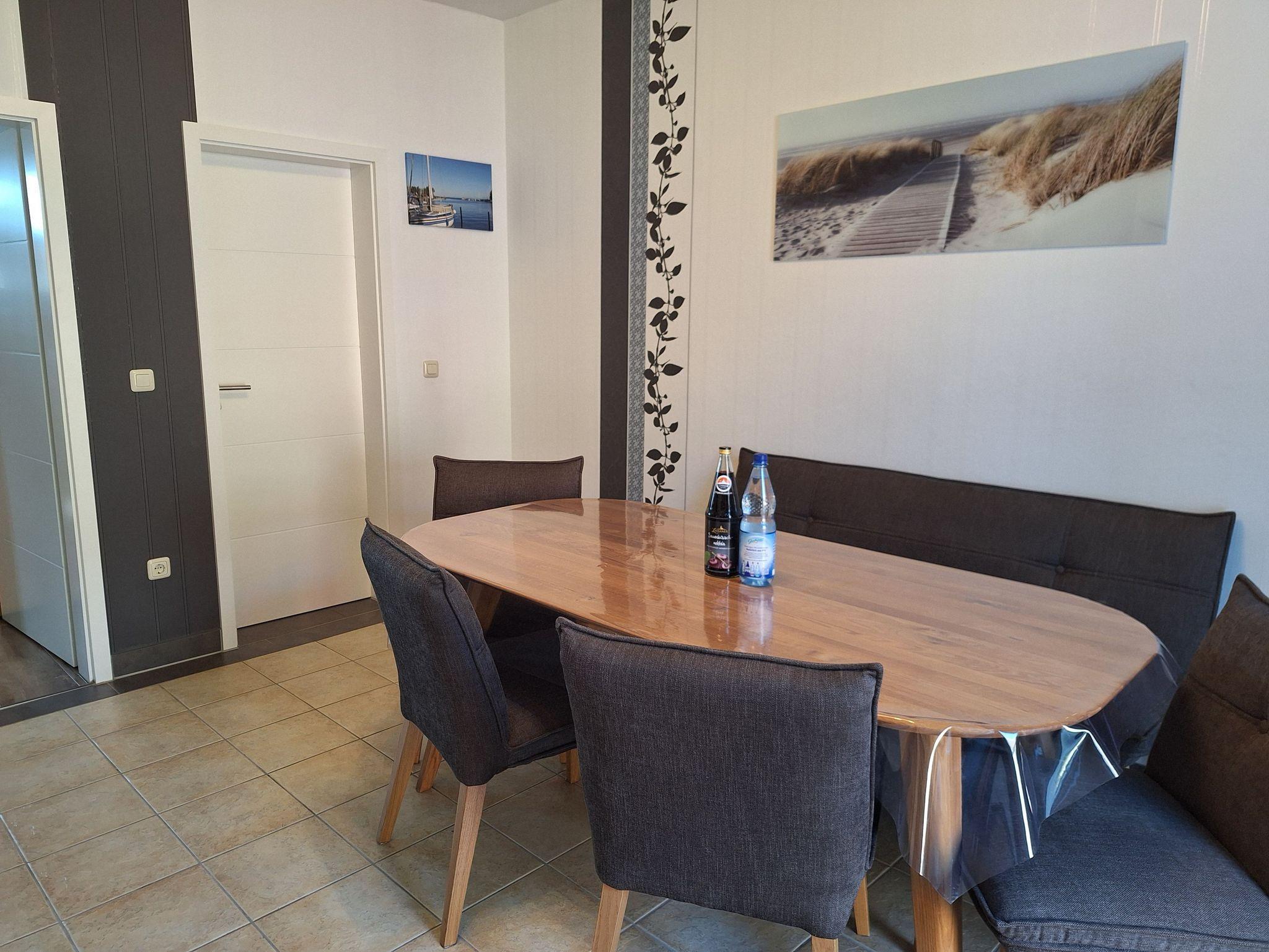 Im angrenzenden Esszimmer gibt es einen Esstisch mit 4 Stühlen, einer Sitzbank und einem Kinderstuhl.