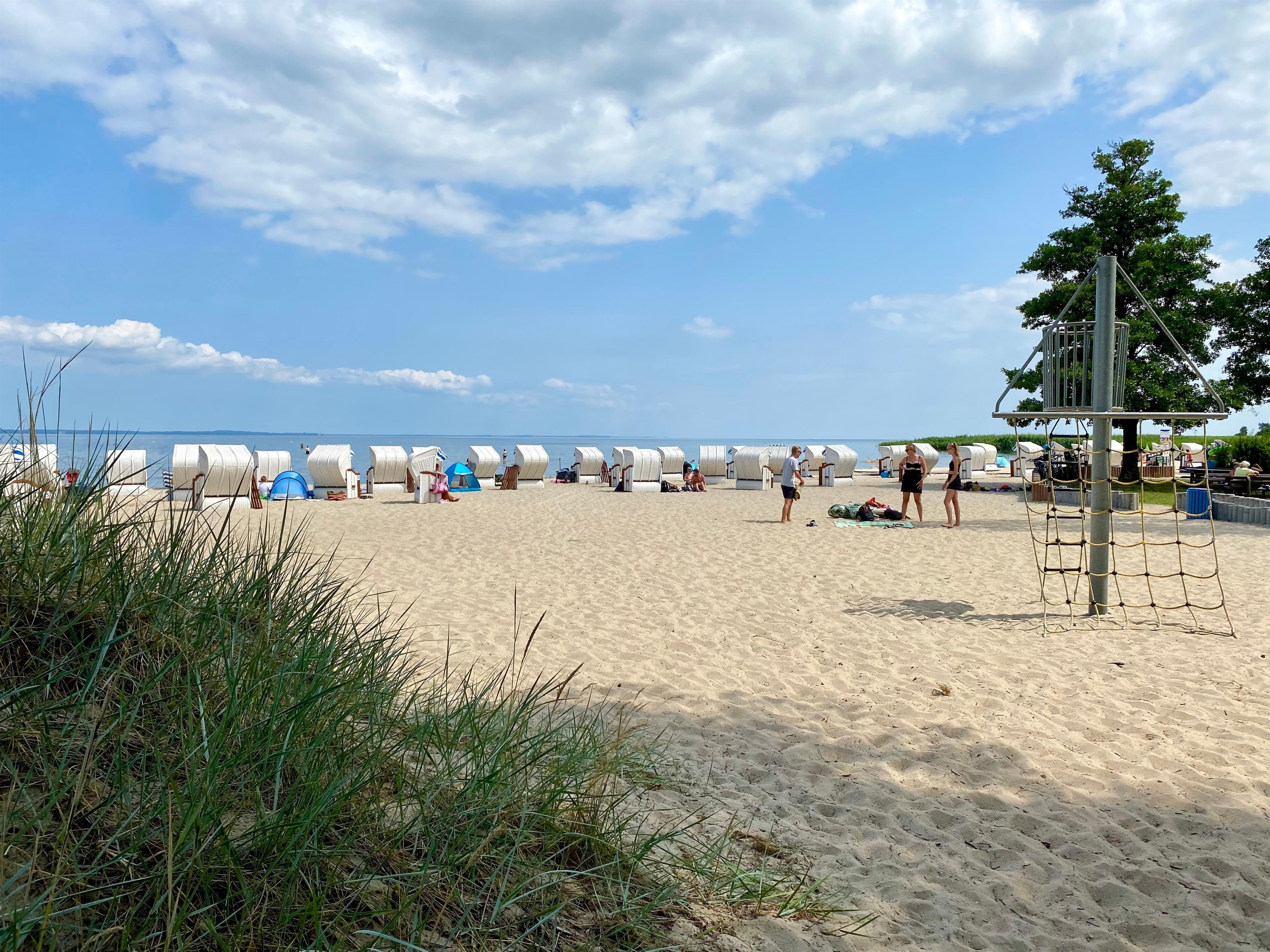 Der Strand hat eine Breite von knapp 500 Metern. Hier finden Sie Ihren Lieblingsplatz. Es gibt einen kleinen geschützten FKK-Bereich, Strandkörbe und Gastronomie. Auch für Ihre Strandmuschels und Ihren Sonnenschirm ist hier stets genügend Platz. Der flache Strand ist ein Paradies für Kinder. Nach dem Badespaß können Sie den herrlichen Abenteuerspielplatz erobern. Diese Erlebniswelt ganz aus Holz ist ein Highlight für kleine Entdecker.