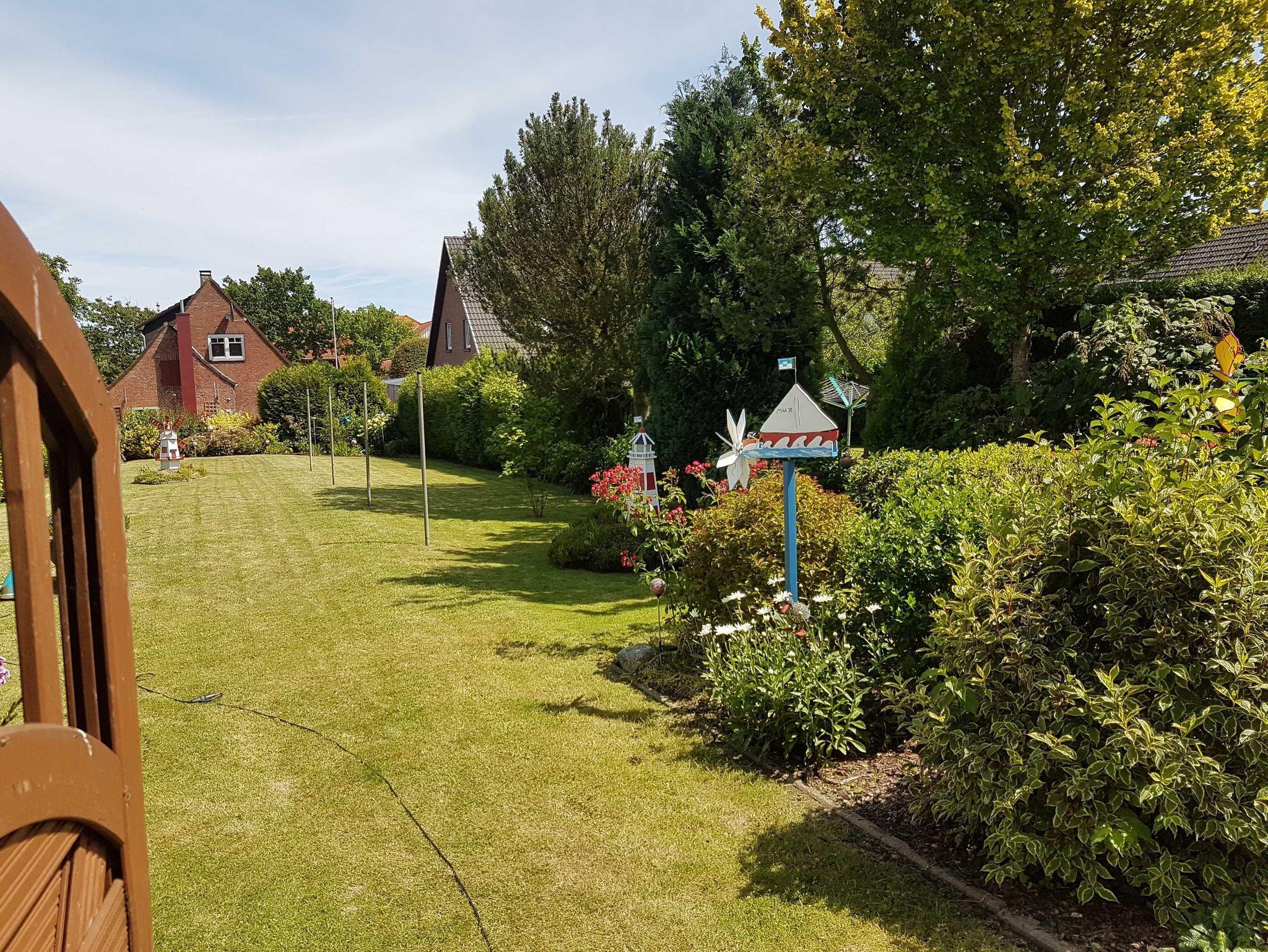 Eine möblierte Terrasse befindet sich im Garten.