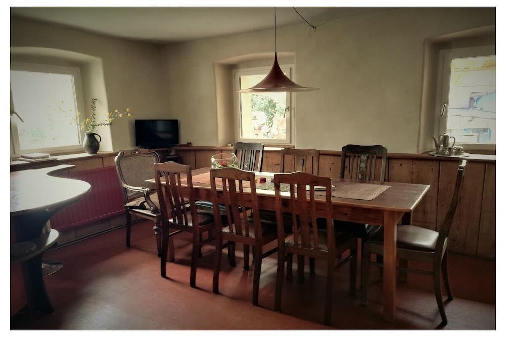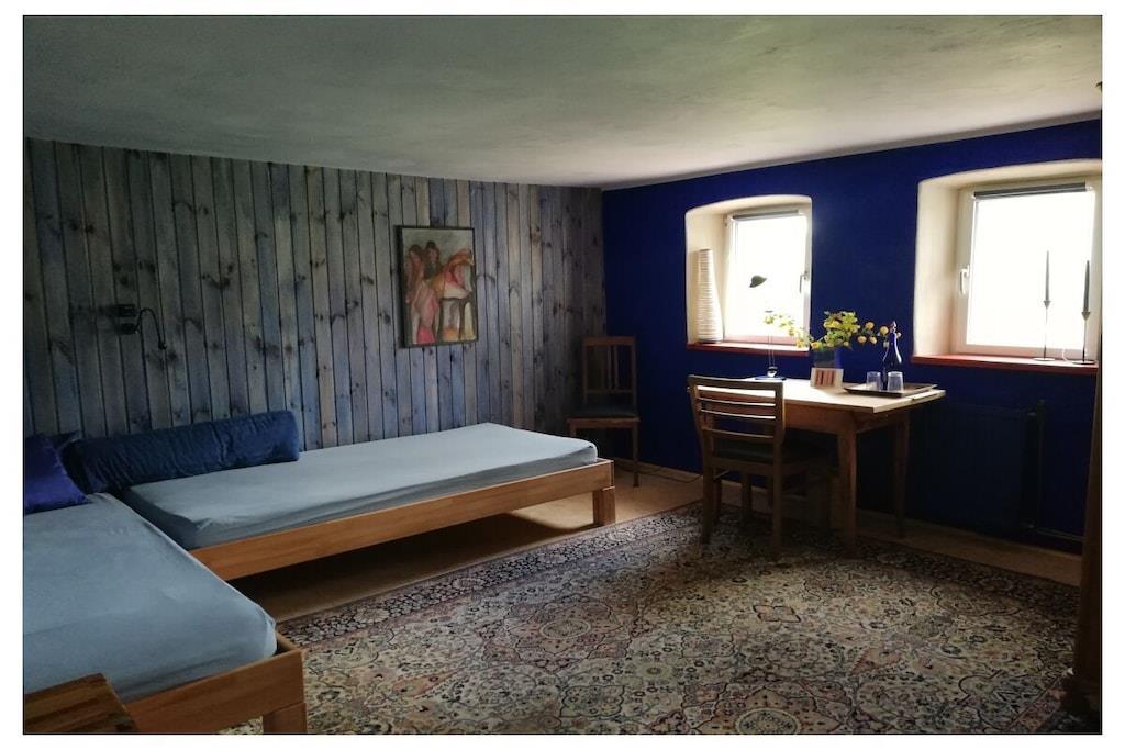 Værelserne i vores gamle hyrdehus er så unikke, at billederne taler for sig selv. Uanset om det er på den lille hems, den hyggelige maisonette, den komfortable par-terre eller det blå værelse, har hvert værelse sin egen charme. Det samme gælder køkken-stuen og de to badeværelser. Gæstehuset har to terrasser, den ene under den anden. Den ene er overdækket. En græsplæne til solbadning er placeret foran vores hyrdevogn (seng 160x200), som ligger 15 meter fra huset og kan bookes separat.
