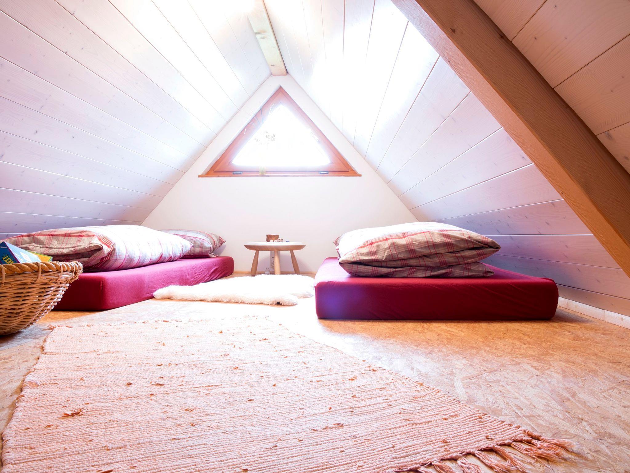 Unser Ferienhaus Waldesruh hat ein gemütliches Wohnzimmer mit Kochnische, TV und Kaminofen. Es bietet auf ca. 48 m² Platz für vier Personen. Im ausgebauten Spitzboden befindet sich zusätzlich ein Matratzenlager, das vor allem von Kindern gerne bezogen wird.