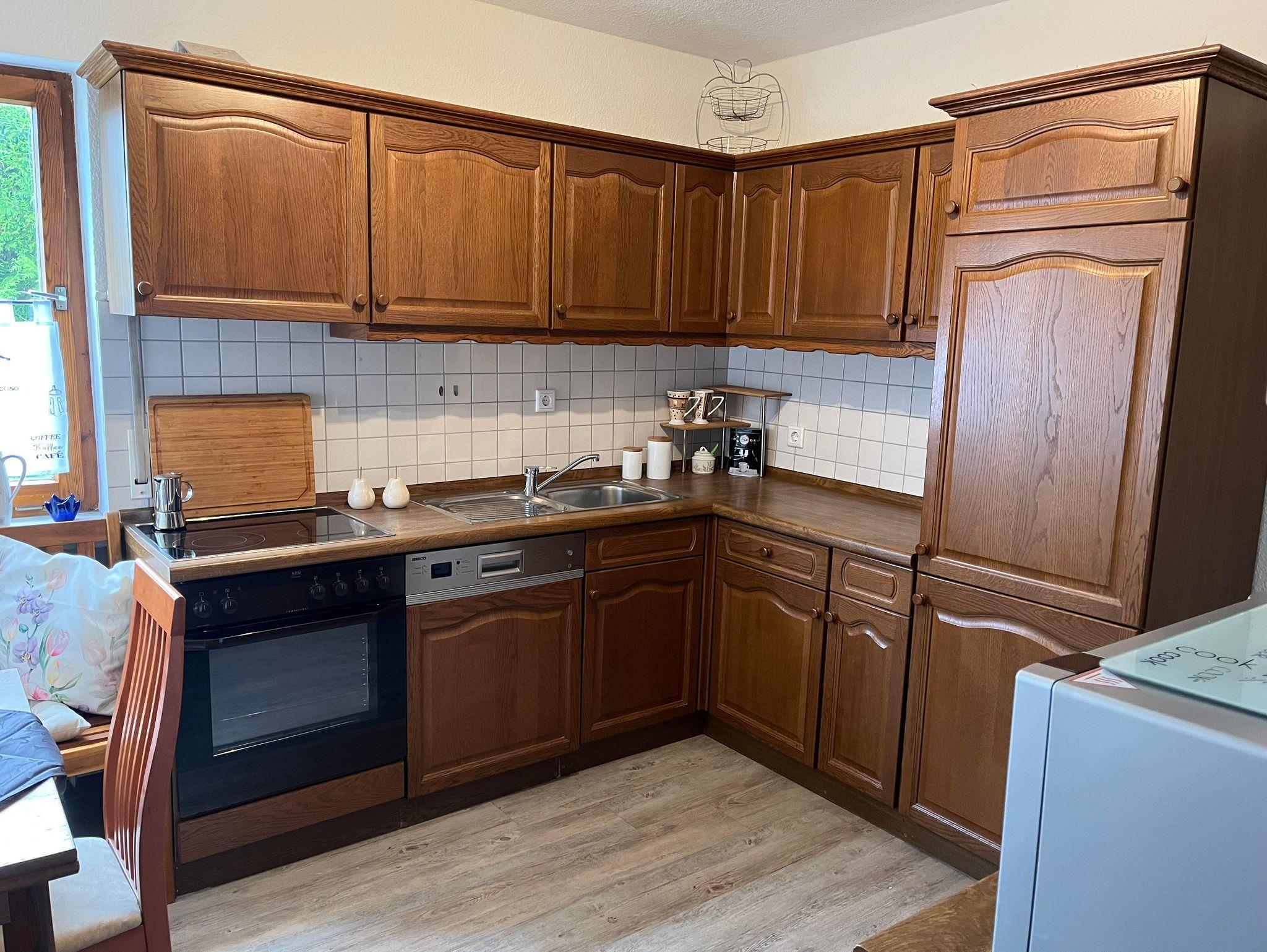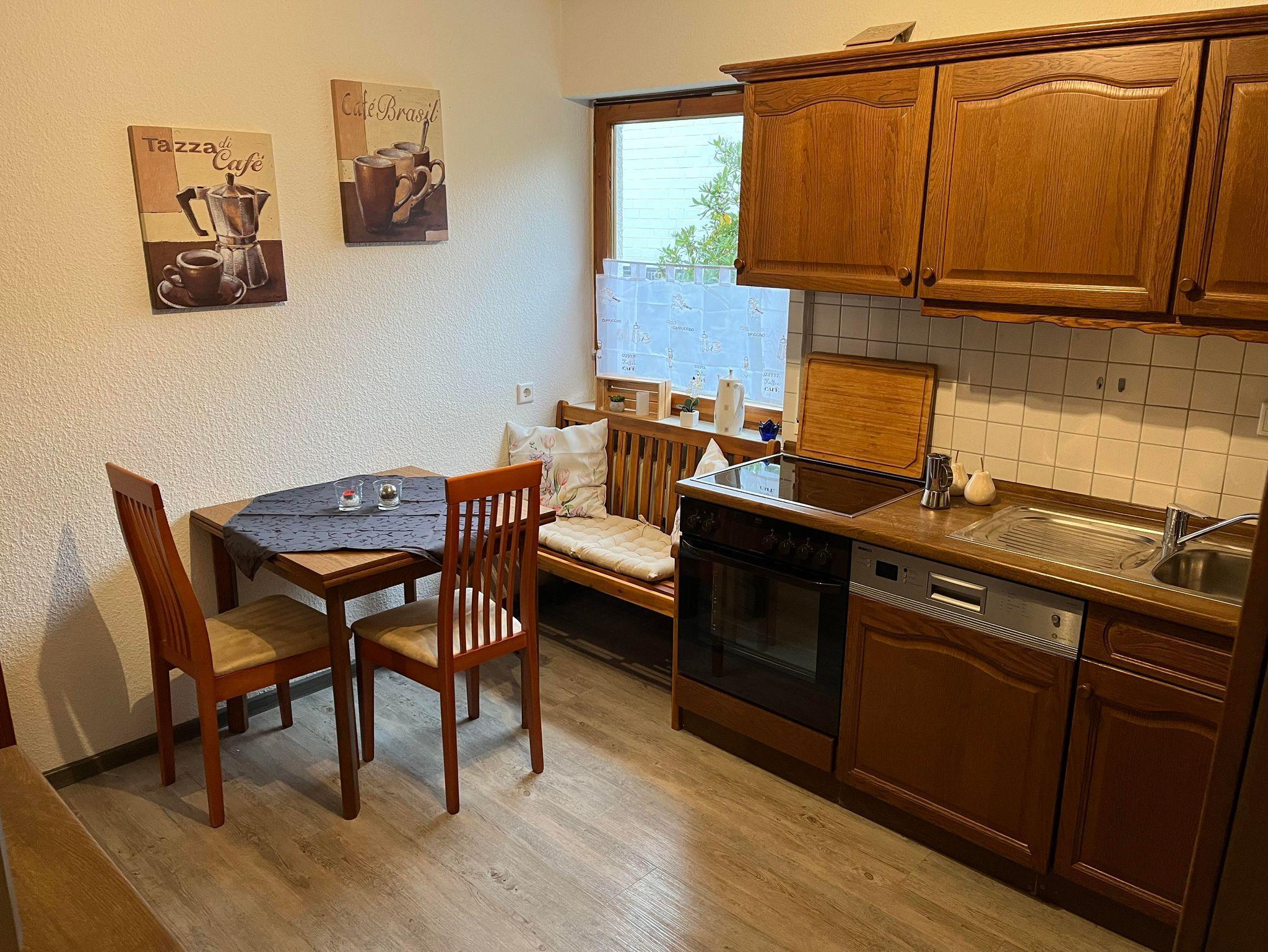 - Küche: Voll ausgestattete Küche inkl. Herd, Backofen, Kühlschrank, Spülmaschine sowie Esstisch mit vier Sitzmöglichkeiten.