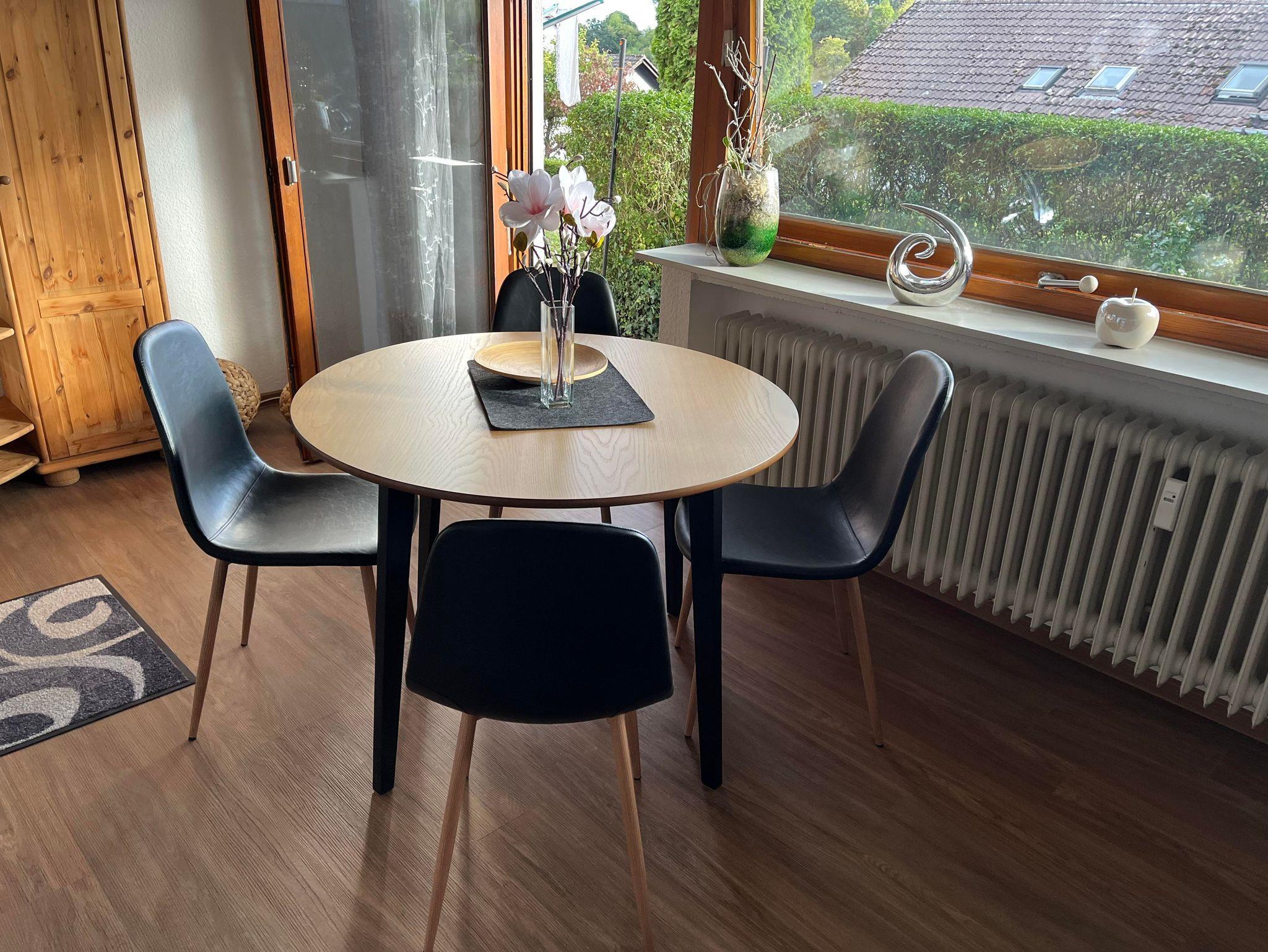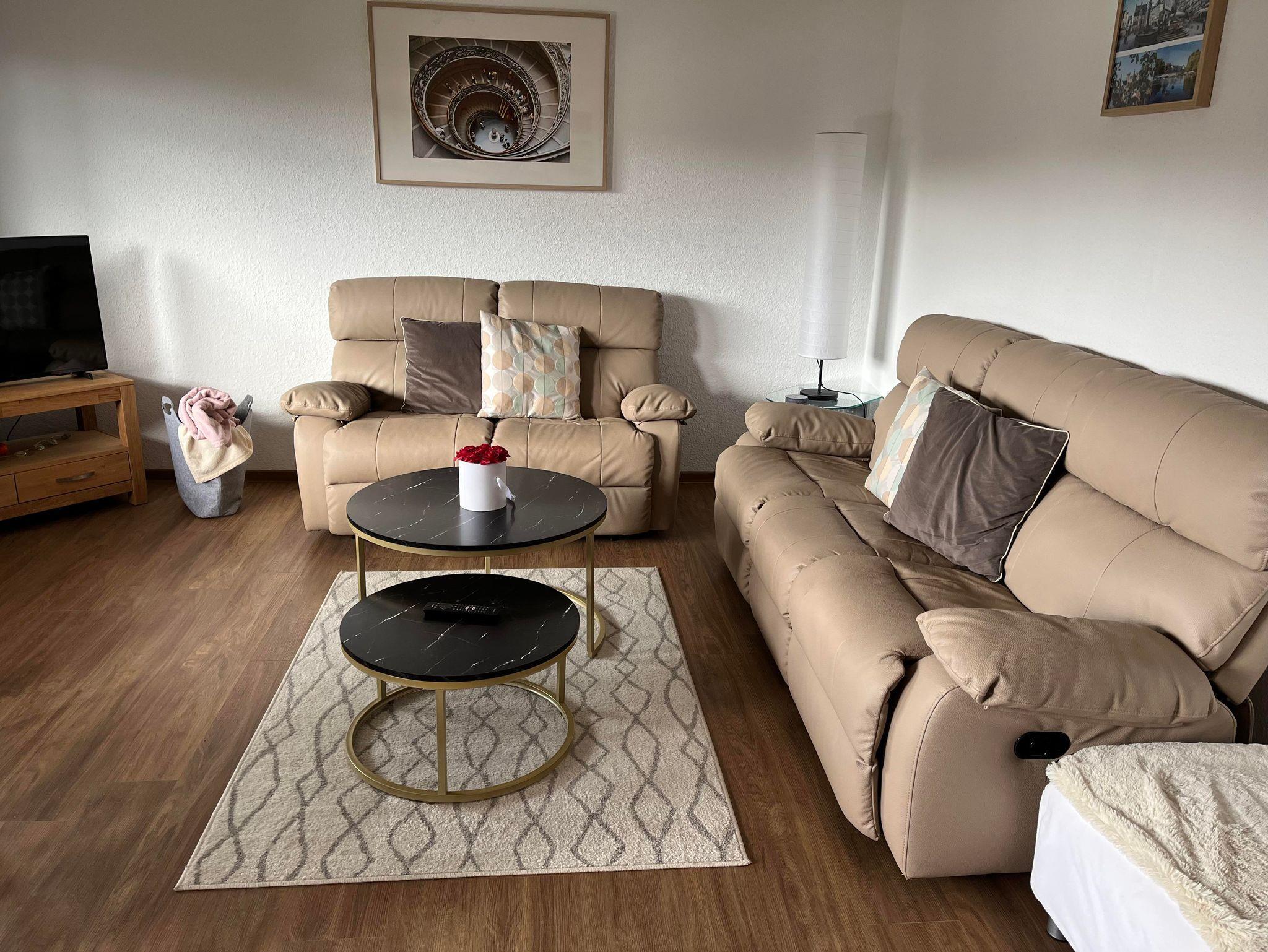 -Wohnzimmer: Couch (1x Zweisitzer + 1x Dreisitzer), Fernseher, Alexa, Esstisch für 4 Personen (Optional Kleinkind-Stuhl möglich)