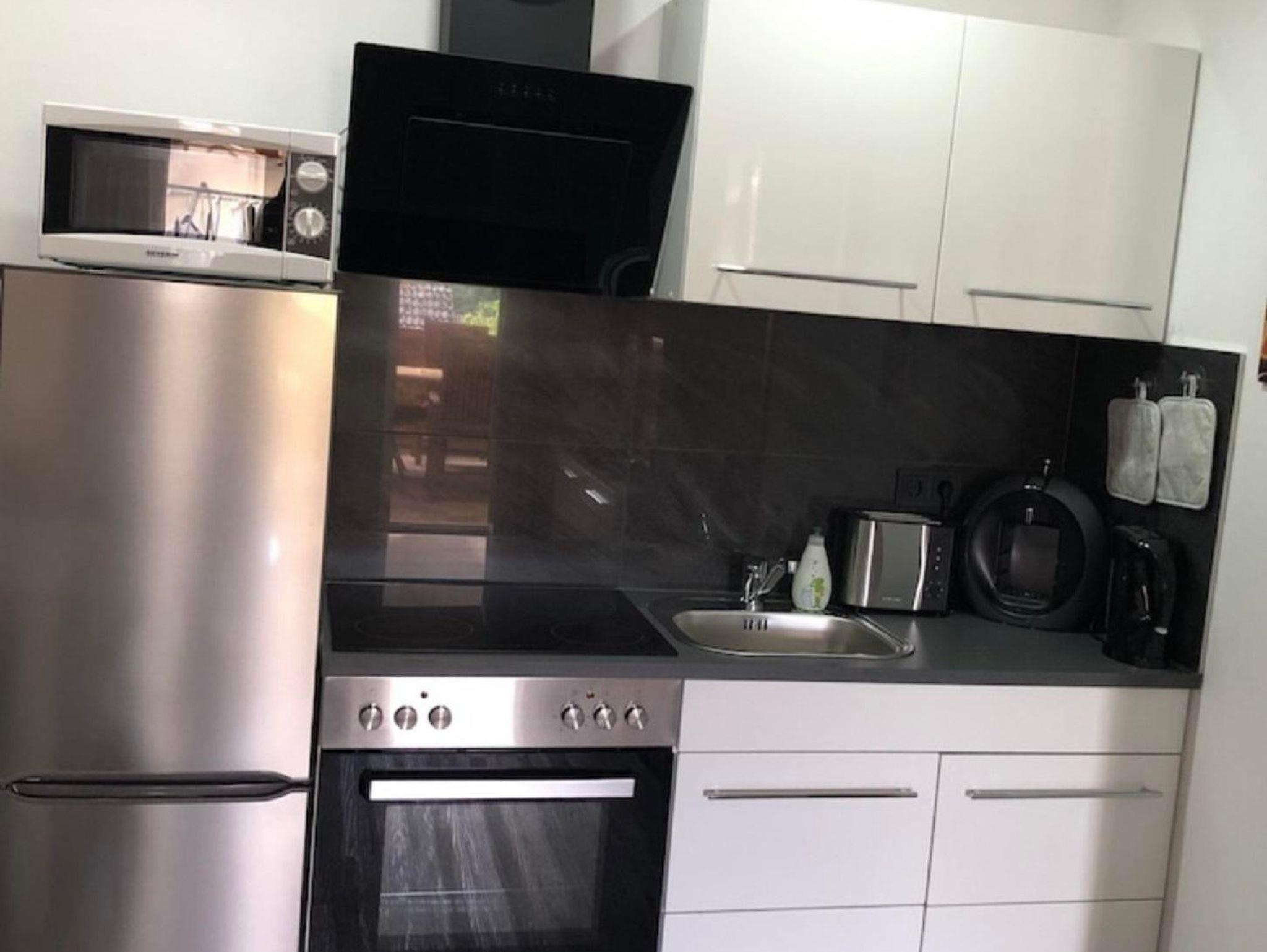 In der Wohnecke befindet sich die Couch. Eine neue, voll ausgestattete Küche ist auch vorhanden. Es handelt sich um eine Nichtraucherwohnung. Die Ferienwohnung ist eine komplett neu ausgebaute Wohnung mit folgender Ausstattung: Fernseher, Radio, Duschbad, WiFi, komplett ausgestattete Küche (ohne Spülmaschine ) mit eigenem Essbereich .