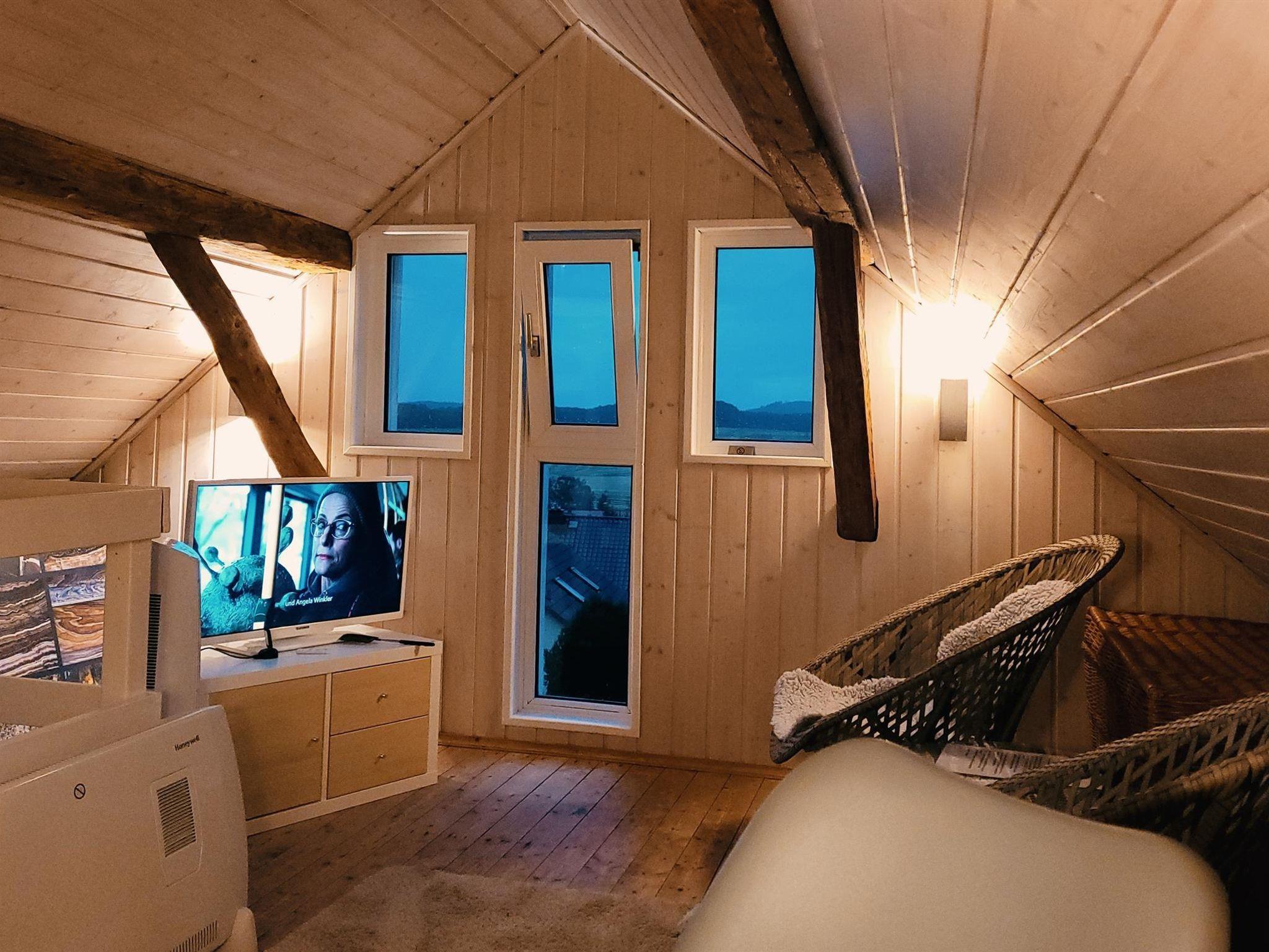 Galerie mit Fernsehecke, Smartfernseher und DVD-Player, Einzelbett 90 X 200 cm sowie ein zu einer Liegestatt konvertierbarer Hocker