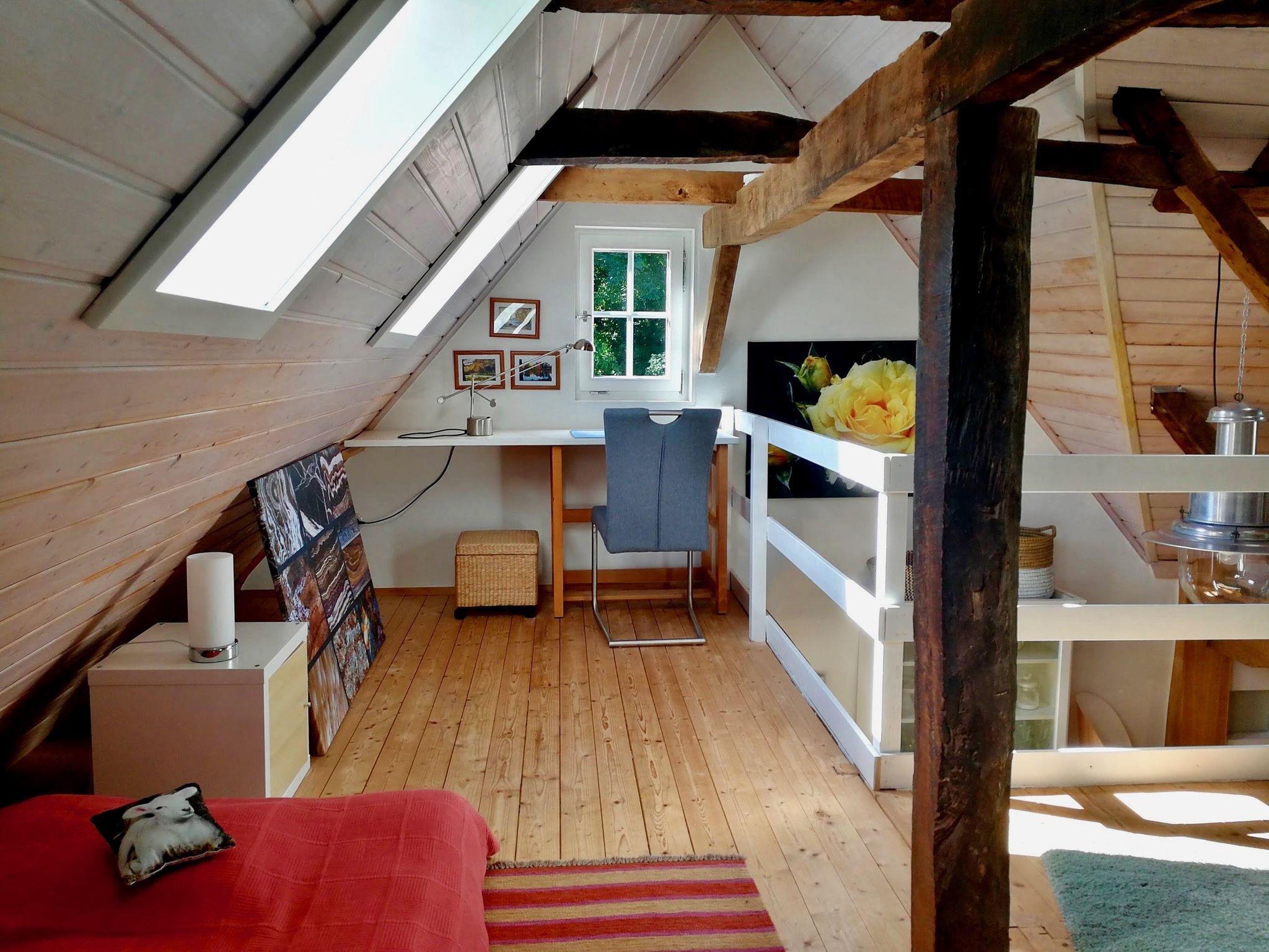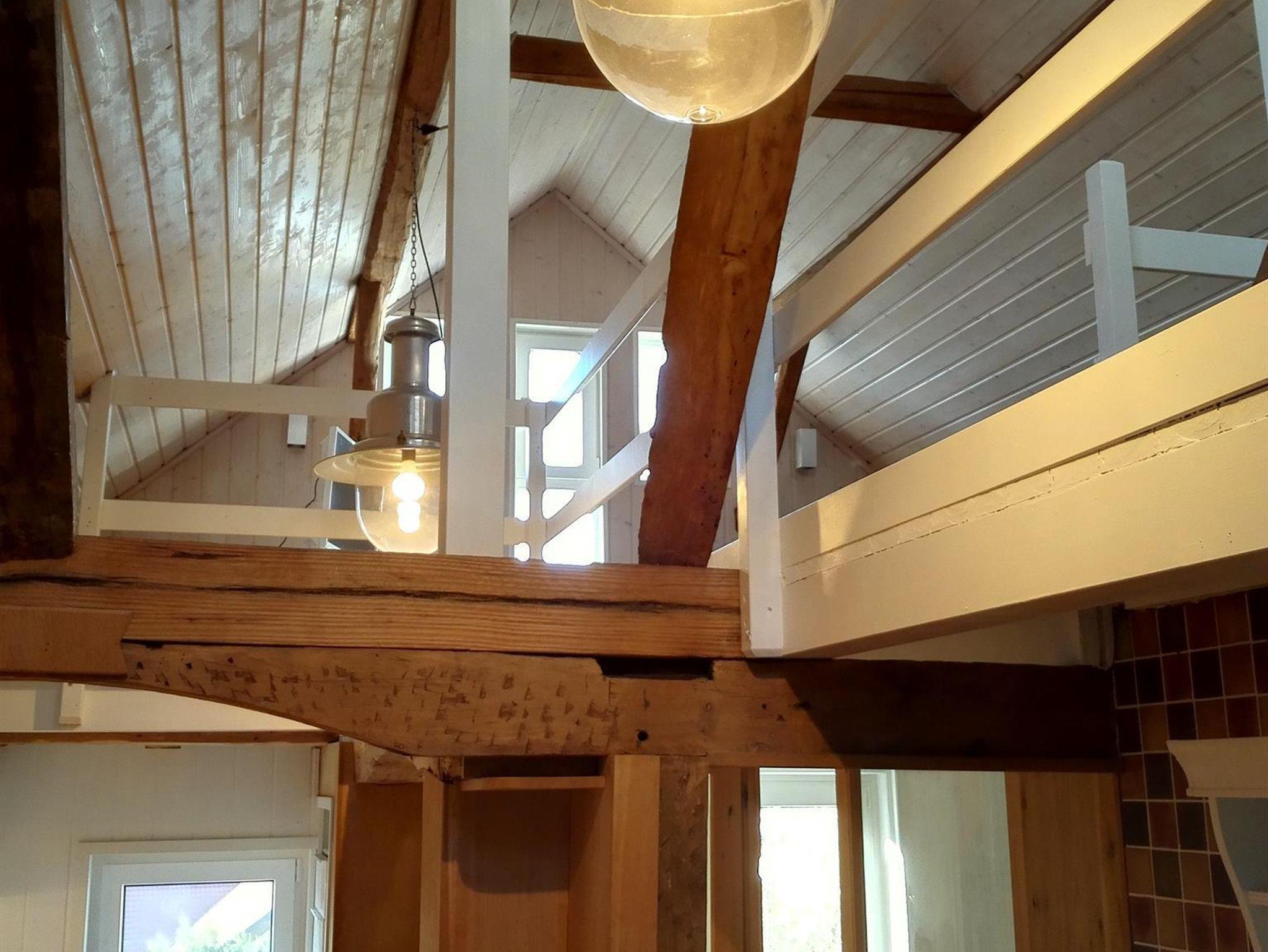 Viel Holz in Gebälk, Vertäfelung und Fußböden verbreitet Gemütlichkeit und Behaglichkeit.