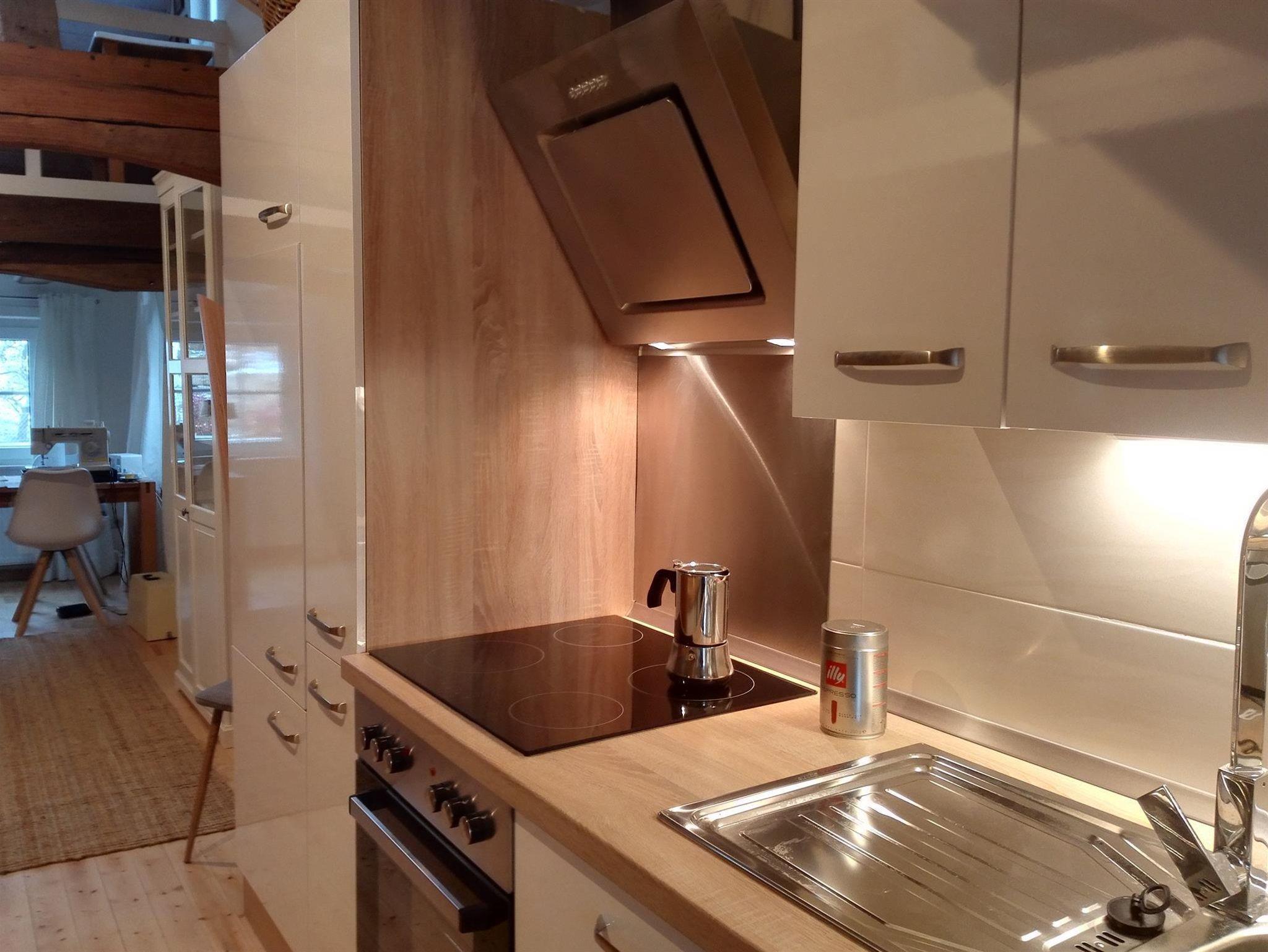 Im oberen Geschoss:Vorflur;Essbereich: Esstisch, Vitrine, Sideboard und Hängeboard, Internetradio. Einbauküche mit Kühlschrank (mit Gefrierfach), Koch- und Backherd, Ablufthaube, Mikrowelle, Toaster, Wasserkocher, Mixer, Spülmaschine. Geschirr sowie Küchengeräte ausreichend vorhanden,Tee-, Kaffee- und Espressobereiter.
