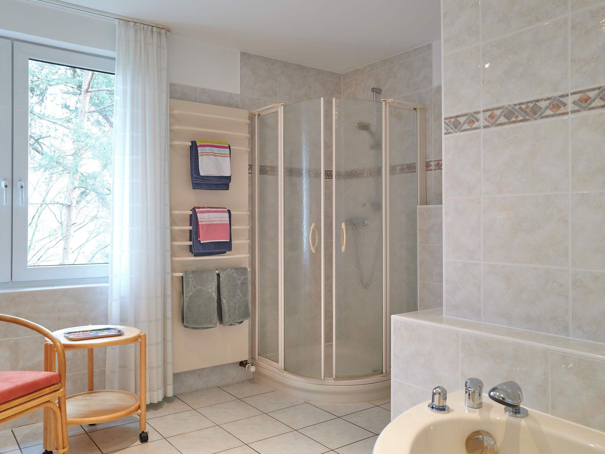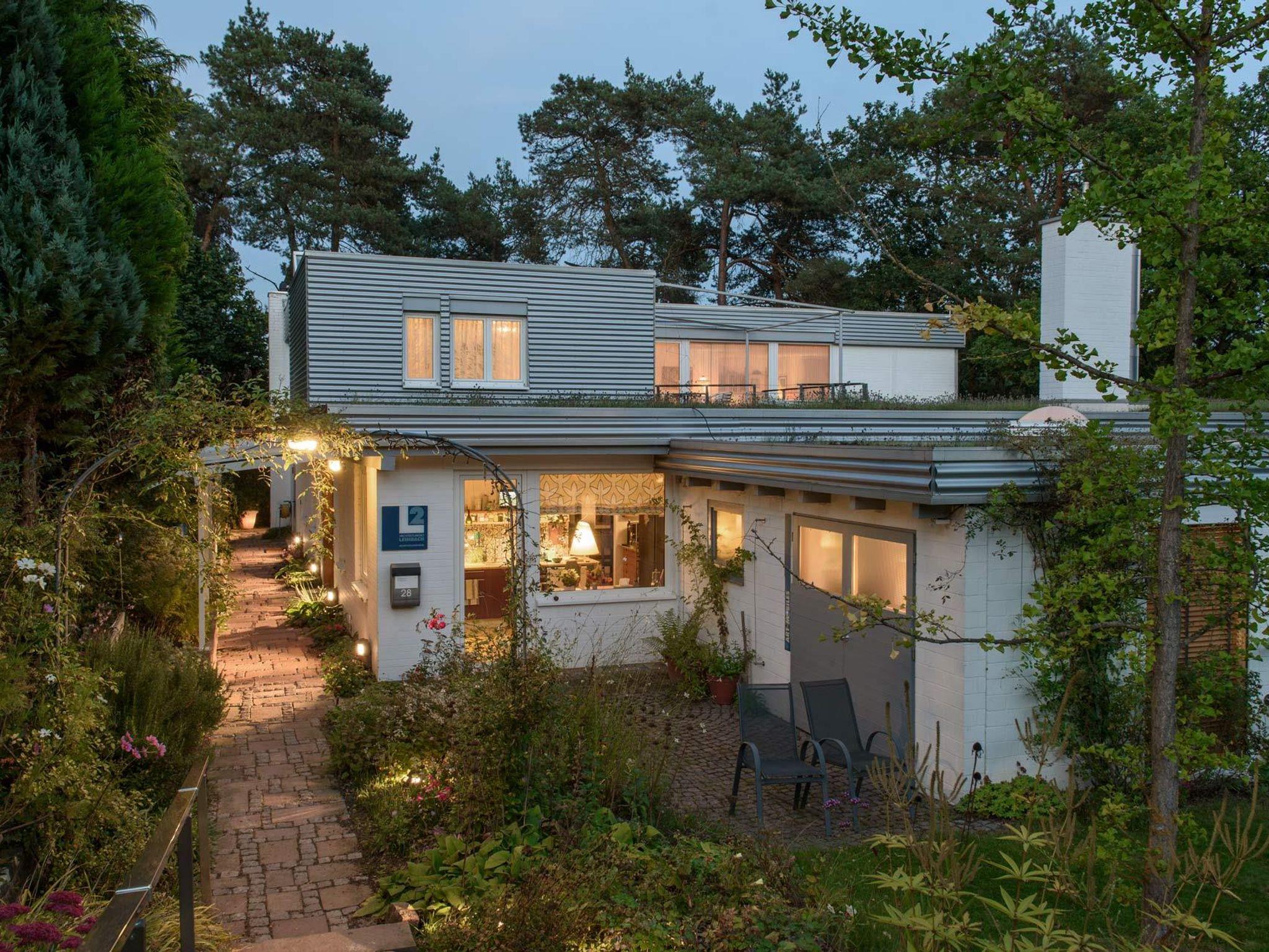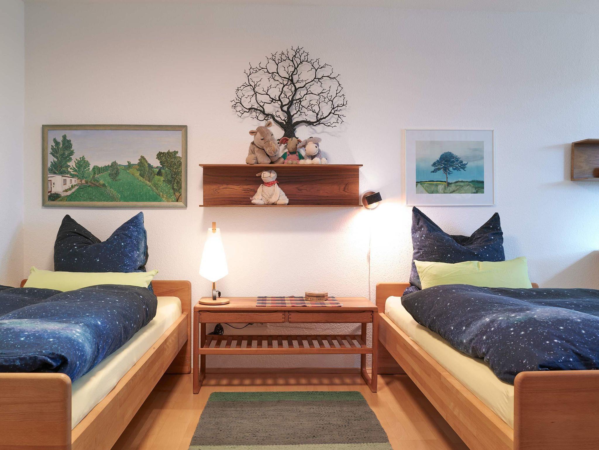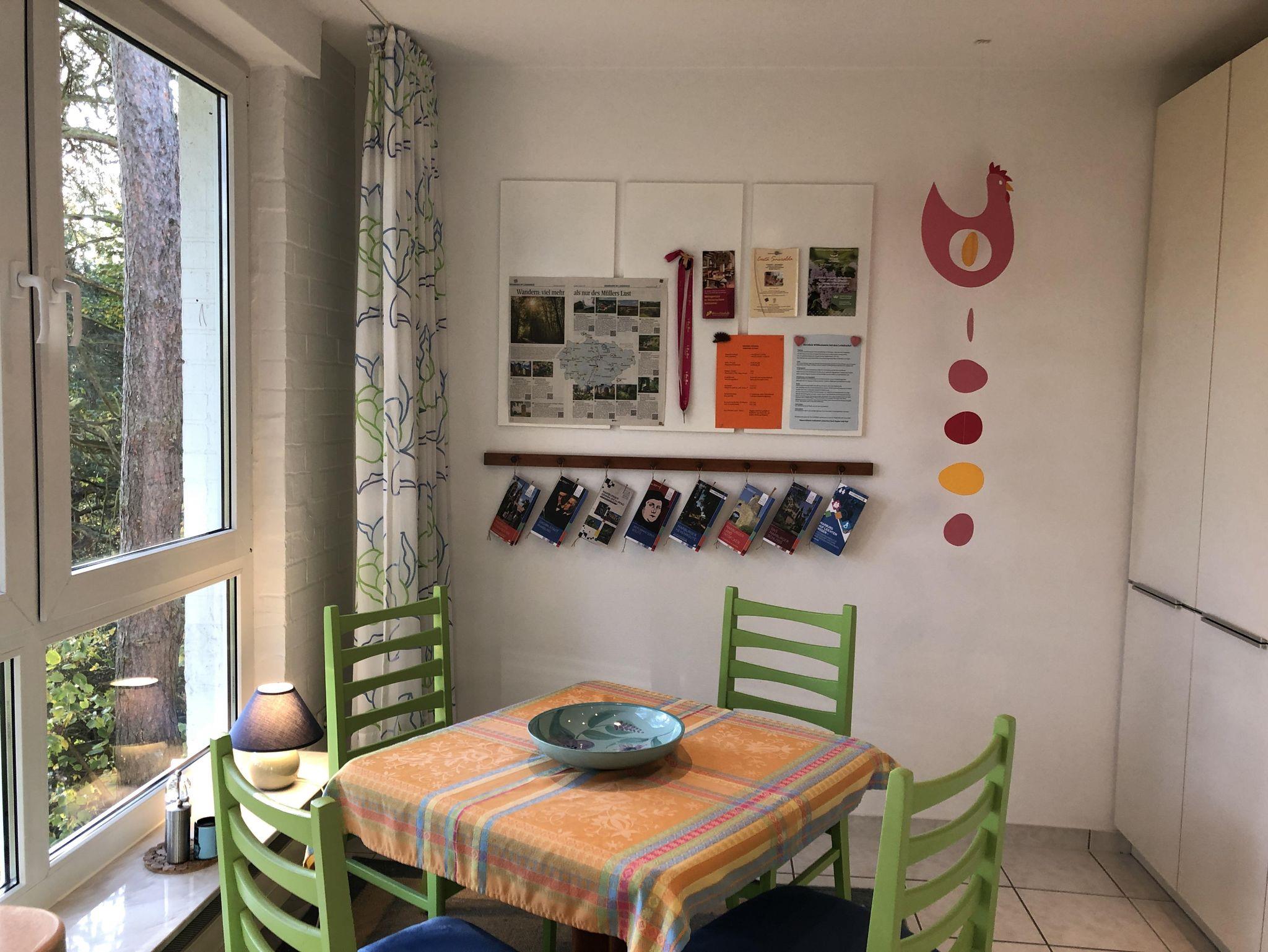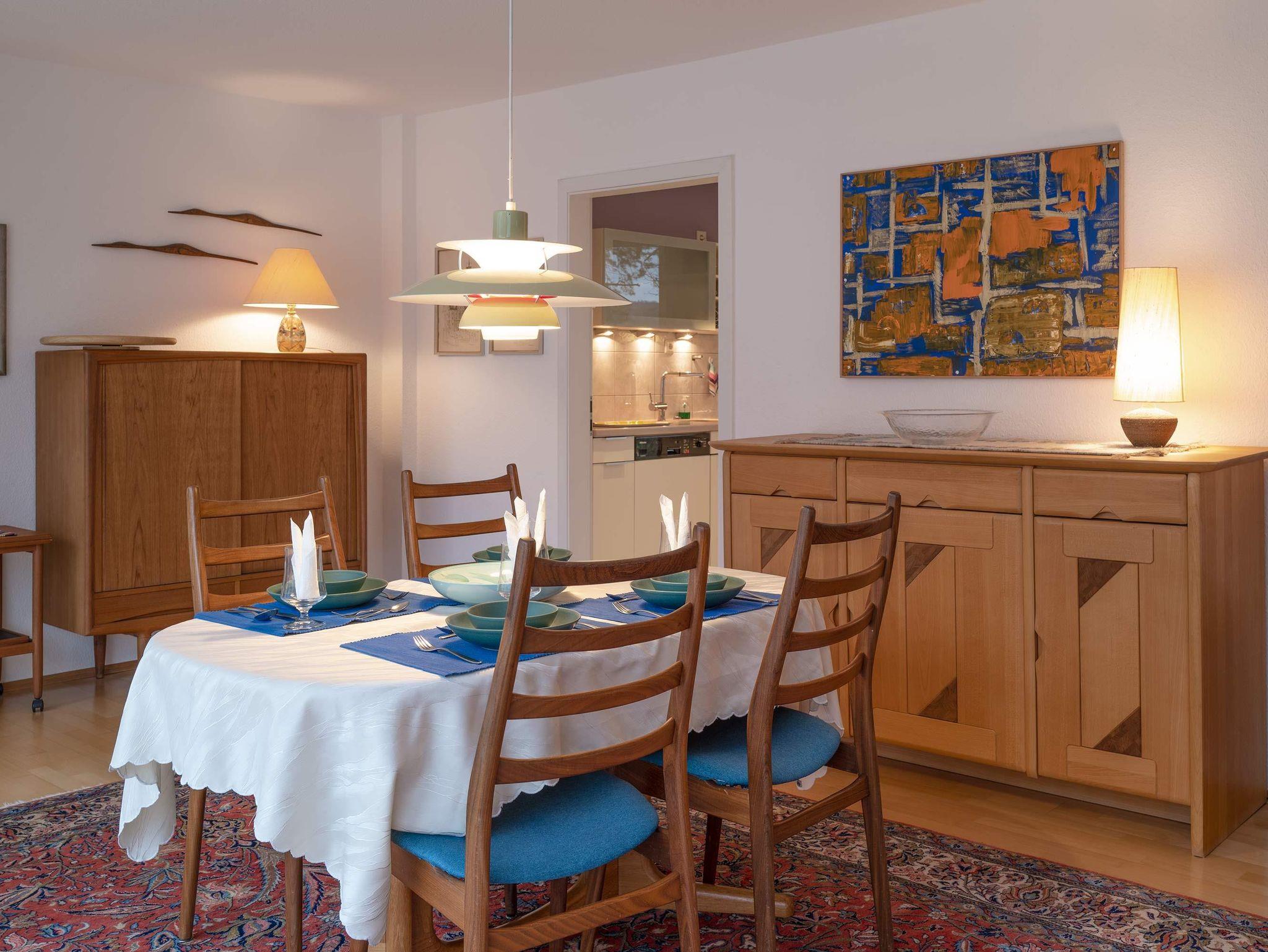 Sie erreichen Ihre Ferienwohnung, die auf 140 qm vier Gästen großzügig Platz bietet, über einen separaten Eingang. Eine geräumige Diele empfängt Sie, es gibt zwei Schlafzimmer: eines mit Doppelbett 180 x 200 cm (2 Matratzen), Terrassenzugang, Ankleide und großem Kleiderschrank. Das kleinere Schlafzimmer hat zwei Einzelbetten 90 x 200 cm, liegt nach Osten mit Blick ins Grüne. Hier steht für ungestörtes Arbeiten ein Schreibtisch. Beide Schlafräume lassen sich verdunkeln. Die Küche mit Kühl/Gefrierschrank, Spülmaschine, Ceranherd, Dunstabzug, Ofen, Nespressomaschine, Toaster, Küchenradio und Frühstücksplatz mit Morgensonne. Große SüdWest-Terrasse mit Tisch, Stühlen und Markise. Offenes Wohn- und Eßzimmer im skandinavischen Stil, Schaukelsessel, Sekretär, DVD-Spieler, TV, Spiele, Bücher, raumhohe Fenster mit Sicht auf Baumwipfel und Umgebung. Großes, wohnliches Bad mit Aussicht, WC, Badewanne, Dusche, Doppelwaschbecken, Handtuchwärmer, Sessel; kleines separates Gäste-WC. Gratis W-LAN.
