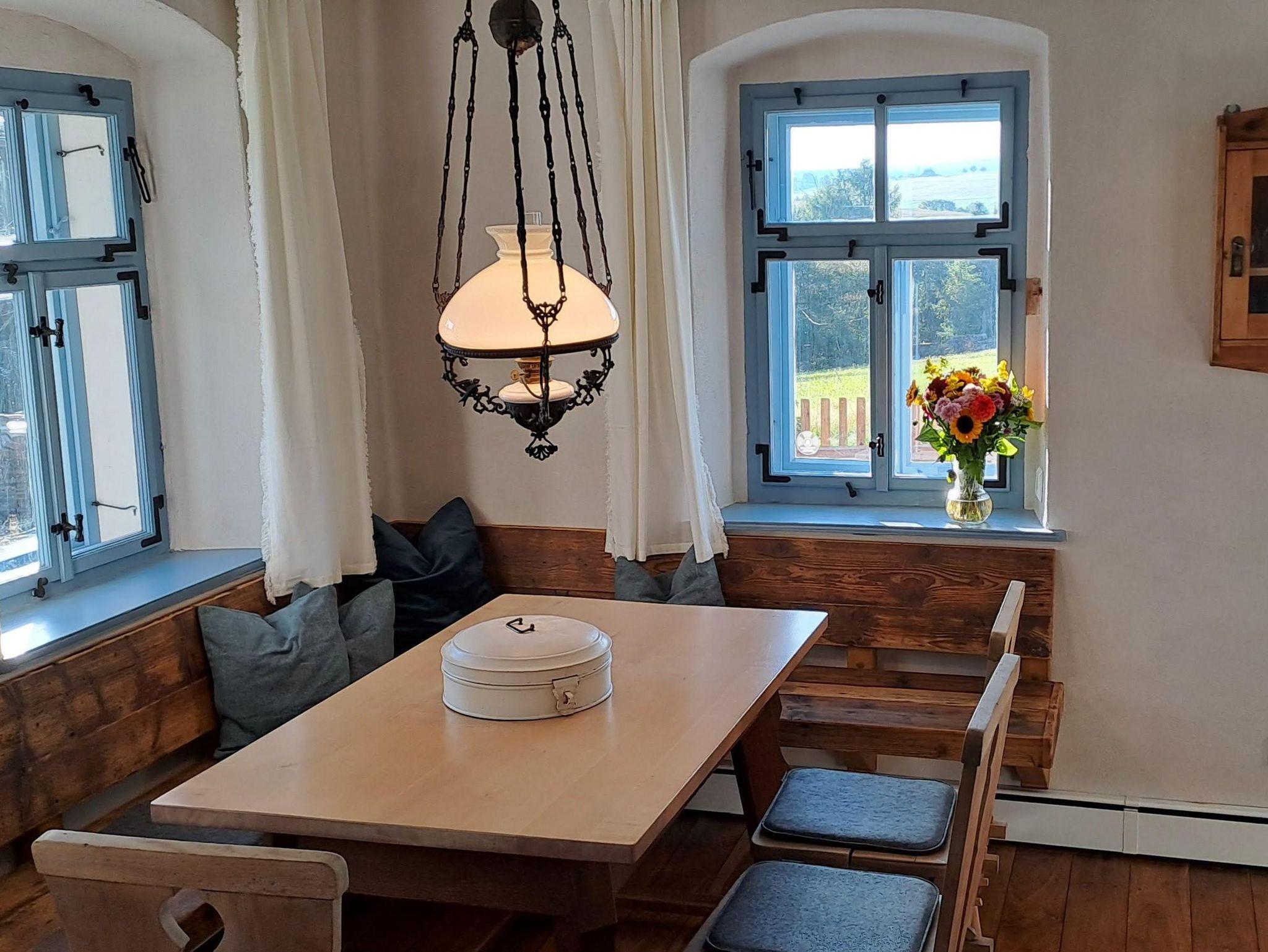 Gleich neben der hellen, modernen und voll ausgestatteten Küche mit wunderschönem, historischem Kachelofen, befindet sich das Esszimmer mit zweitem Ofen und urgemütlichen Sitzgelegenheiten. Außerdem gibt es hier einen Lesesessel neben dem Bücherregal.