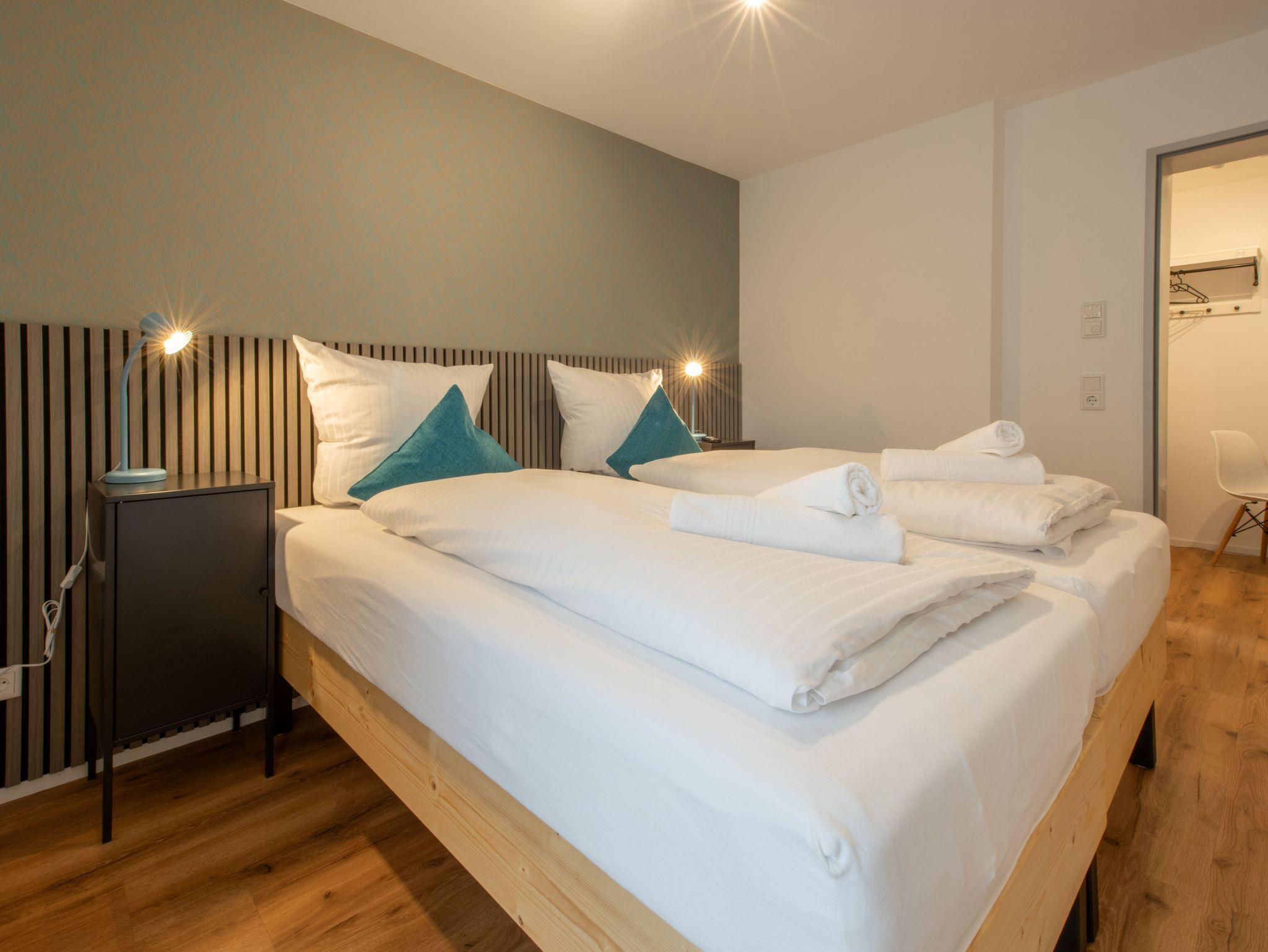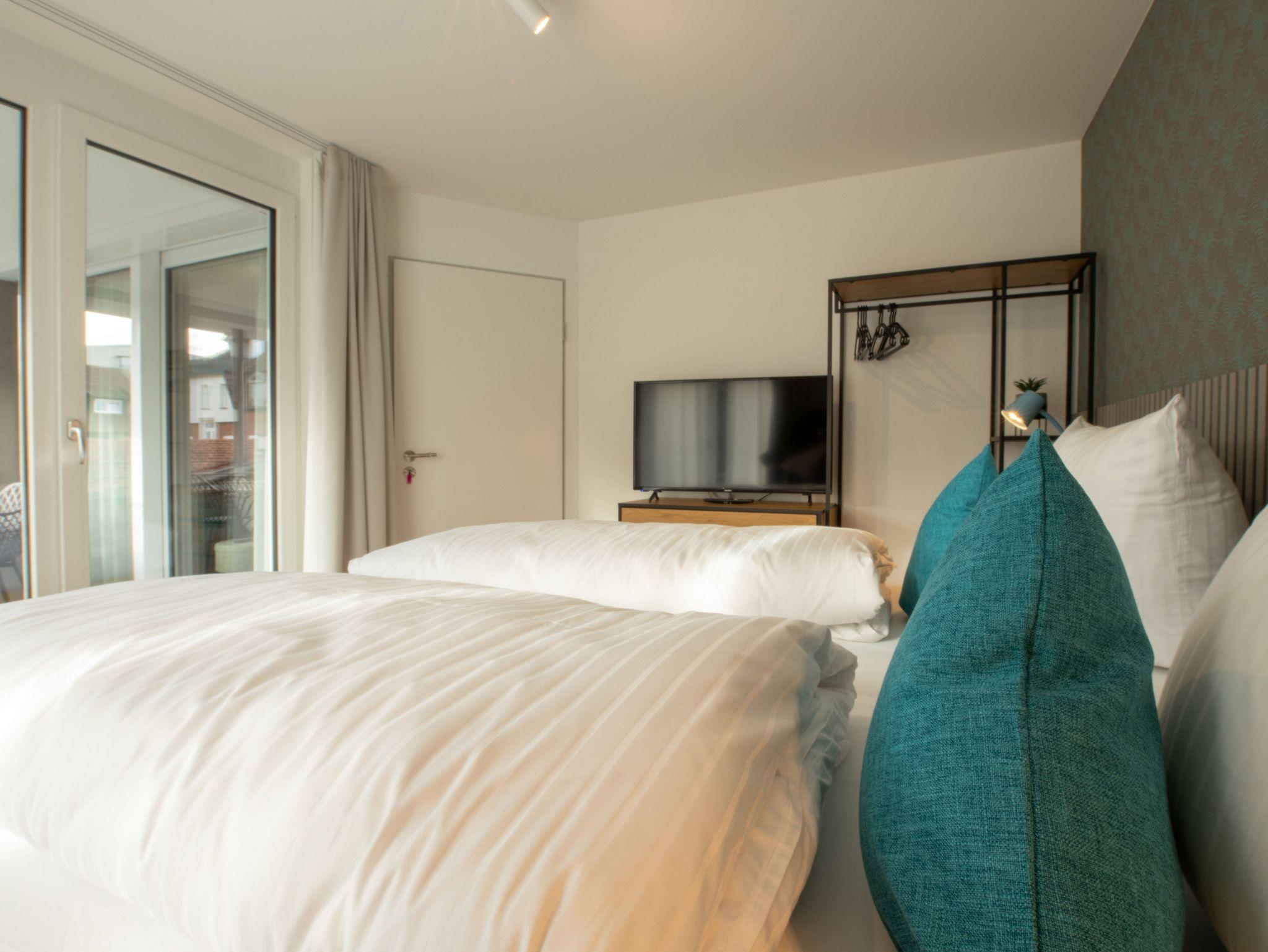 Apartment 4: Der große Flur mit Garderobe, Spiegel, Kommode und viel Platz für Koffer, Kinderwagen, Rollator oder Rollstuhl teilt das Apartment in die verschiedenen Zimmer. Zimmer 1: Das nach Süden ausgerichtete Schlafzimmer mit großem Fenster und Zugang zur Terrasse ist ausgestattet mit einem Doppelbett (180x200 cm), Flachbild TV und Schreibtisch. Kommode und Garderobe bieten genügend Platz für Ihr Gepäck. Zimmer 2: Das zweite, nach Westen ausgerichtete Schlafzimmer mit französischem Balkon, ist ausgestattet mit einem Doppelbett (180x200 cm) und Flachbild TV. Zudem gibt es hier einen großen Kleiderschrank für viel Gepäck. Der große Wohn-Essbereich bietet viel Platz für die ganze Familie. Ein Schlafsofa, direkt am Fenster, lädt ein zu lesen oder, über den gegenüberliegenden Flachbild TV, etwas zur Ruhe zu kommen. Der große Essbereich, direkt neben der Küche, bietet viel Platz für gemeinschaftliches Essen, Spielen oder Arbeiten. Von hier aus gelangen Sie über eine Schiebetüre auf die große, überdachte Terrasse, welche, vor allem in den Sommermonaten, zum Verweilen einlädt. Genießen Sie die Ruhe der Seitenstraße bei einem Glas Wein und die Sicht in das kleinstädtische Grün.