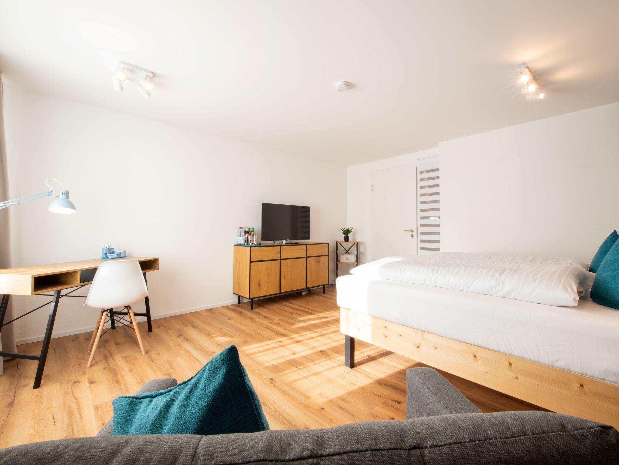Apartment 3: Der Eingangsbereich des Apartments ist der Dreh- und Angelpunkt der Wohnung. Hier befindet sich direkt die große Garderobe mit Spiegel, die lange Küchenzeile sowie der geräumige Essplatz. Von hier aus gelangen Sie auch direkt in das Badezimmer und in den, mit einer Glaswand abgetrennten, lichtdurchfluteten Wohn-Schlafbereich. Der nach Süden ausgerichtete Wohn-Schlafbereich ist das Herzstück dieser Wohnung. Der große Raum mit vielen Fenstern bietet ein komfortables Doppelbett (180x200 cm). Ein Schlafsessel mit Leseecke am Fenster verschafft dem gemütlichen Raum ein besonderes Wohnzimmerflair. Ein großer Flachbild TV an der Wand gegenüber lädt ein für gemütliche Abende. Zum Stöbern des Markdorfer Stadtplans oder auch mal zum Arbeiten bietet der komfortable Schreibtisch genug Platz.