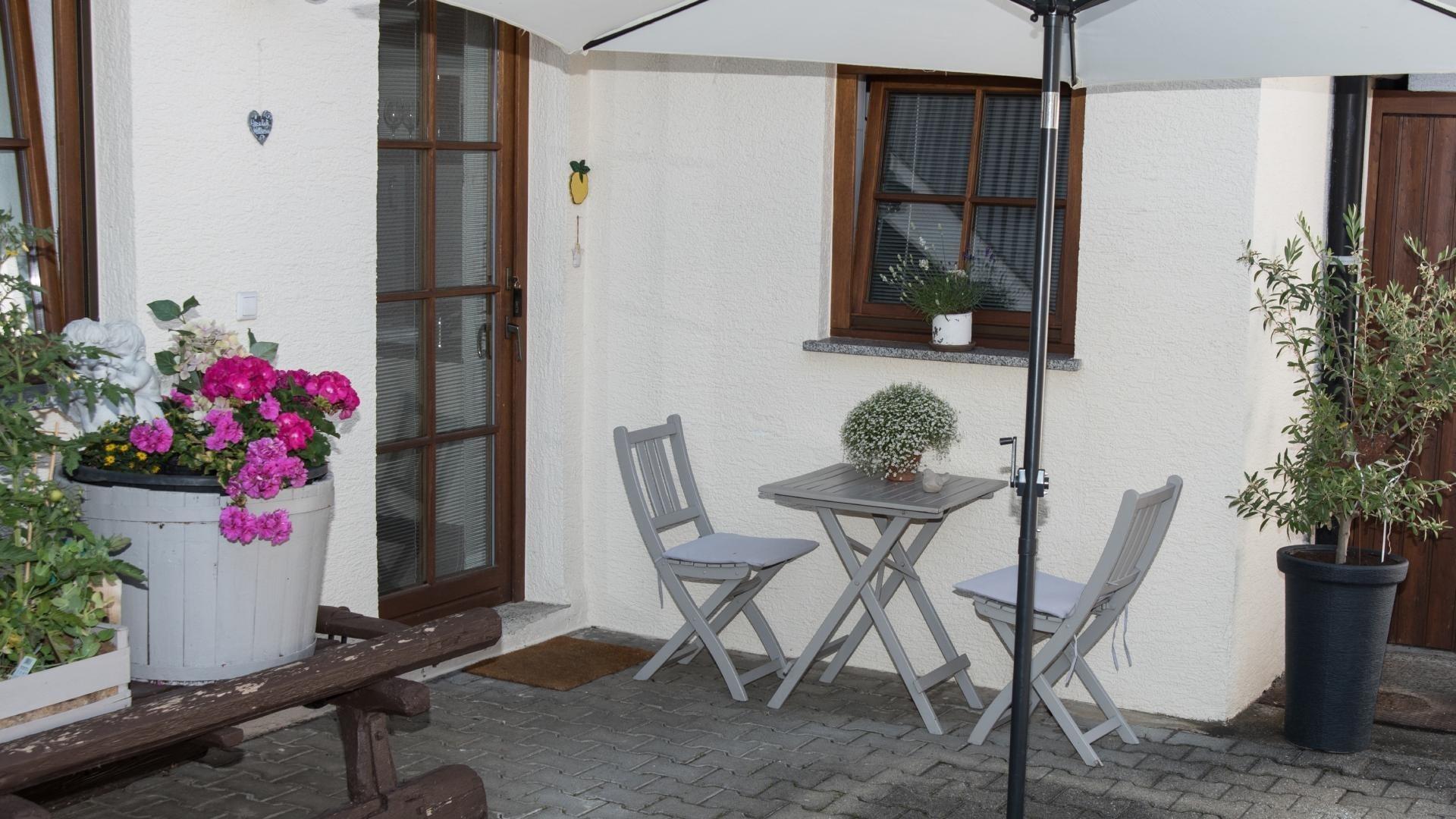 Kleine, feine Ferienwohnung für 2 Personen mit kombiniertem Wohn-/Schlafraum und Kochecke, Badezimmer mit Dusche, WC, Föhn, Handtuchwärmer und Kosmetikspiegel, Kleine Singleküche mit Kühl- und Gefrierkombination, Plattenherd, Wasser-/Eierkocher, Kaffeemaschine, Toaster, Ausblick zum hinteren Innenhof, Richtung Hofladen, Möblierter Freisitz mit Sonnenschirm, Lage: EG