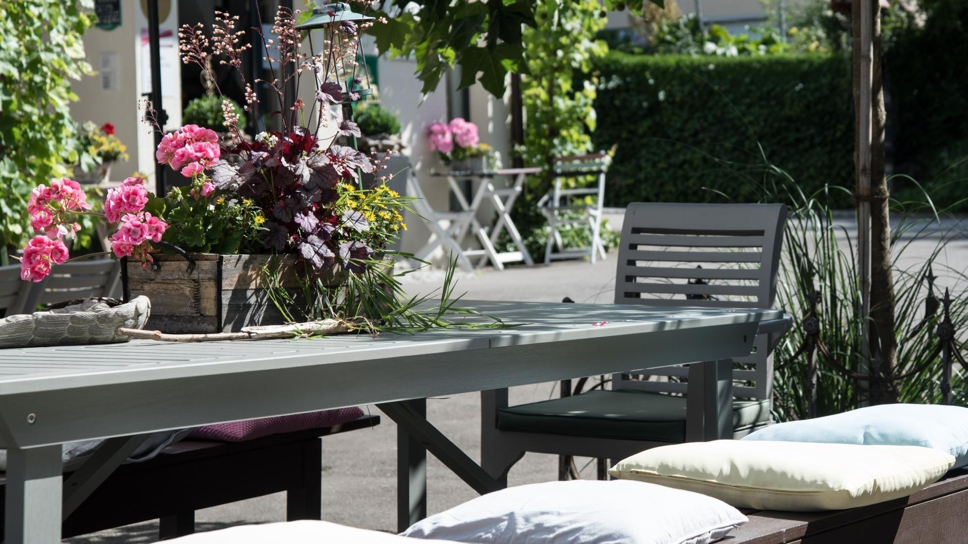 • Möblierter Freisitz mit Sonnenschirm