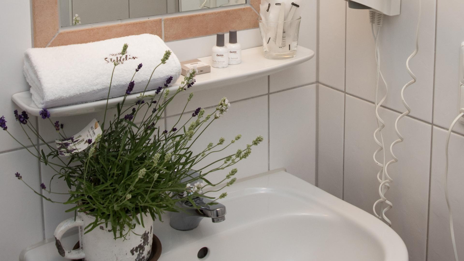 • Badezimmer mit Dusche, WC, Föhn, Handtuchwärmer und Kosmetikspiegel