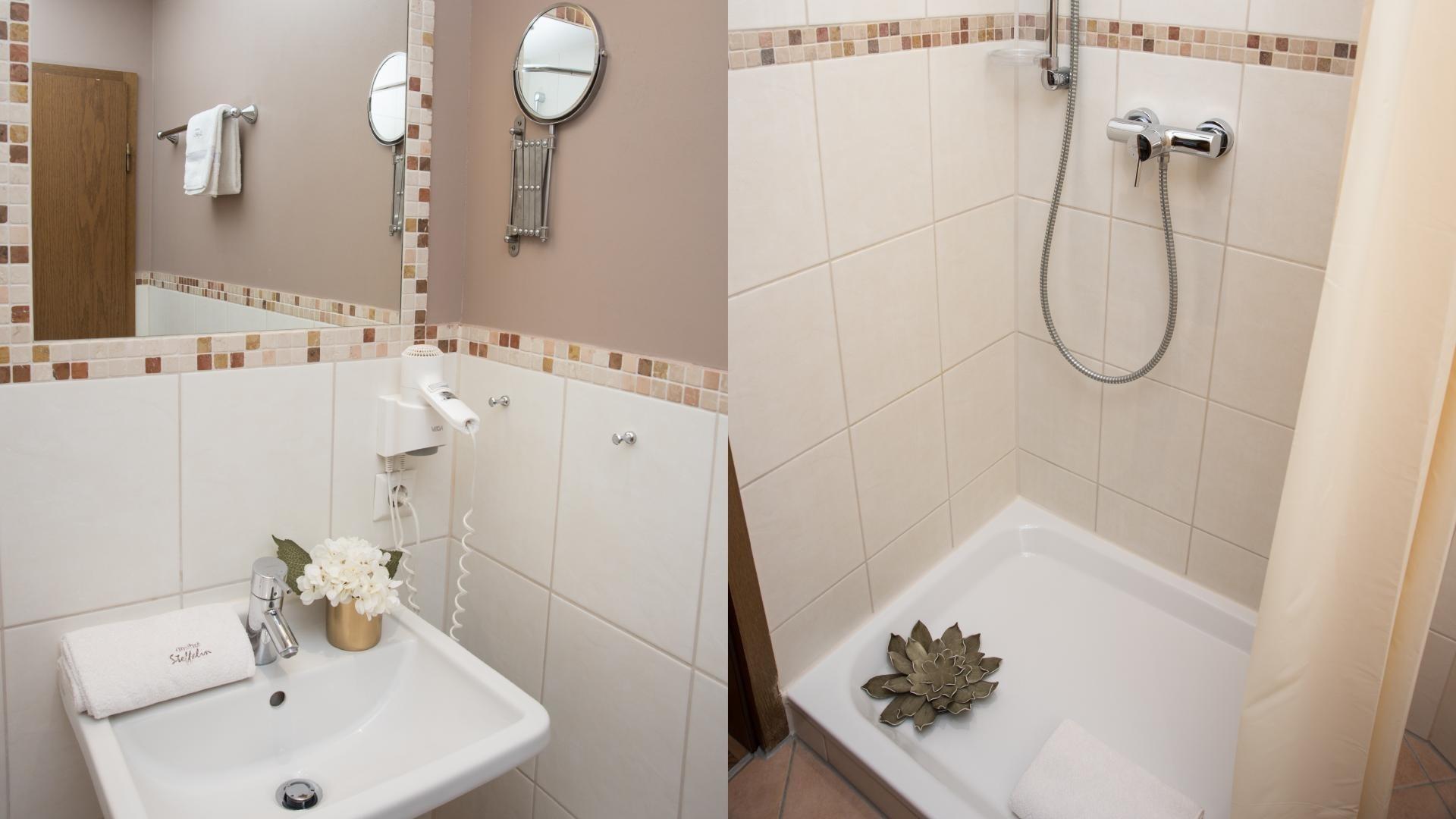 • Badezimmer mit Dusche, WC, Föhn und Kosmetikspiegel