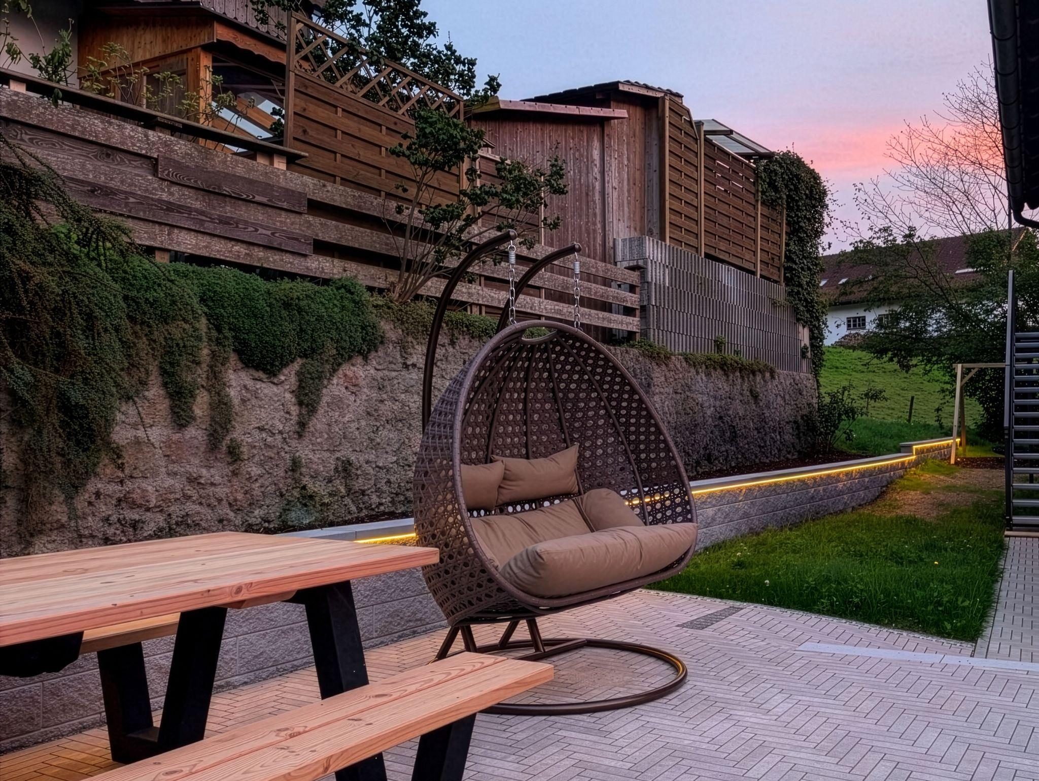 Den Gästen beider Ferienwohnungen steht die gemütliche Terrasse zur Verfügung, die zum Verweilen und Entspannen einlädt. Dort erwarten euch ein großer Picknicktisch für gemeinsame Mahlzeiten im Freien und ein bequemer Hängesessel für zwei Personen – perfekt, um die frische Bergluft und die ruhige Atmosphäre zu genießen.