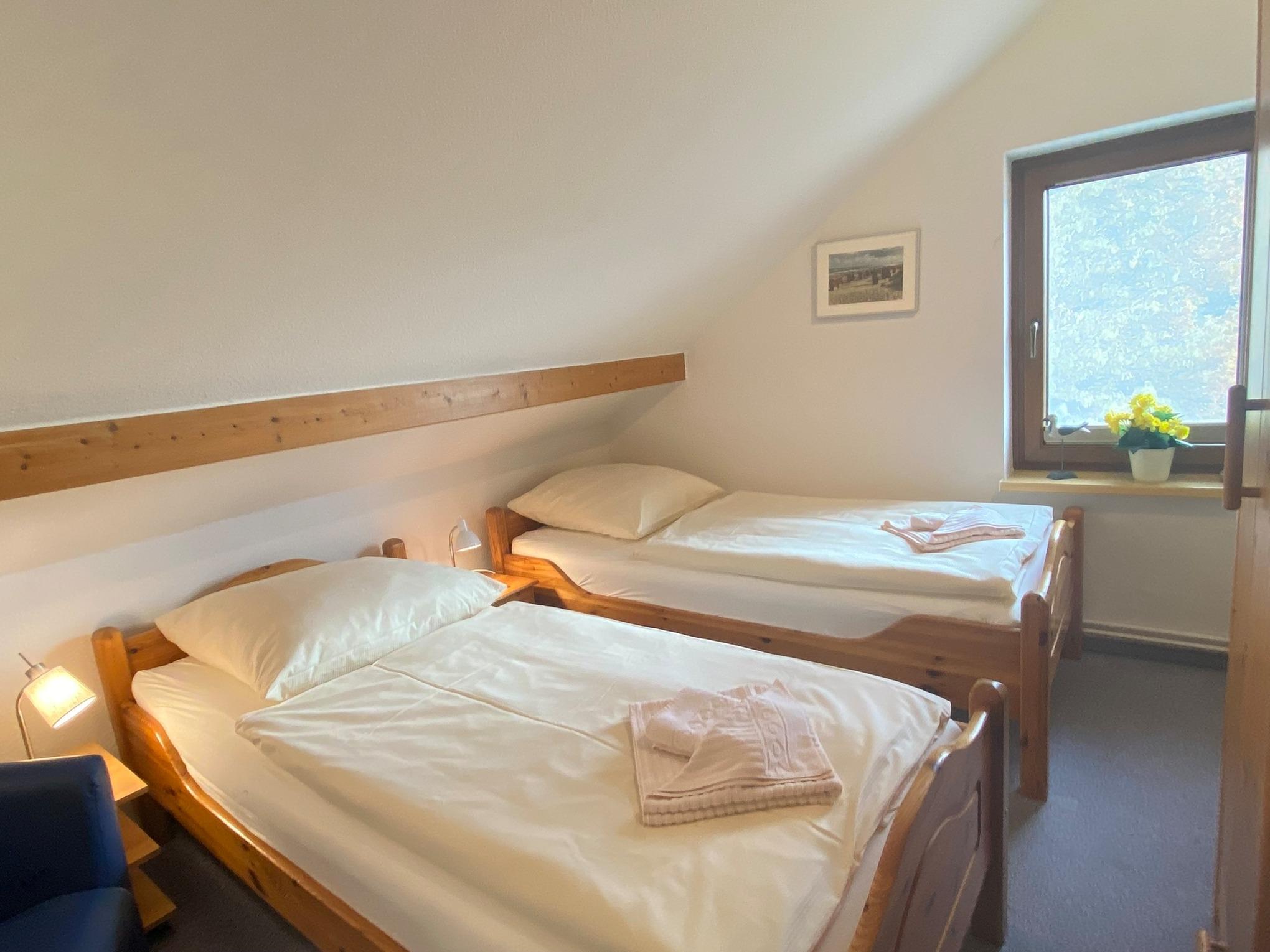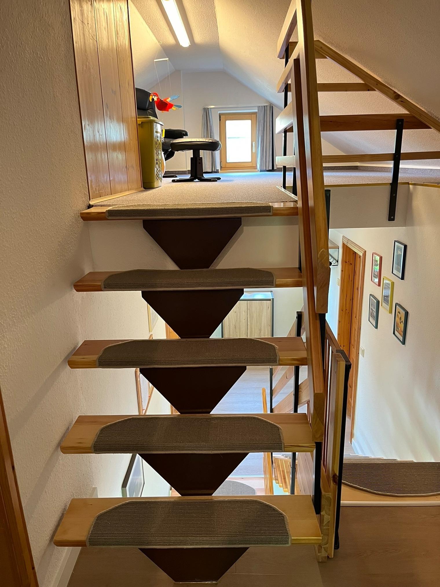 Von der Diele aus erreicht man über eine bequeme Treppe den großzügigen Wohnraum mit der Küche in der unteren Ebene mit dem Ausgang zur großen Terrasse. Zwei weiter Schlafzimmer mit je 2 Einzelbetten sind im Obergeschoß angeordnet. Das Dachgeschoß ist zu einem Spielboden ausgebaut.
