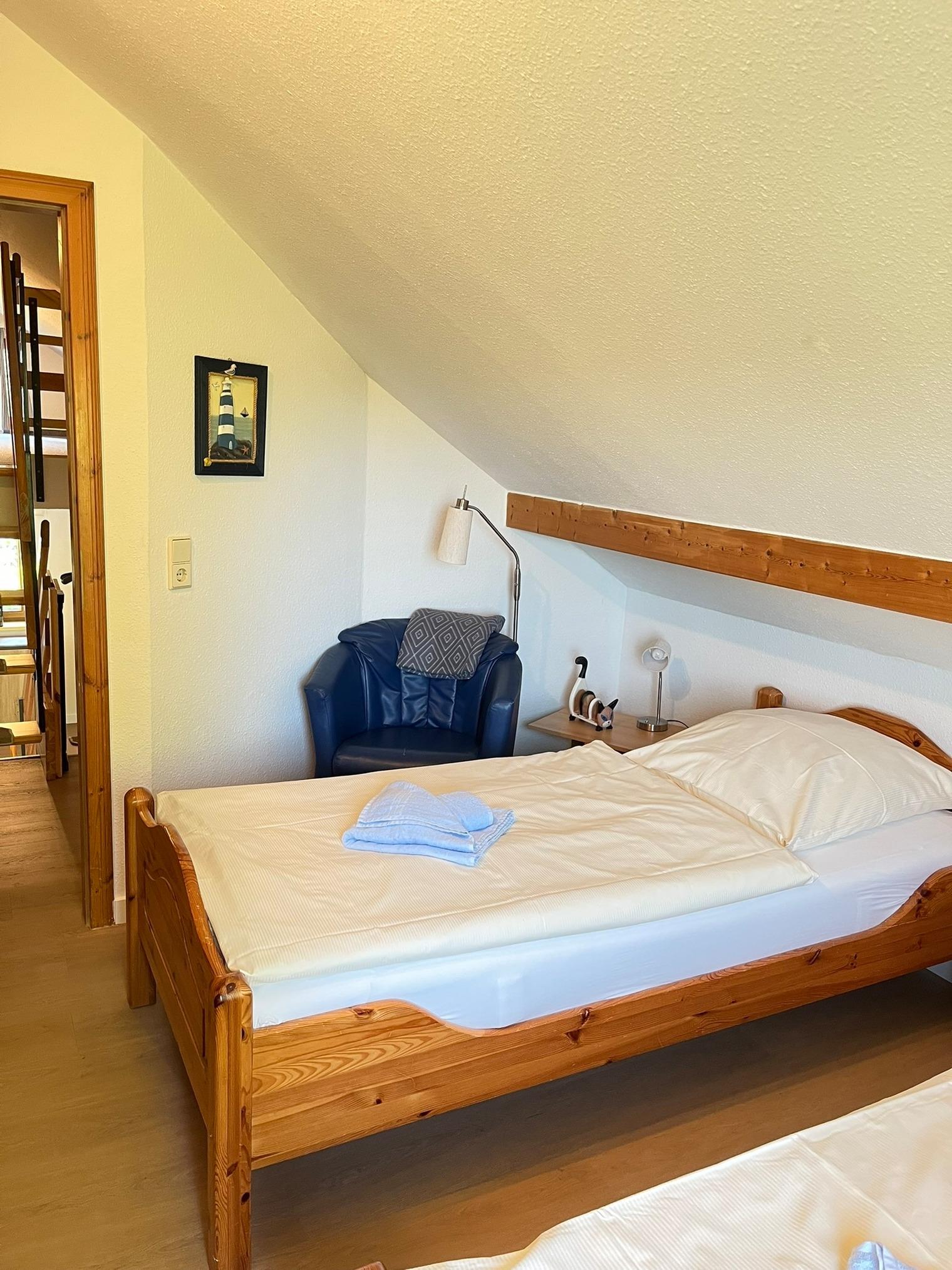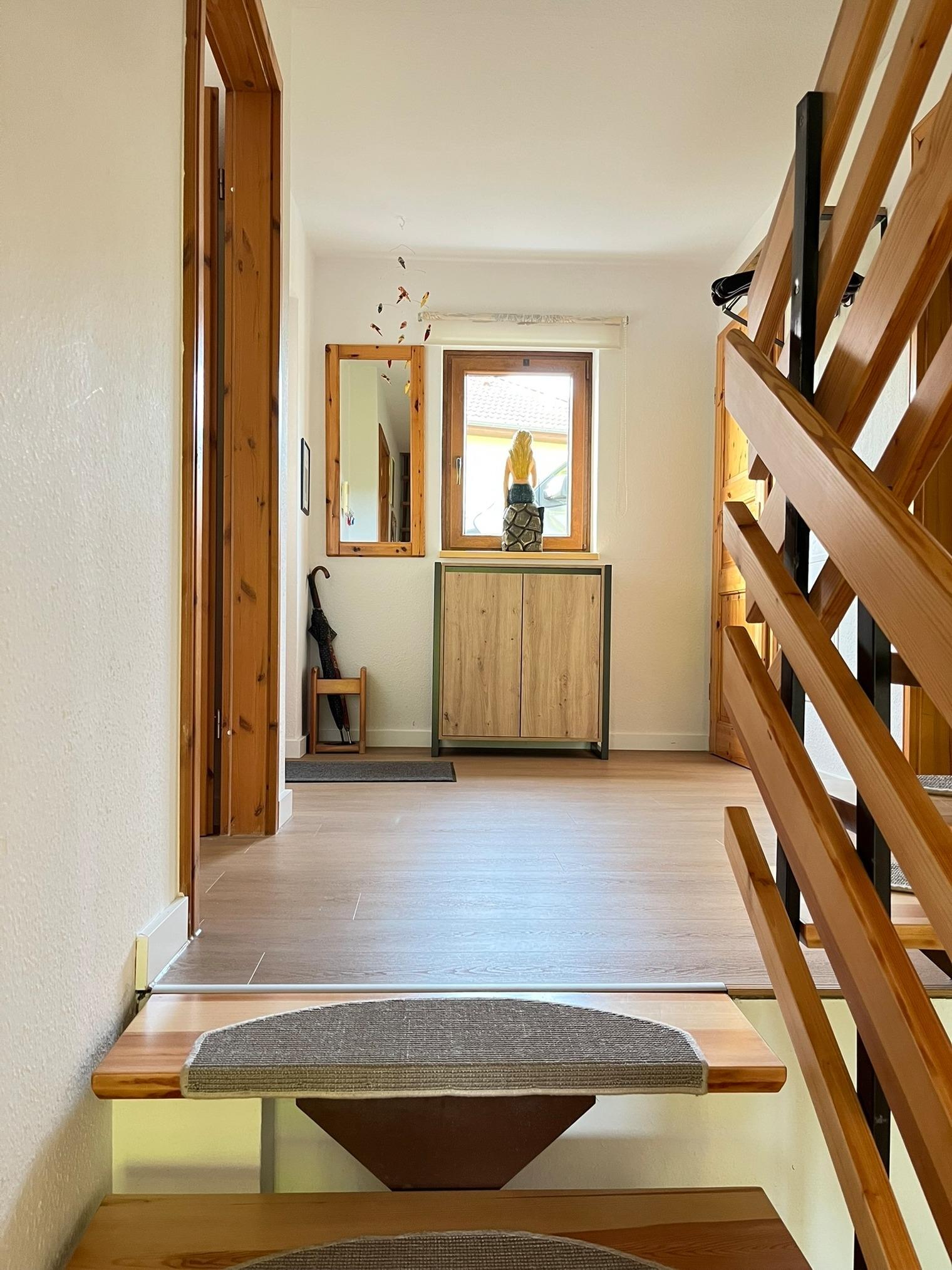 Der Eingangsbereich mit Diele befindet sich in der mittleren Ebene. Hier befinden sich 1 Schlafraum mit Doppelbett, DU/WC und ein Gäste-WC.
