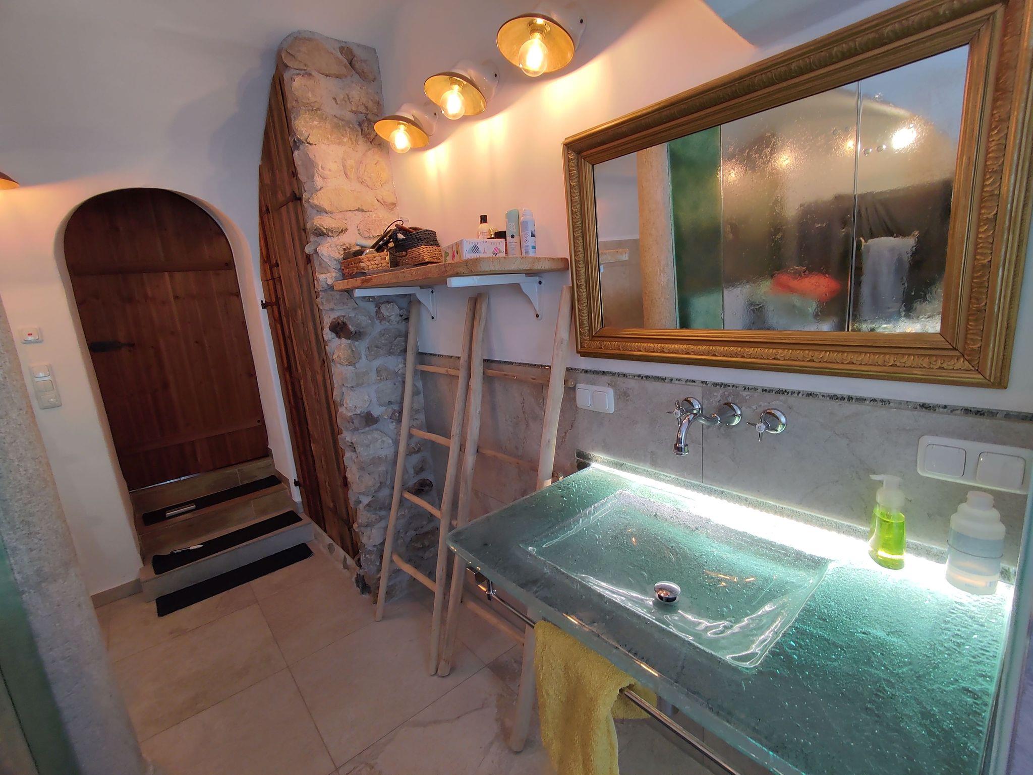 Das große künstlerisch gestaltete neue Ferienzimmer Hochlerch mit Panoramabergblick, mit Kamin und Sitzecke befindet sich im Obergeschoss. Sehr gut auch für Langzeitaufenthalte geeignet. Die große gemeinschaftliche gut ausgestattete Küche und das neue große aufwendig eingerichtete gemeinschaftliche Bad in einem mittelalterlichen Gewölbe befinden sich im Erdgeschoß.