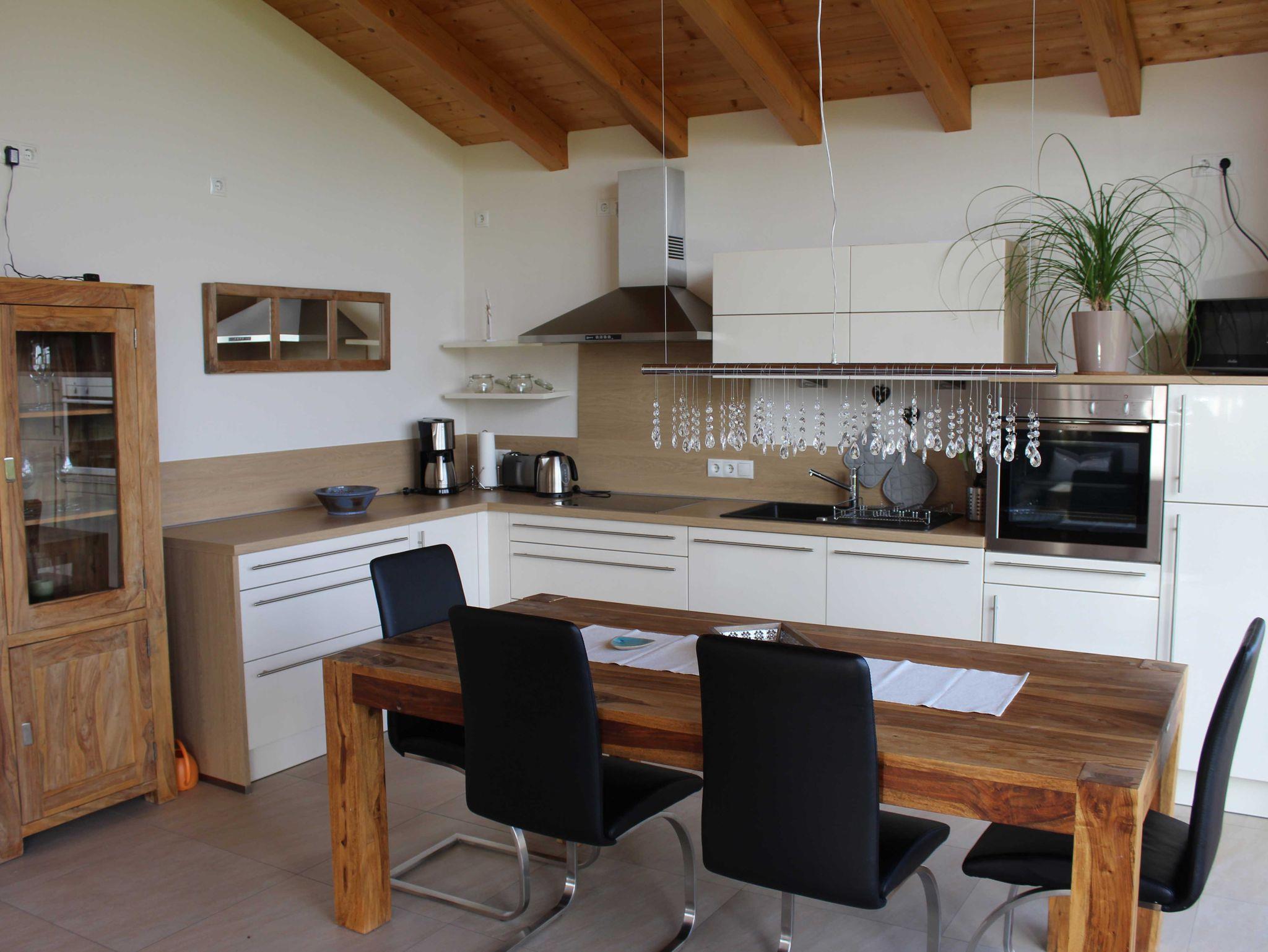 Große helle Zimmer mit schönen Holzdielenböden. Neue Küche mit Geschirrspülmaschine, Backofen, Herd, Dunstabzug, Kühlschrank und Gefrierfach mit großem Esstisch und Stühlen.