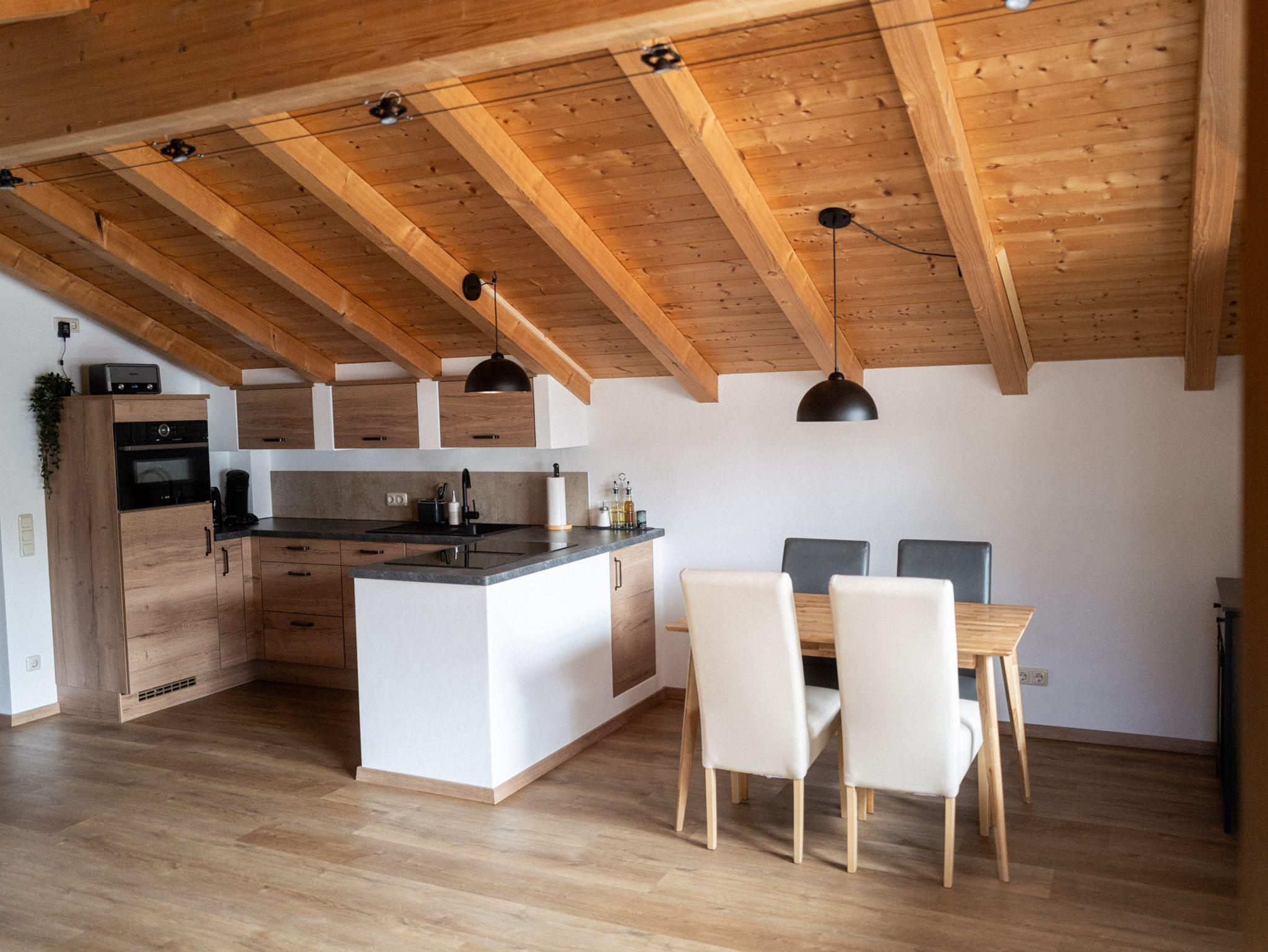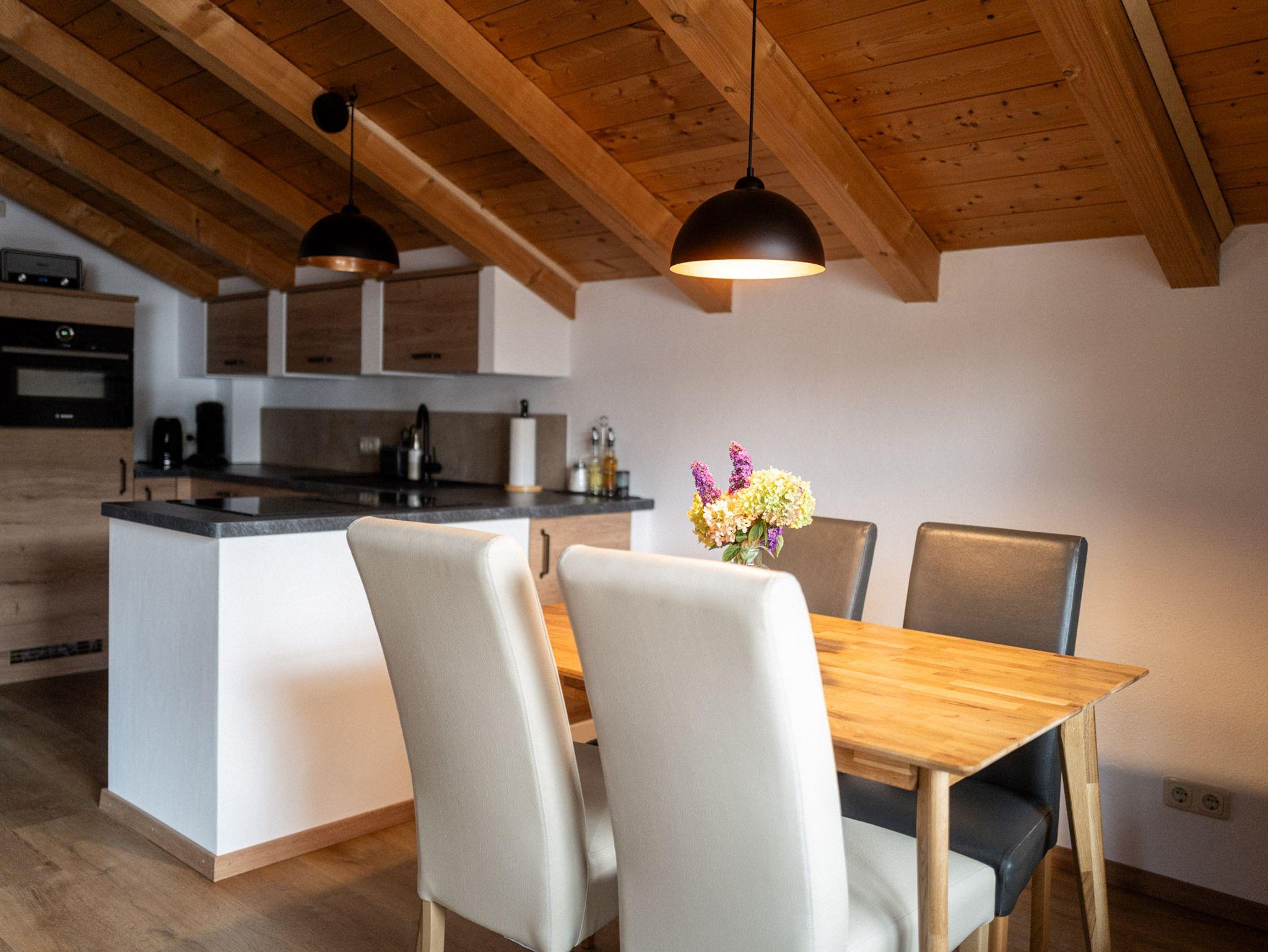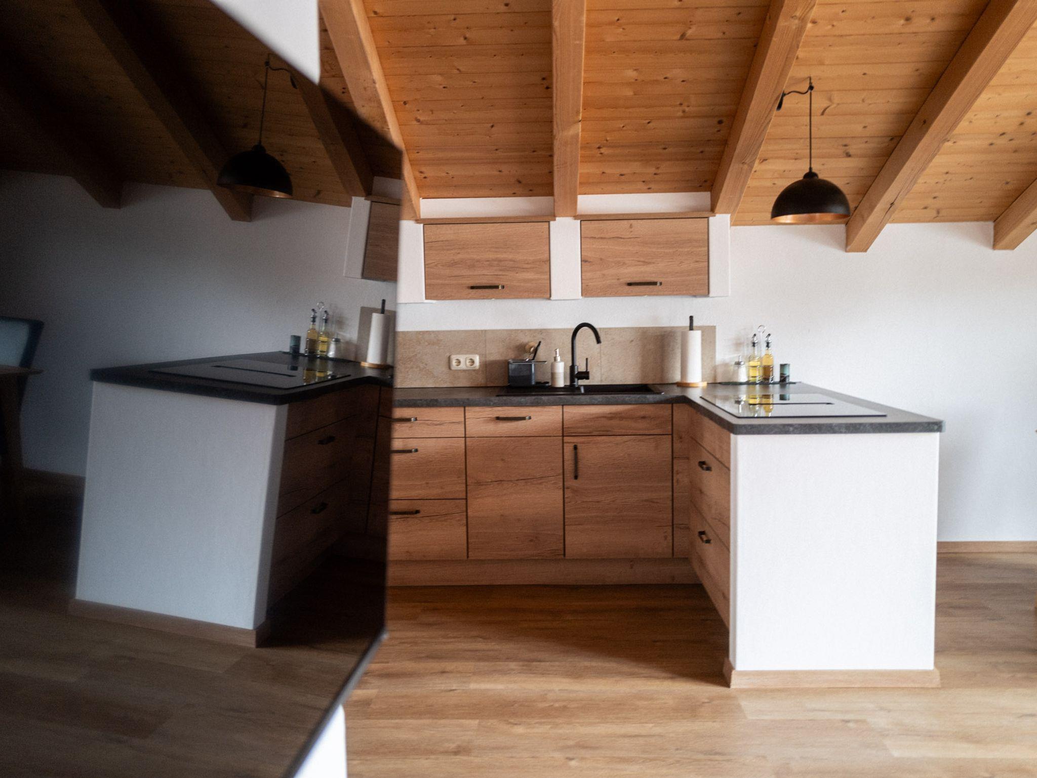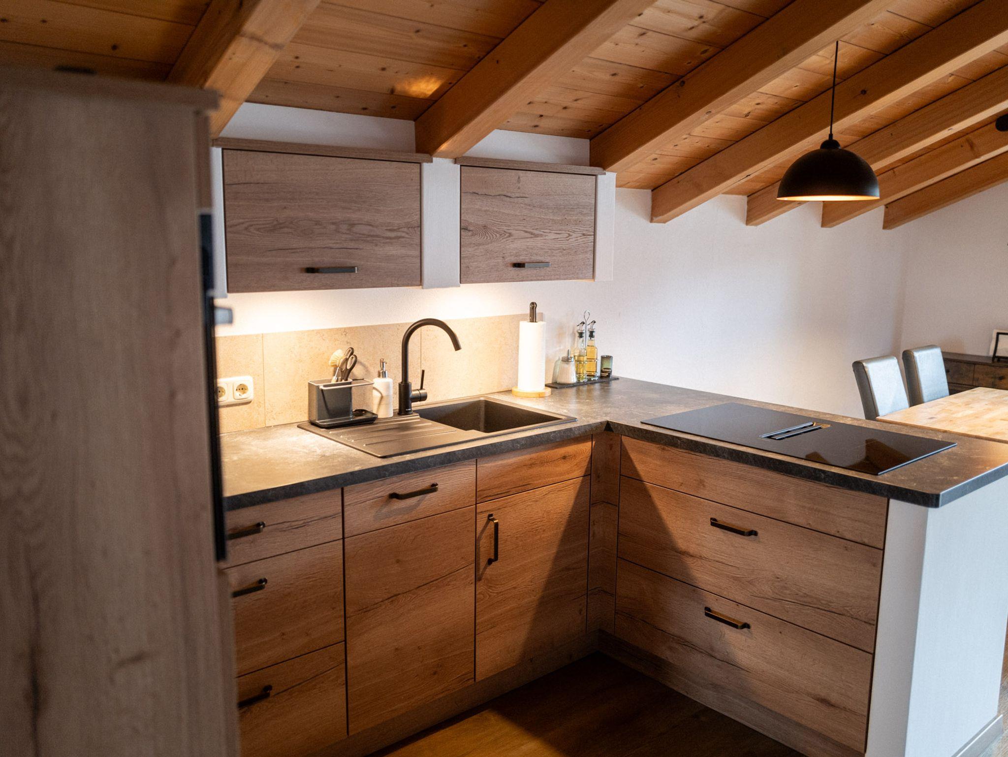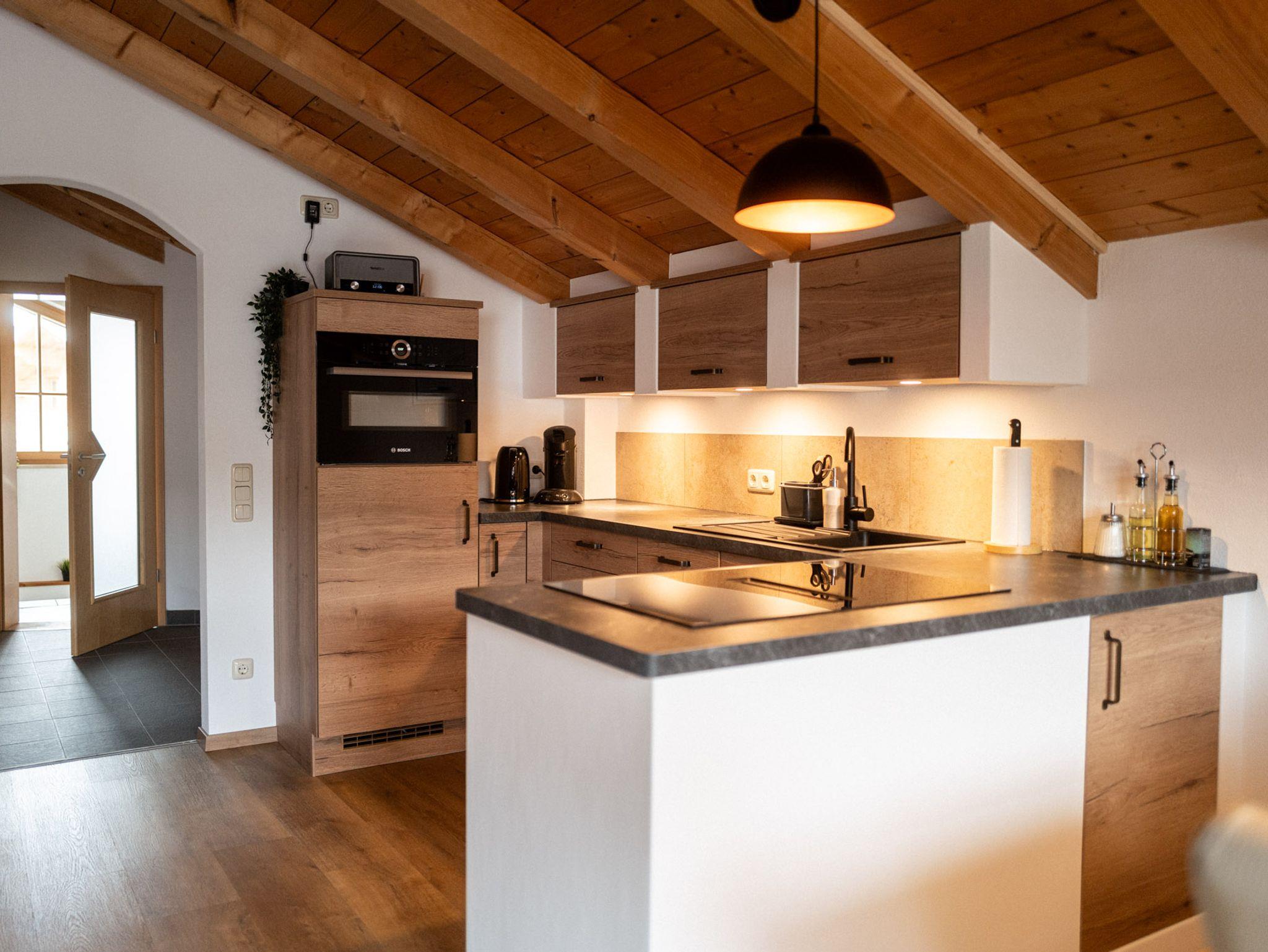 Die neue, voll ausgestattete Küche lädt dazu ein, gemütliche Mahlzeiten in der Wohnung zu genießen. Das Schlafzimmer verfügt über ein komfortables Doppelbett sowie eine zusätzliche Schlafcouch, ideal für Familien oder Paare. Genießen Sie hier die entspannte Atmosphäre und fühlen Sie sich wie zuhause – in der Ferienwohnung Achentaler Alpentor wird es Ihnen an nichts fehlen!