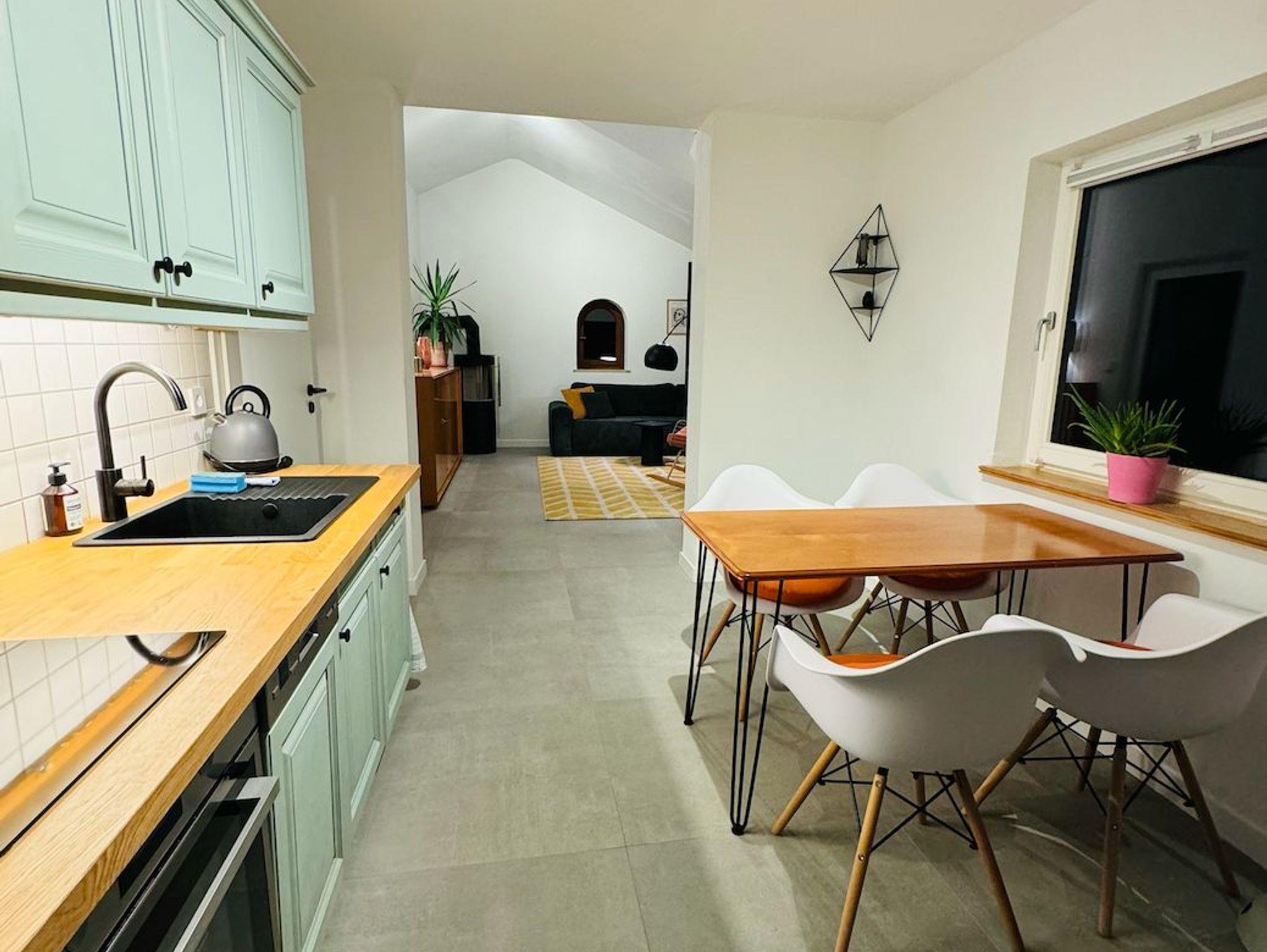 Voll ausgestattete Küche: Die Küche ist komplett funktional mit Herd, Ofen, Esstisch und allem, was Sie zum Kochen benötigen.